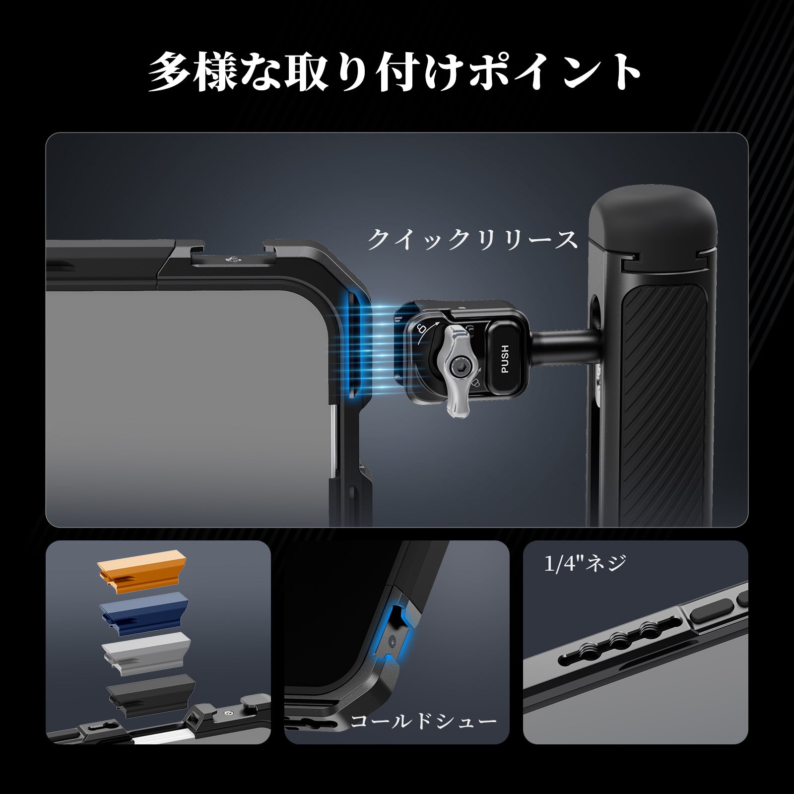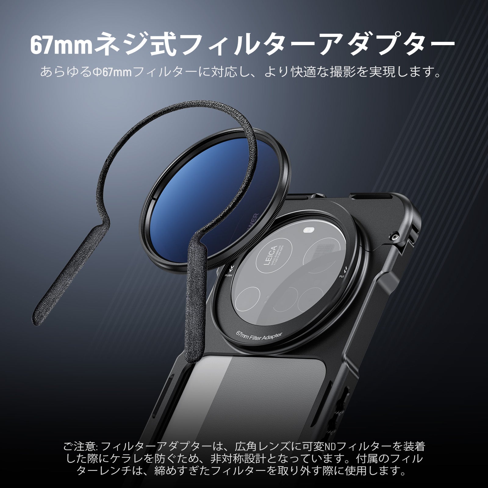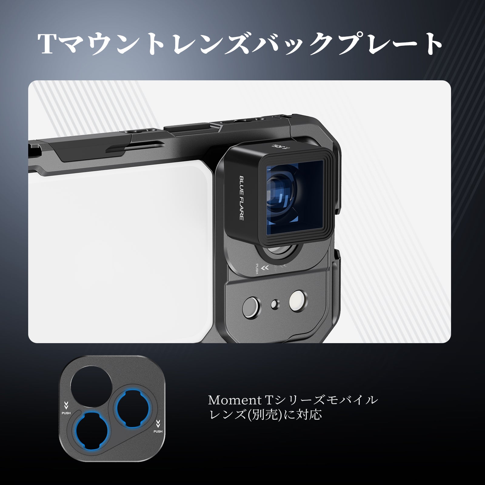 耐衝撃性のあるラバーライニングでスマートフォンを保護しながら、動画撮影、YouTube/TikTokのVlog、ライブ配信、モバイル写真撮影、映画制作などに活躍します。また、フィルターやレンズを装着できる交換式バックプレートが3枚付属しており、無限のクリエイティビティを実現します。