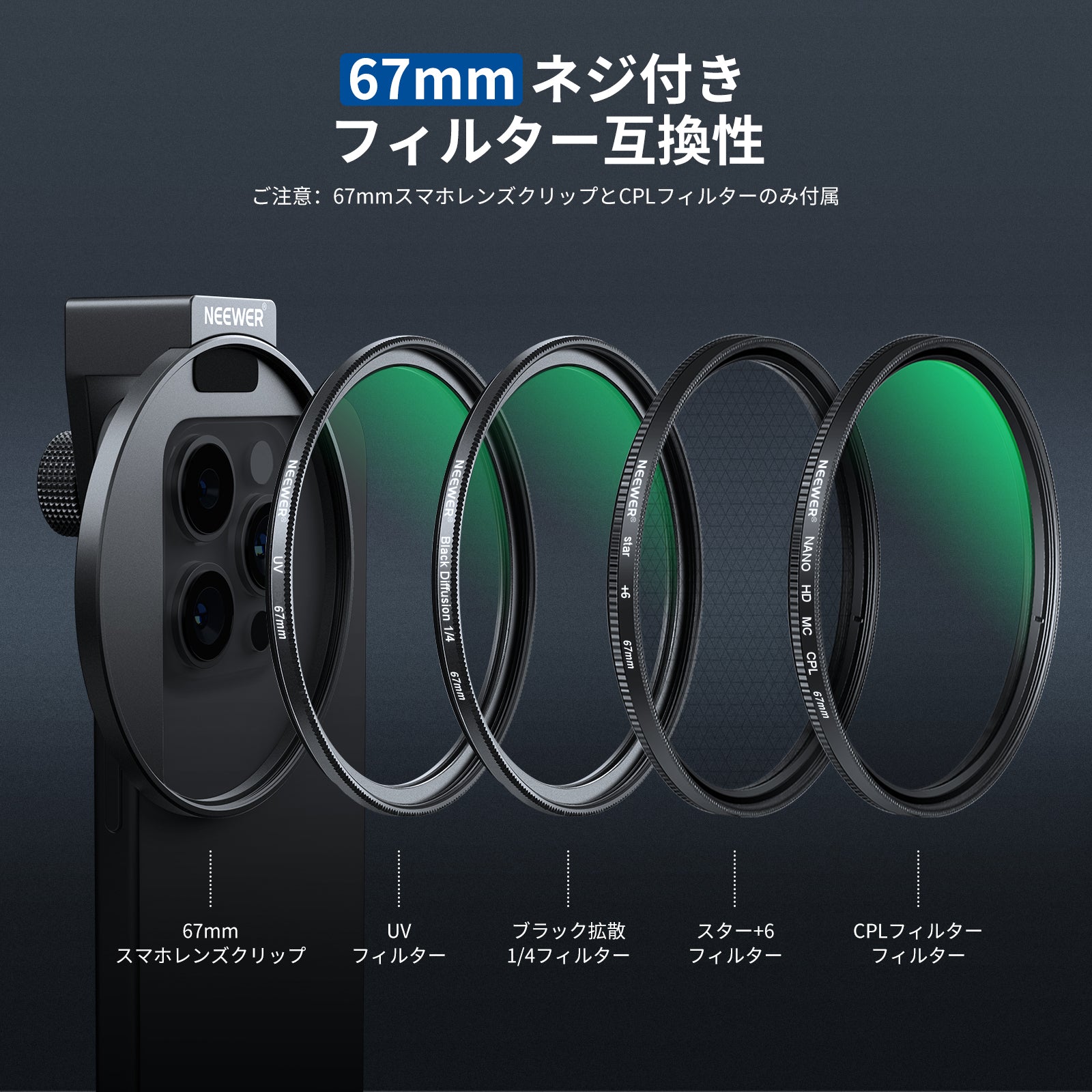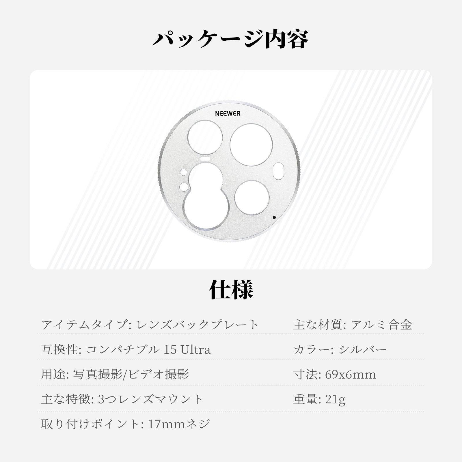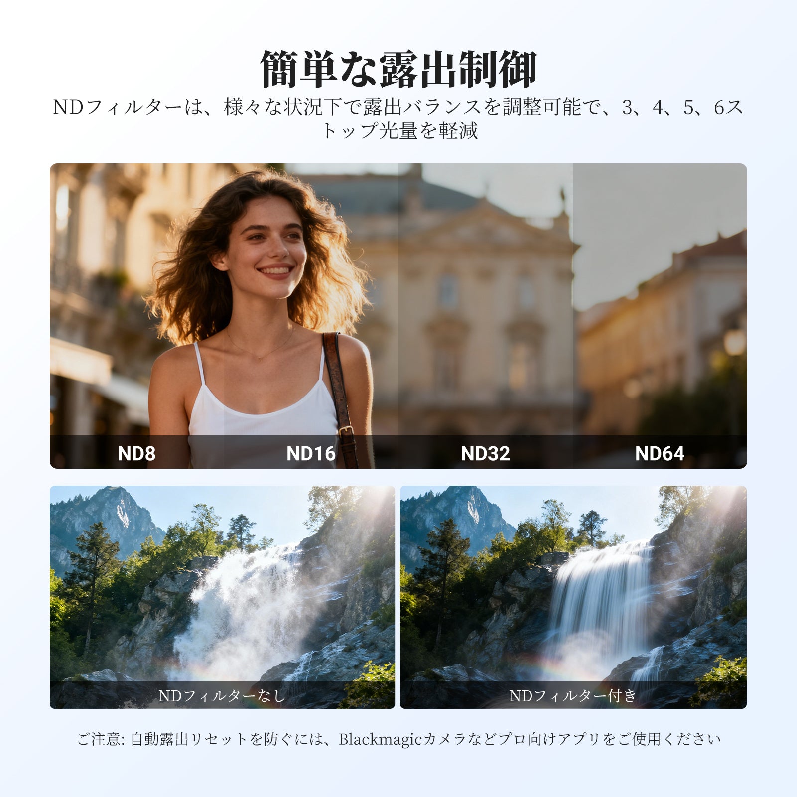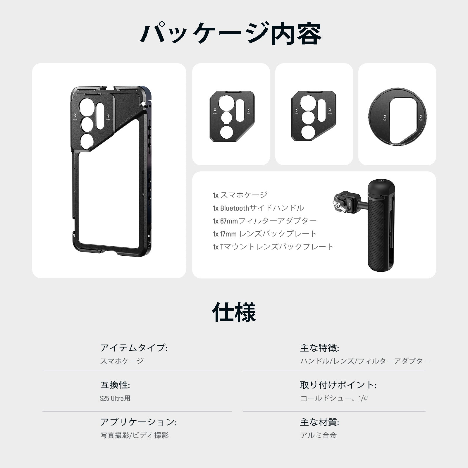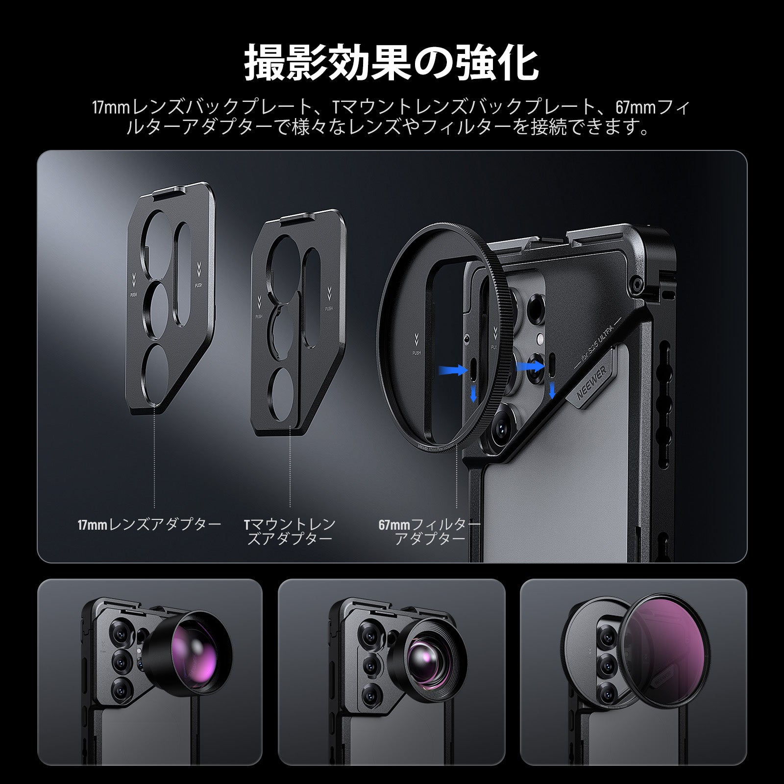耐衝撃性のあるラバーライニングでスマートフォンを保護しながら、動画撮影、YouTube/TikTokのVlog、ライブ配信、モバイル写真撮影、映画制作などに活躍します。また、フィルターやレンズを装着できる交換式バックプレートが3枚付属しており、無限のクリエイティビティを実現します。