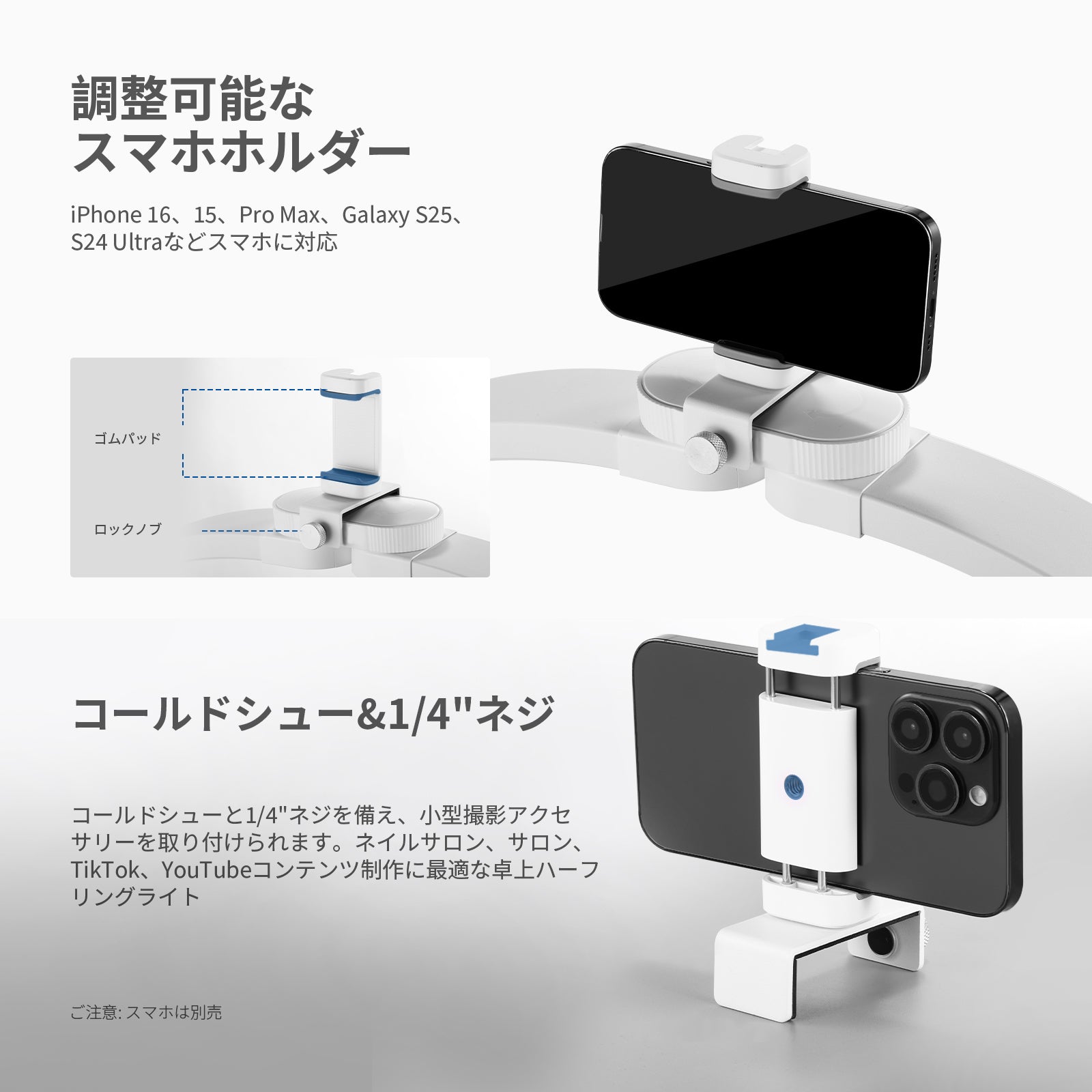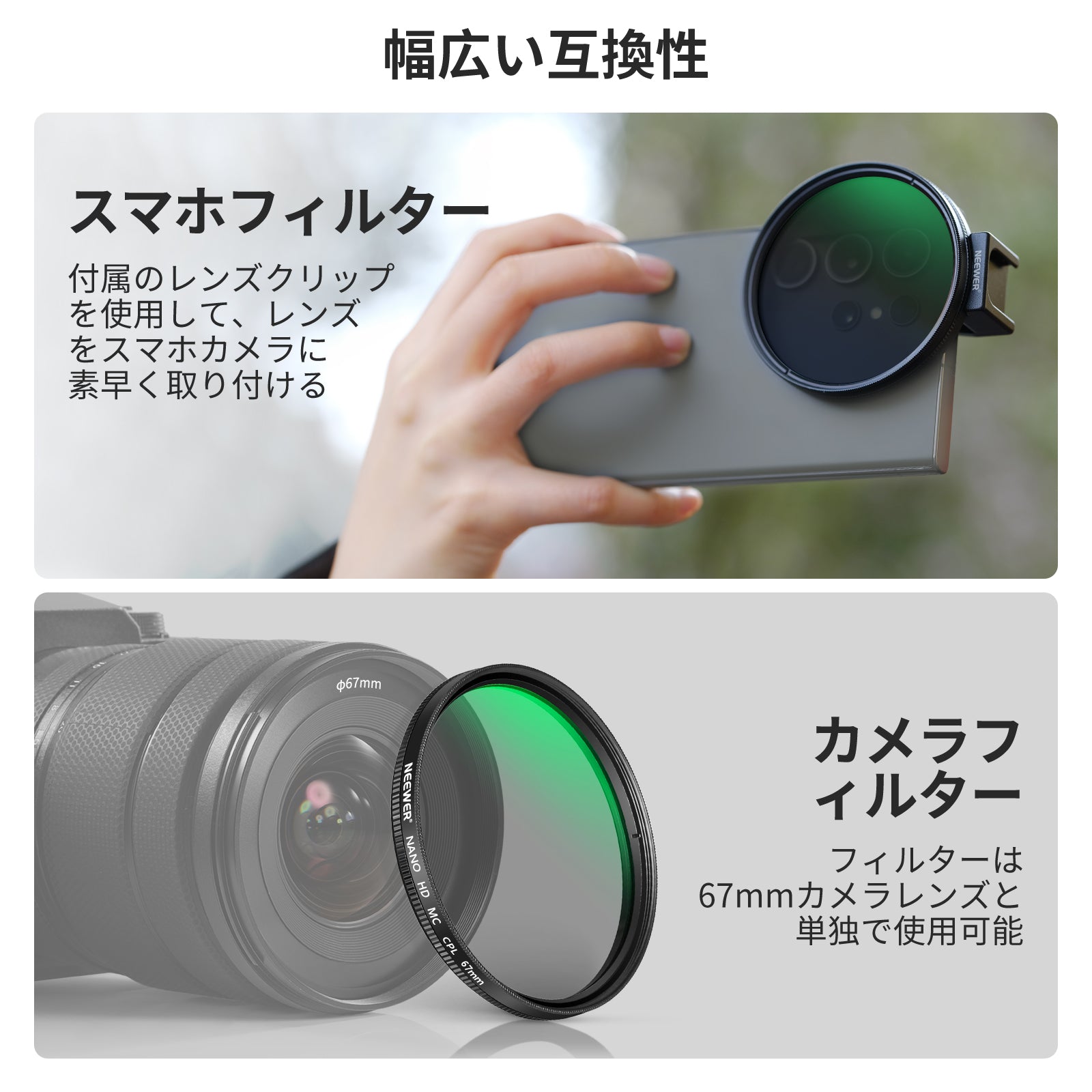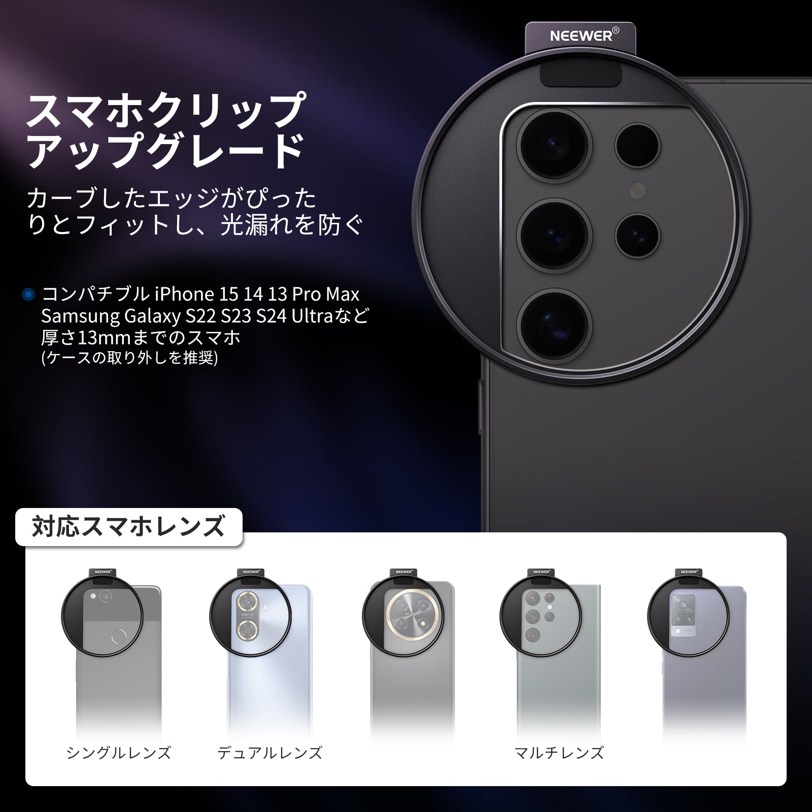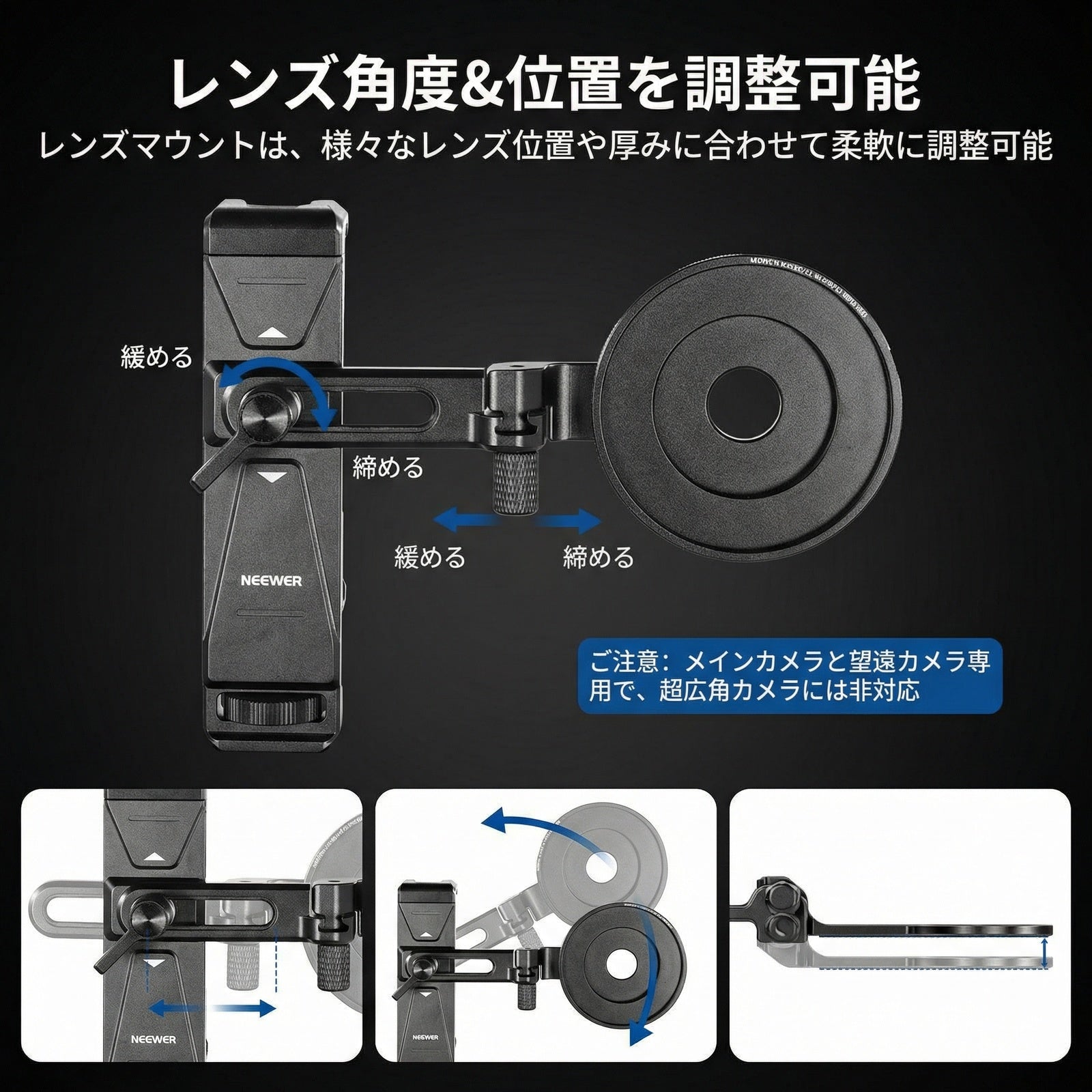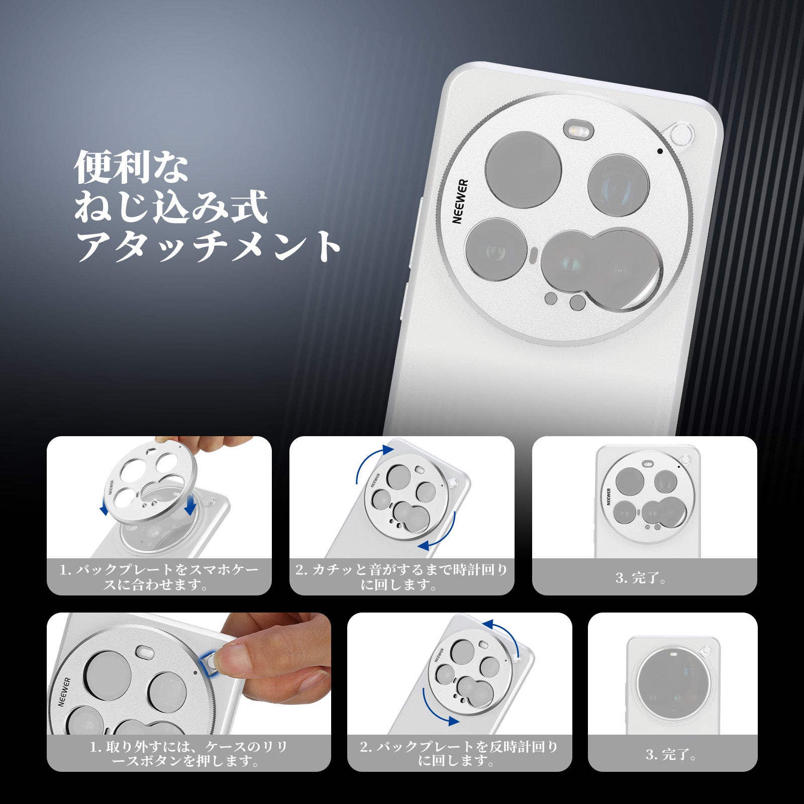 耐衝撃性のあるラバーライニングでスマートフォンを保護しながら、動画撮影、YouTube/TikTokのVlog、ライブ配信、モバイル写真撮影、映画制作などに活躍します。また、フィルターやレンズを装着できる交換式バックプレートが3枚付属しており、無限のクリエイティビティを実現します。