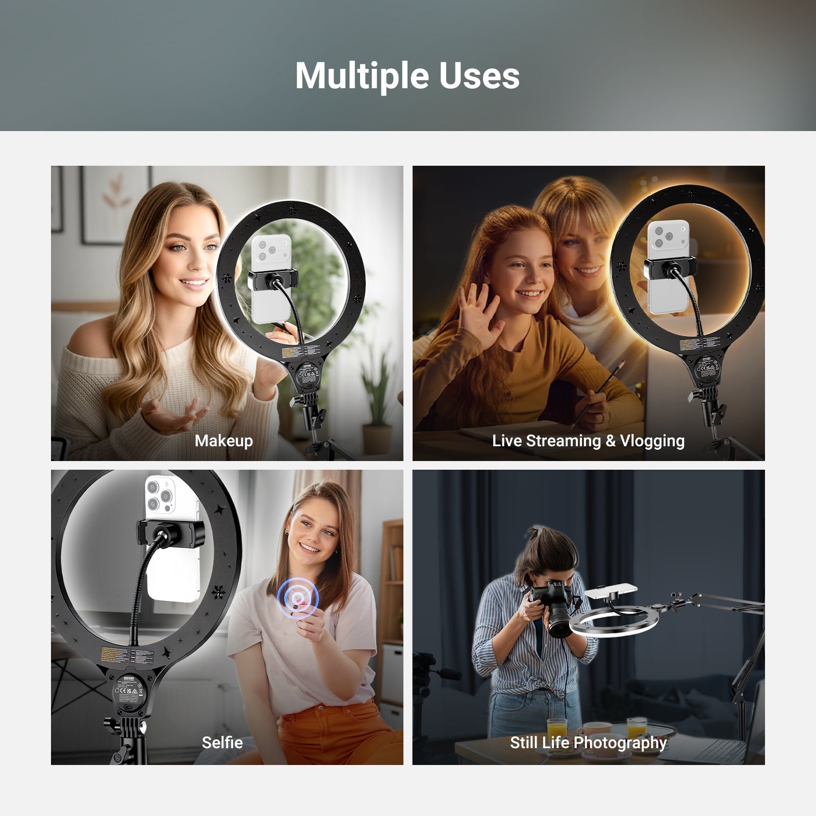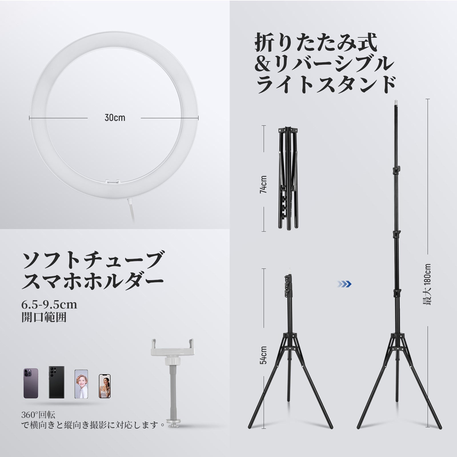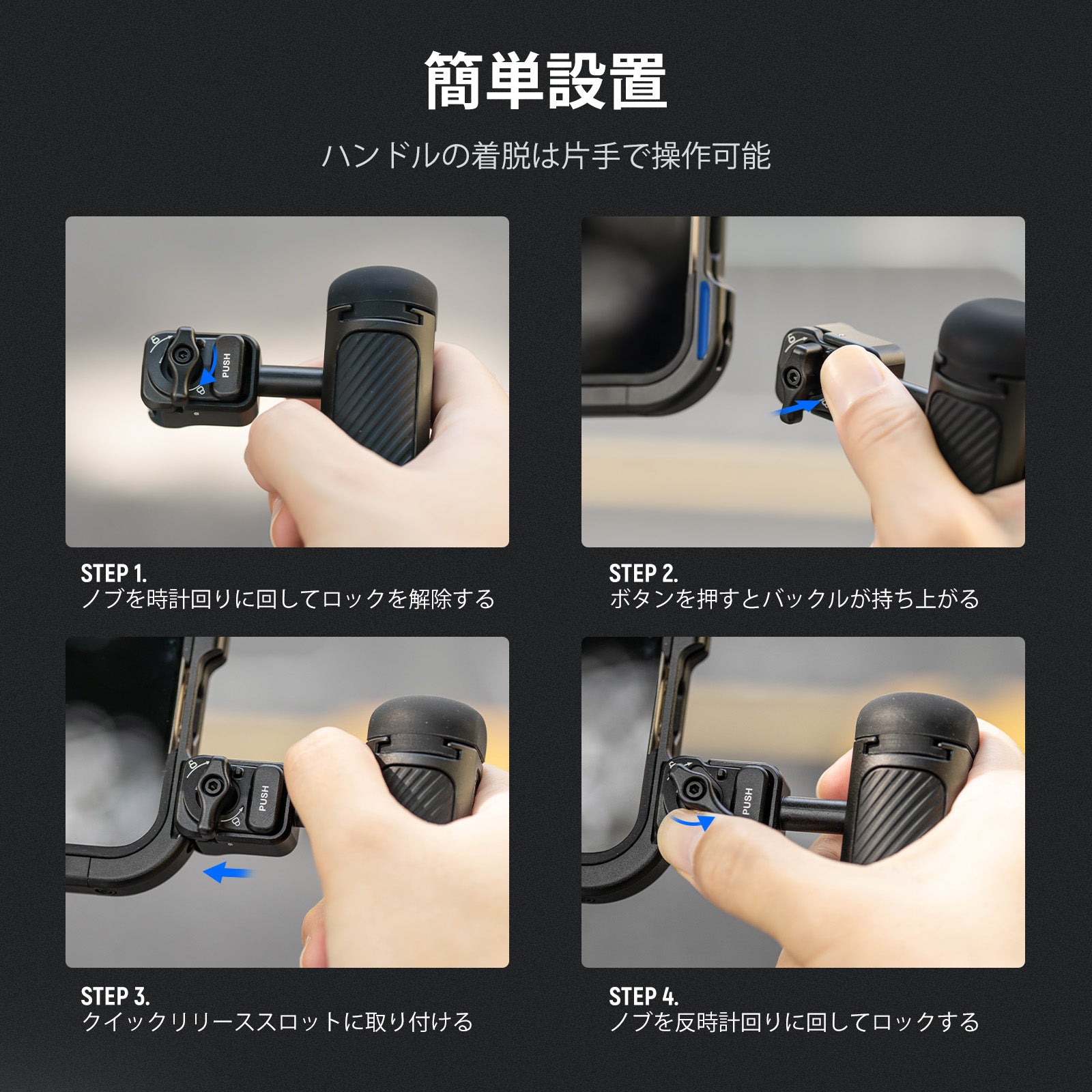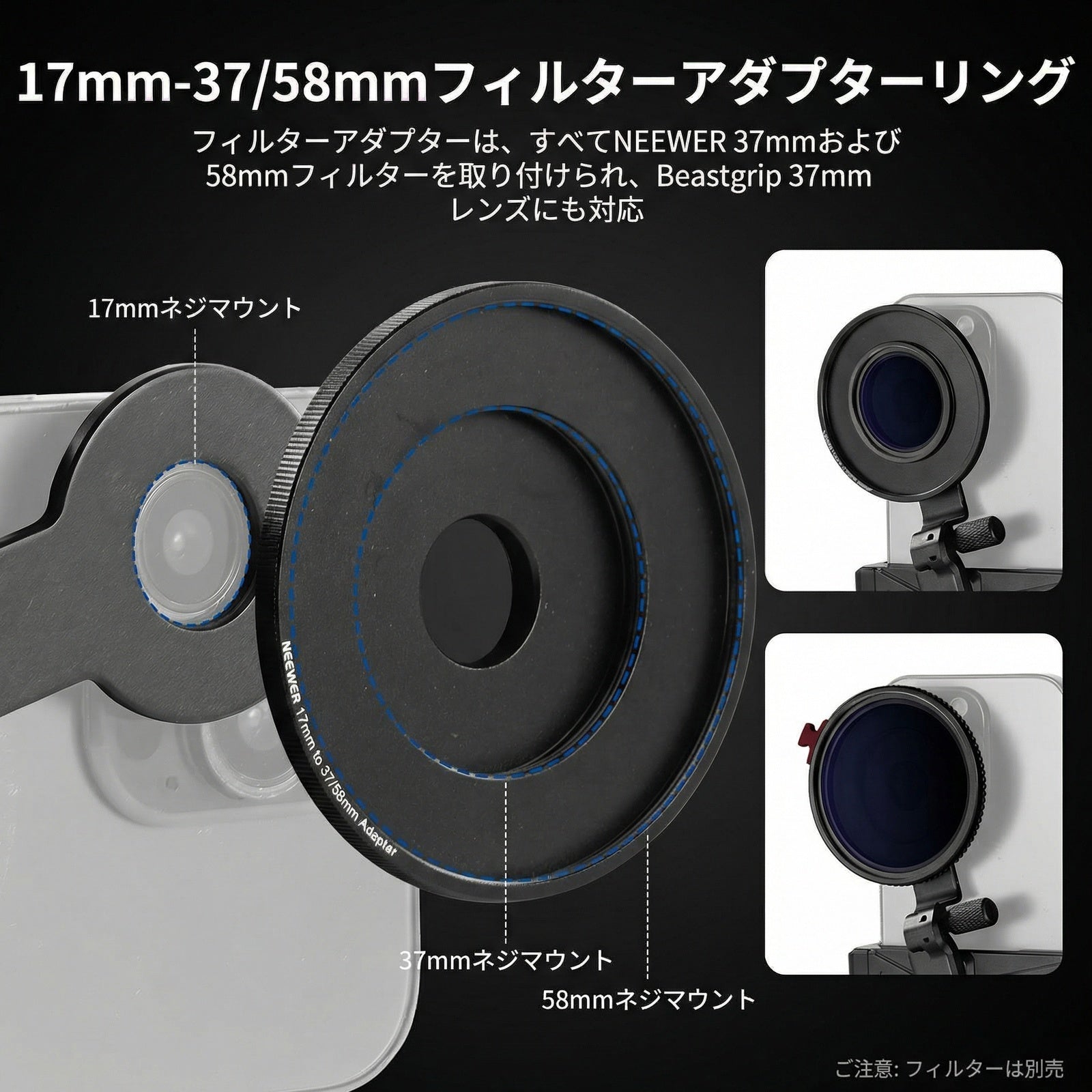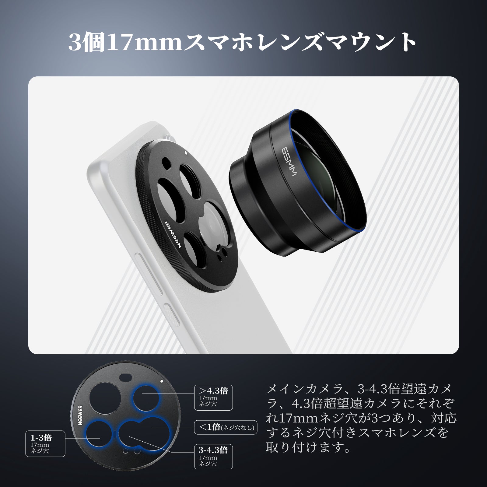 耐衝撃性のあるラバーライニングでスマートフォンを保護しながら、動画撮影、YouTube/TikTokのVlog、ライブ配信、モバイル写真撮影、映画制作などに活躍します。また、フィルターやレンズを装着できる交換式バックプレートが3枚付属しており、無限のクリエイティビティを実現します。