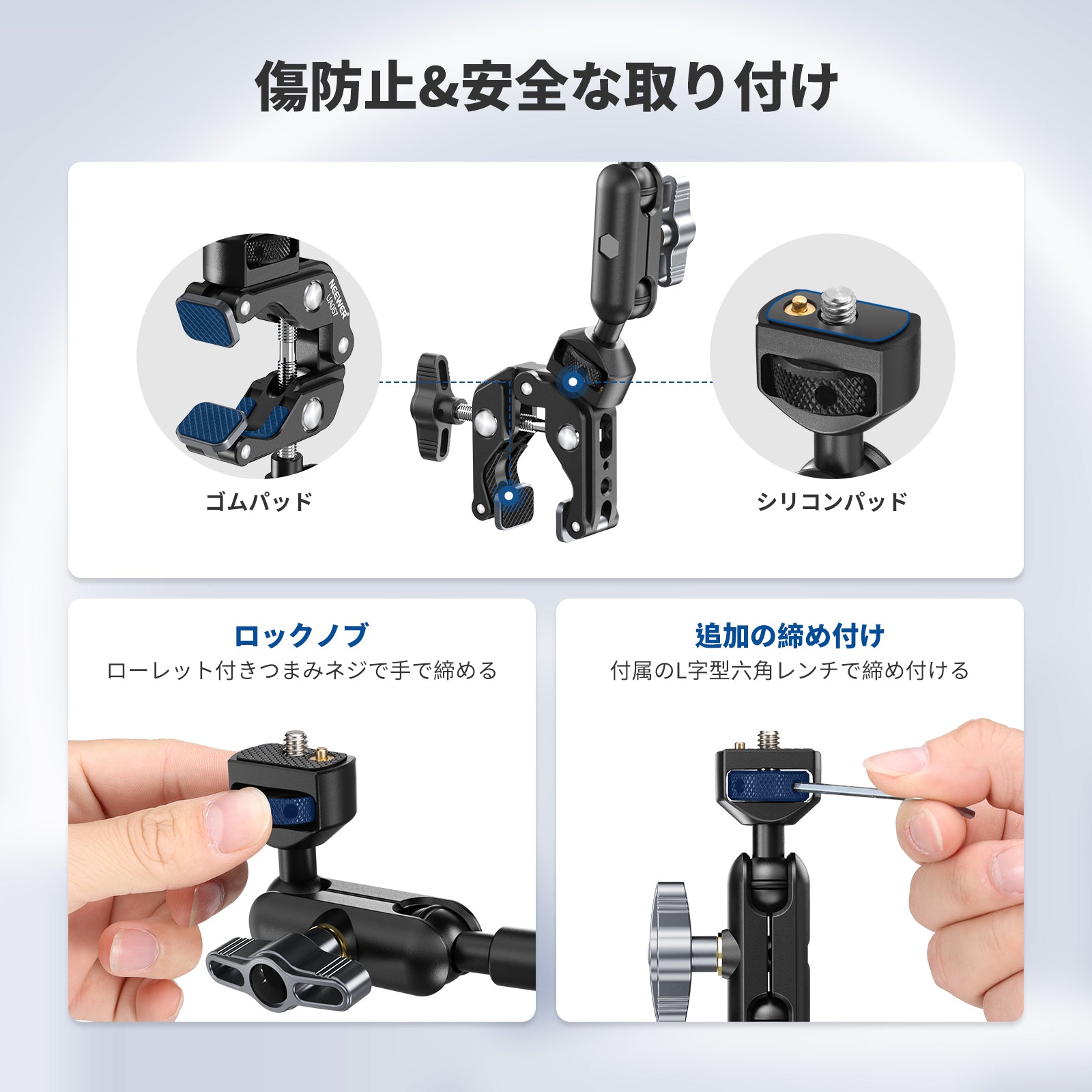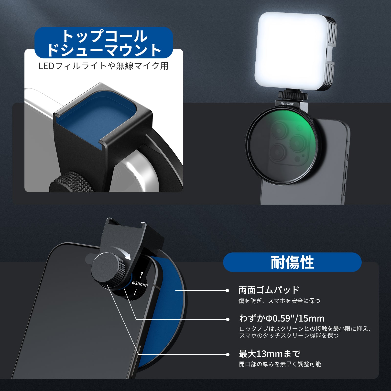 様々なアタッチメントを備えた機能的なスマホケージ&リグとなり、スマホで本格的な動画撮影をしたいならNEEWERは間違いなくお勧めです!