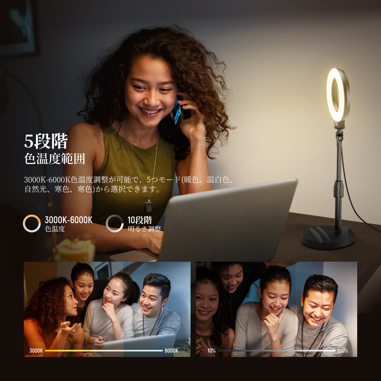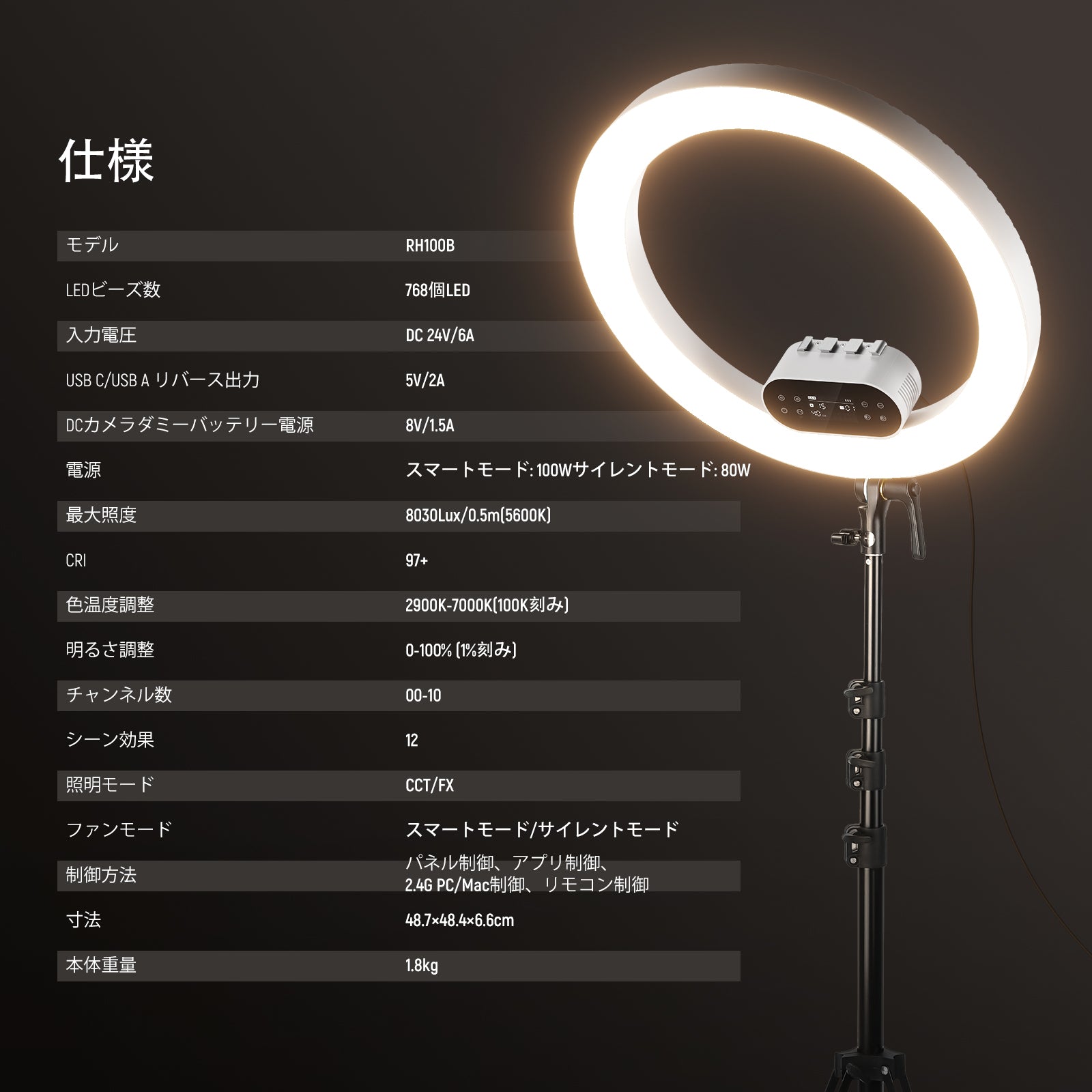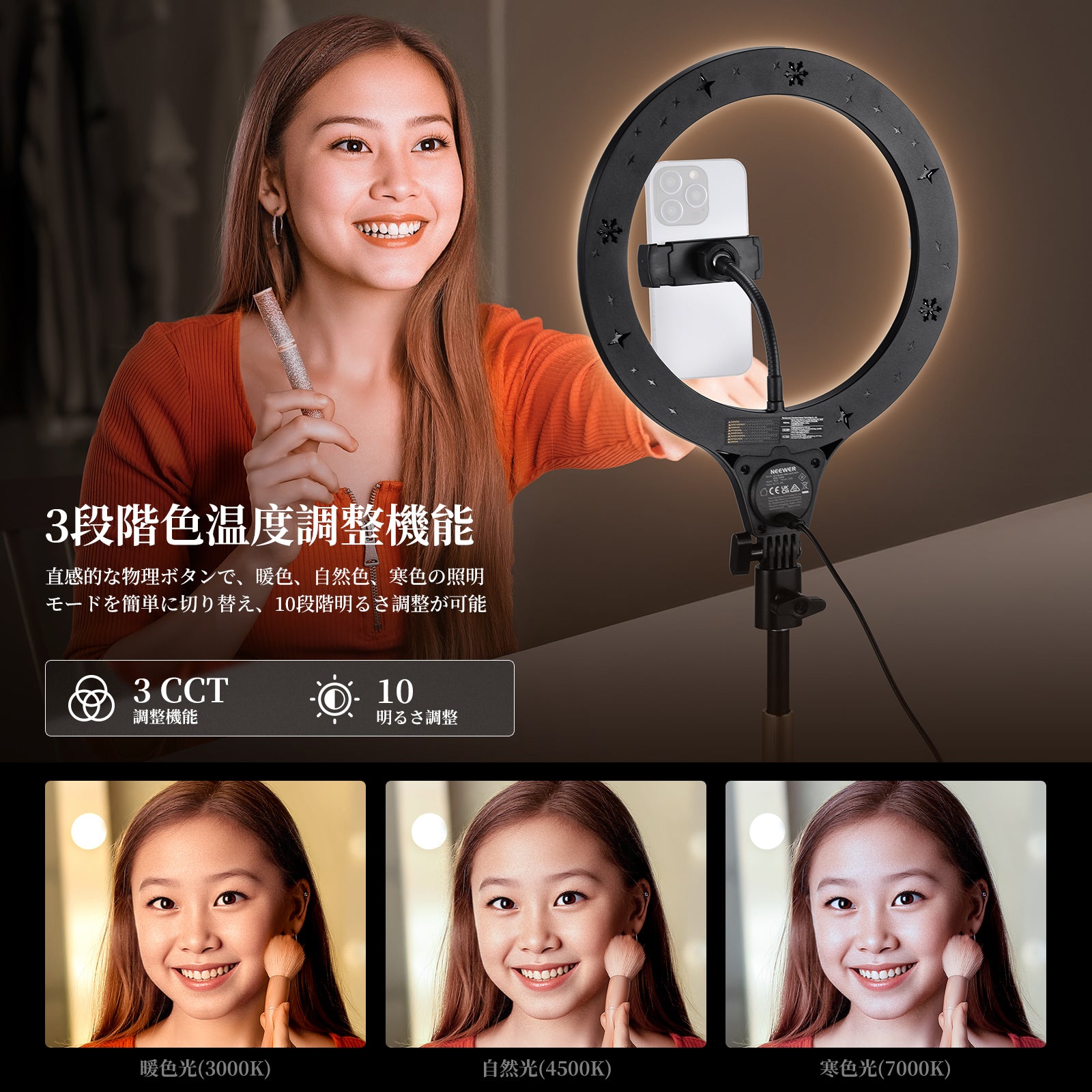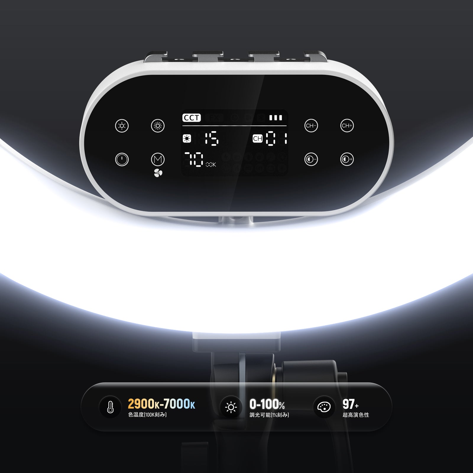 3200K~5600Kの色温度、0~100%の調光範囲、97+の高いCRI、21Wの電力、105個の暖色LED、および105個の冷色 LED を備えています。YouTubeのビデオ録画、ビデオブログ、ゲーム、ライブストリーミング、ポートレート、製品の写真撮影に最適です。