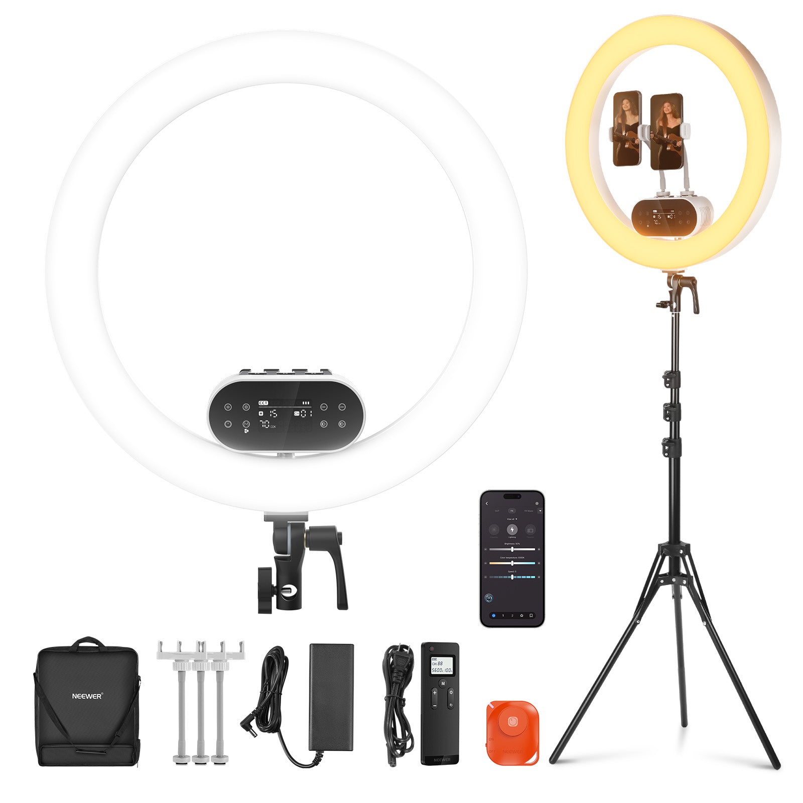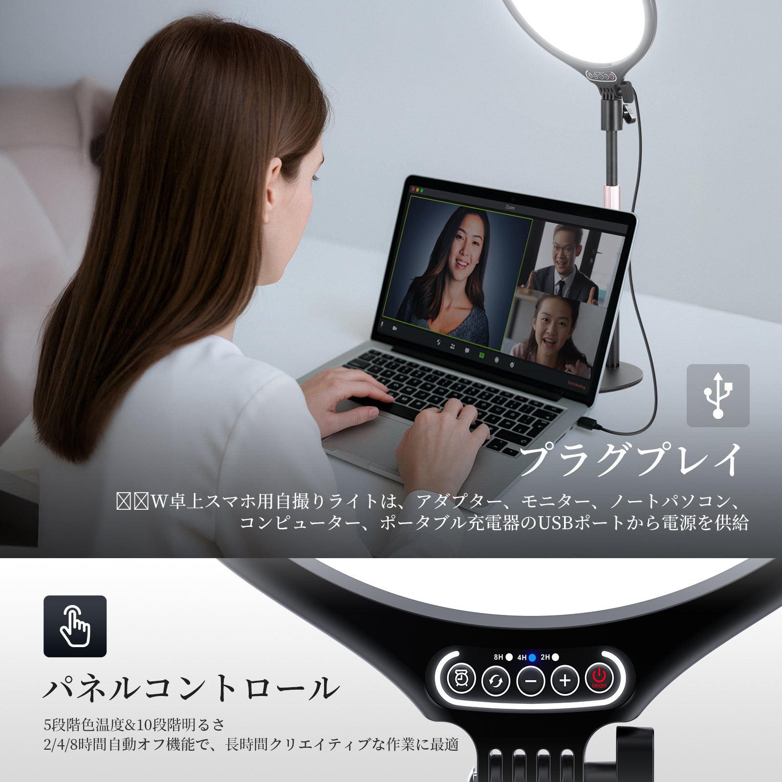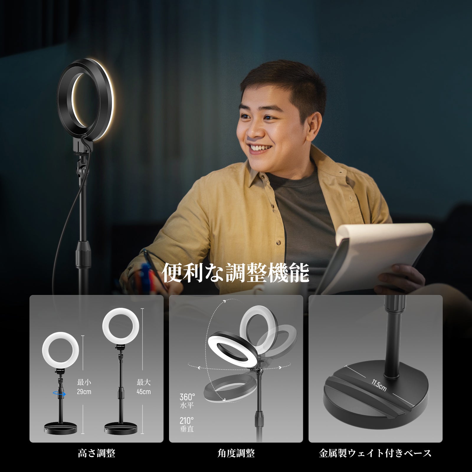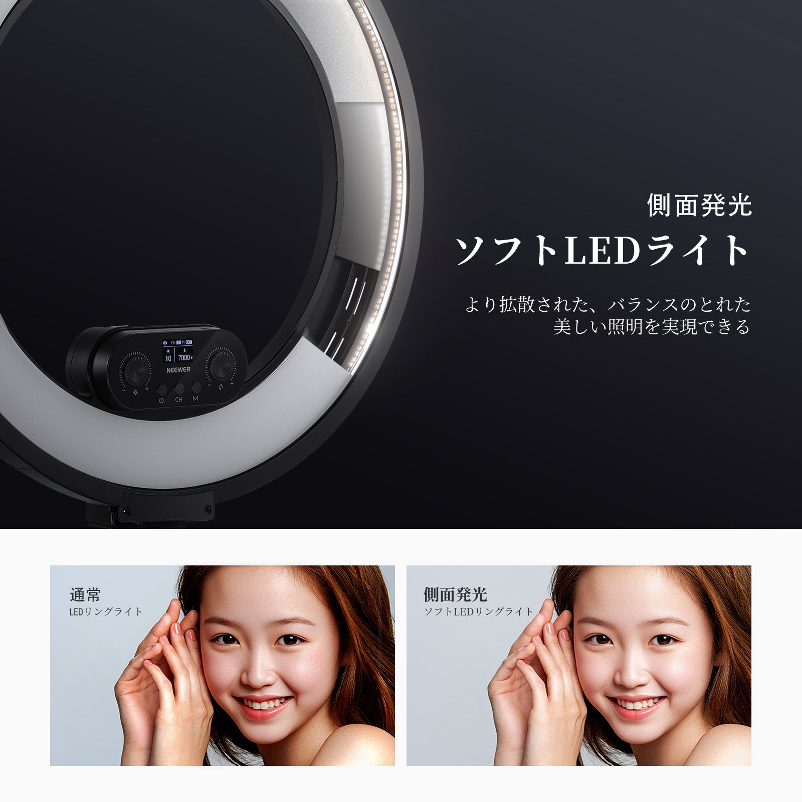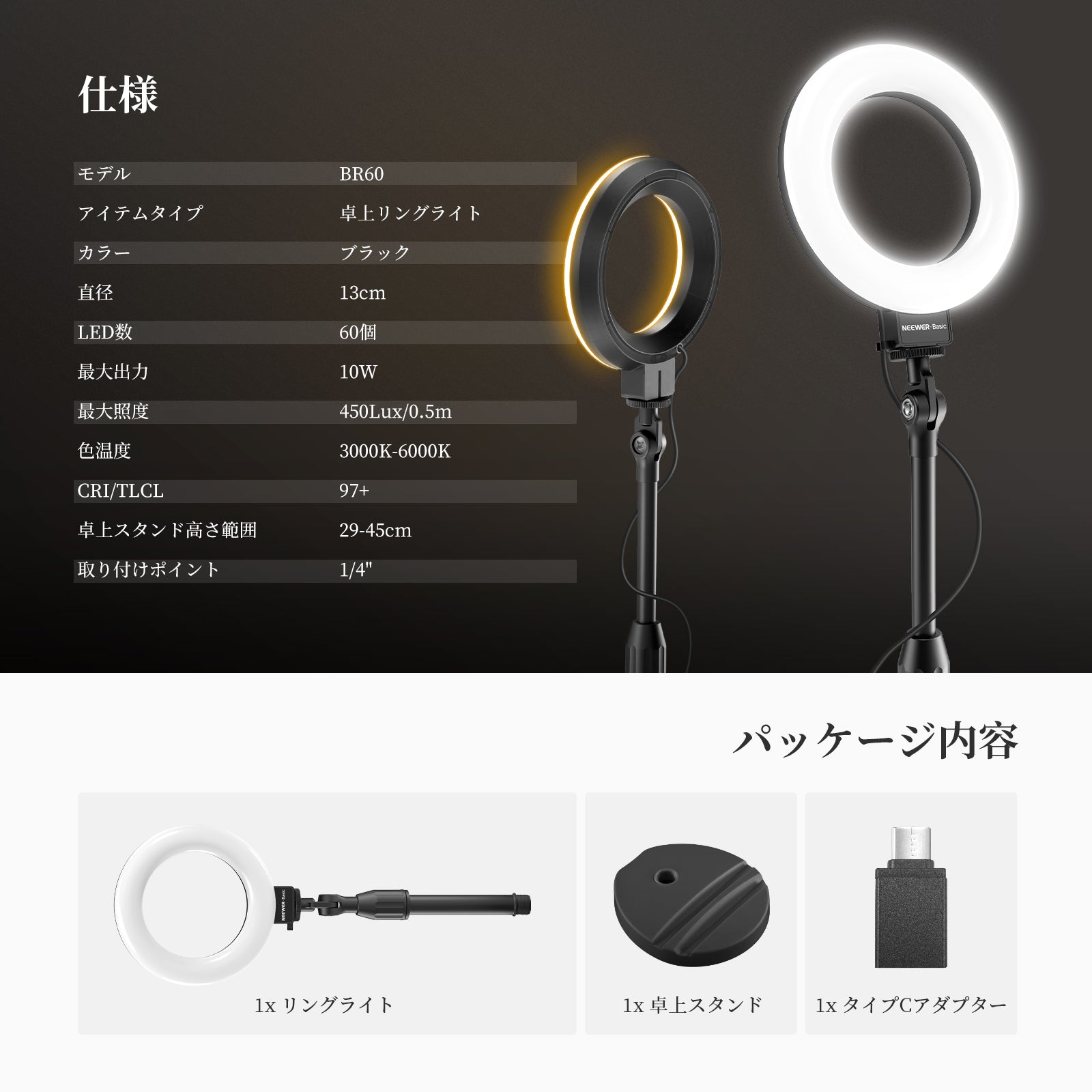 3200K~5600Kの色温度、0~100%の調光範囲、97+の高いCRI、21Wの電力、105個の暖色LED、および105個の冷色 LED を備えています。YouTubeのビデオ録画、ビデオブログ、ゲーム、ライブストリーミング、ポートレート、製品の写真撮影に最適です。