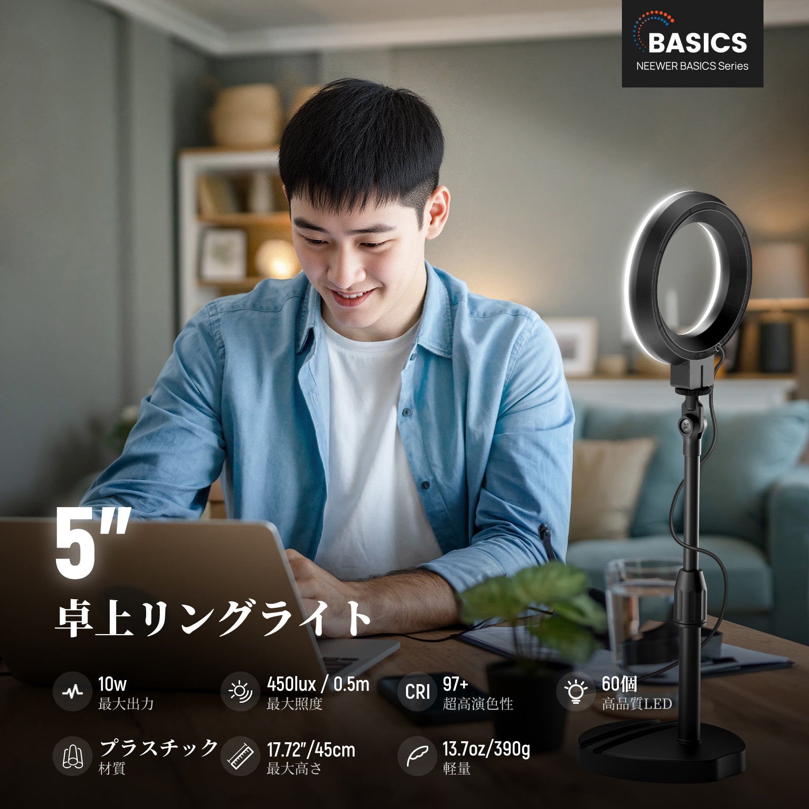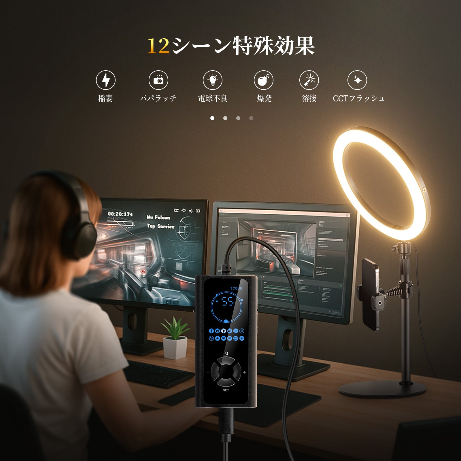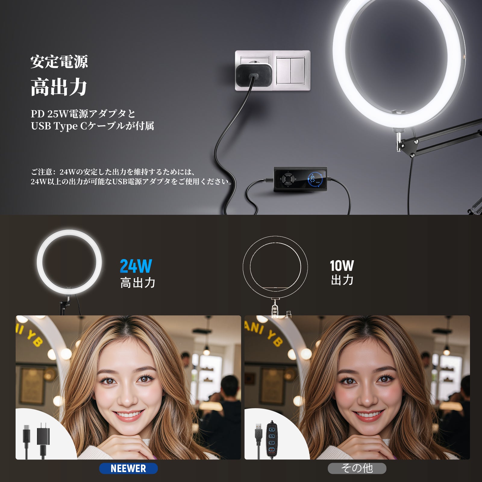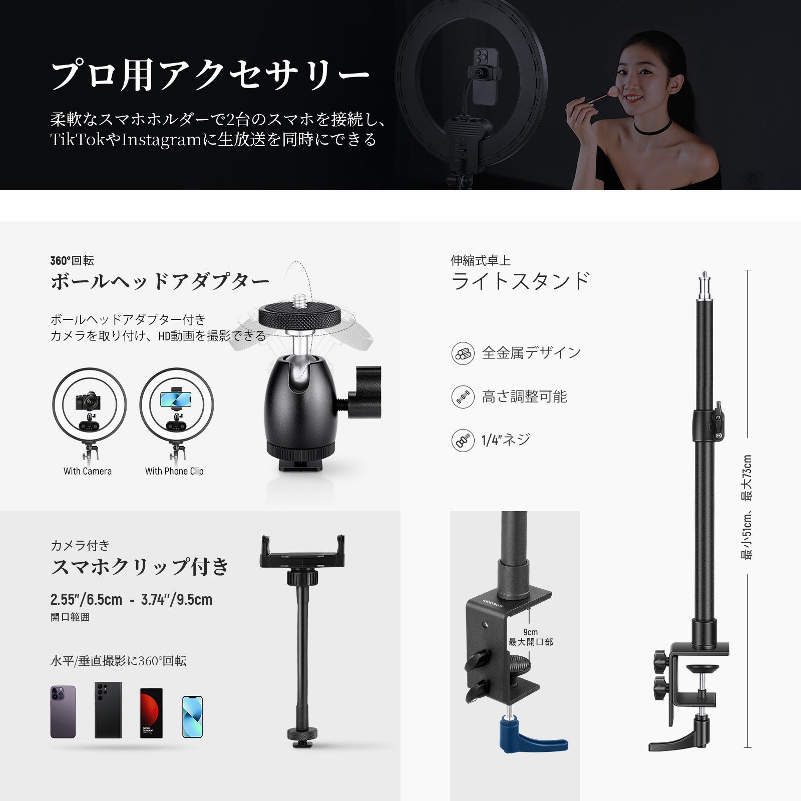 3200K~5600Kの色温度、0~100%の調光範囲、97+の高いCRI、21Wの電力、105個の暖色LED、および105個の冷色 LED を備えています。YouTubeのビデオ録画、ビデオブログ、ゲーム、ライブストリーミング、ポートレート、製品の写真撮影に最適です。