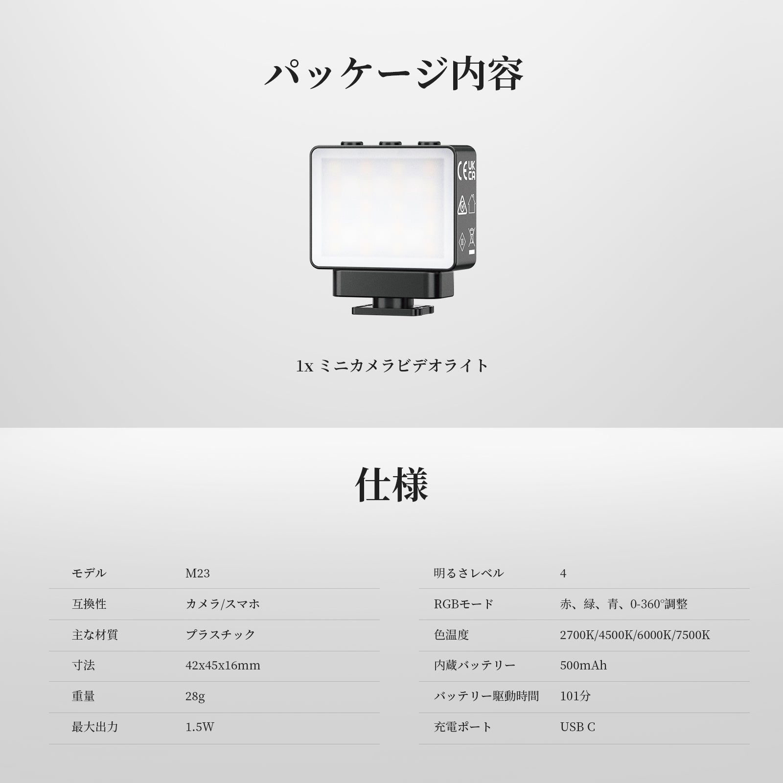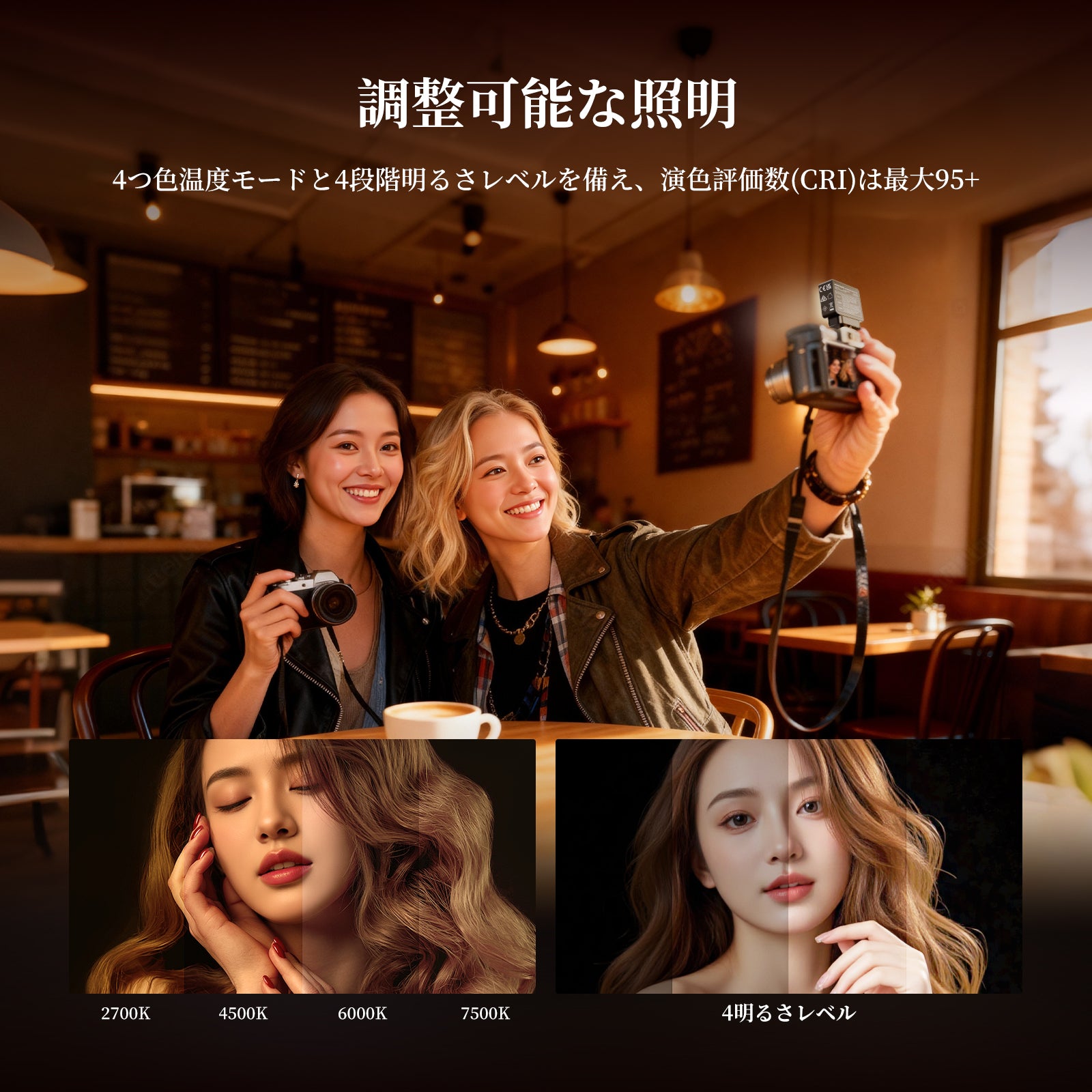 - 【4段階CCTモードと明るさ調節】 M23 小型LEDパネルライトは、4段階の色温度モードと4段階の明るさ調節を備え、CRI95+の高演色性を実現。動画収録やライブ配信、撮影、自撮り、Vlog制作など、多彩なコンテンツ制作シーンで自然な照明効果を発揮します。