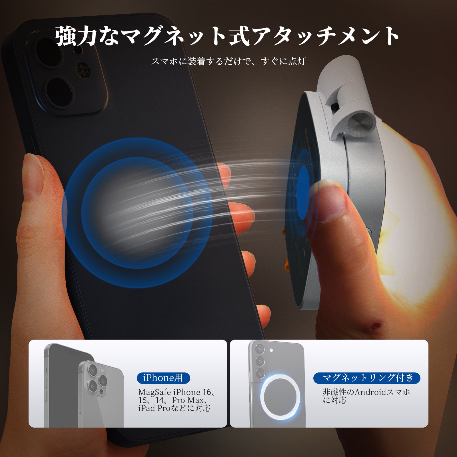 • 【マグネット式で着脱簡単】NL45Bミニリングライトは強力な磁着構造を採用、MagSafe対応の iPhone 16 Pro Max Plus 15/14/13/12 Mini iPad Pro などの磁性体対応デバイスに直接吸着可能です。非磁性端末には付属の粘着マグネットリングでAndroidスマートフォンに対応します。360°回転・270°チルト調節で、前面カメラと背面カメラの両方で理想のアングルを実現します。