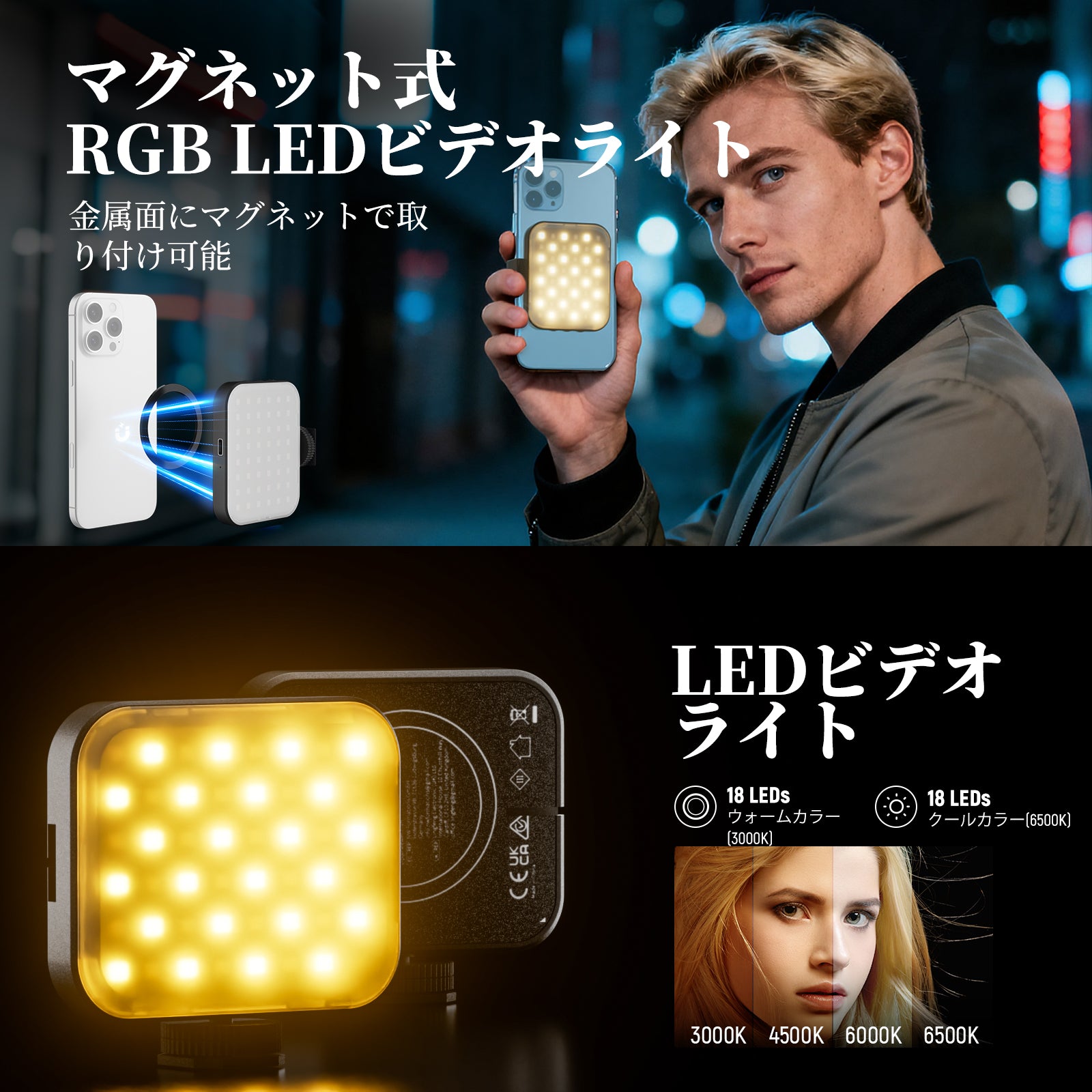 - 【コンパクトなバイカラーLEDビデオライト】BL48B バイカラーLEDビデオライトは、3000K-6500K色温度、5段階調光機能、0.5mで257Lux明るさ、CRI95+を提供します。1000mAhバッテリーを内蔵し、130分でフル充電し、100%明るさで75分間連続使用します。コンパクトかつ軽量で、MagSafe iPhone対応のスマホにマグネットで取り付けられ、外出先での写真撮影、動画撮影、化粧、生放送、録音照明など、様々な用途で活躍します。