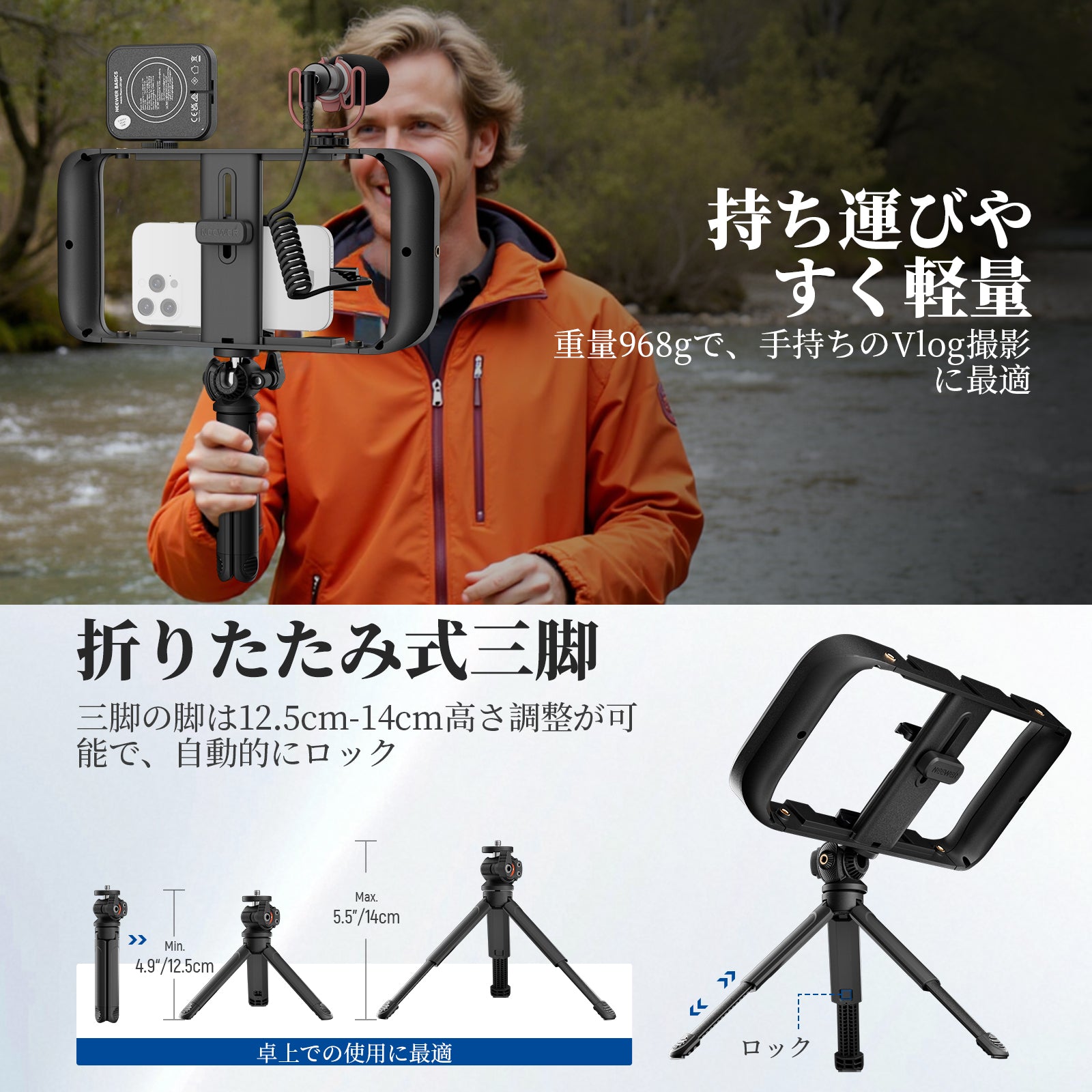 【折りたたみ式三脚&スマホマウント】三脚スタンドは重さ968gで、軽量かつポータブルで持ち運びに簡単です。ドラッグパンヘッドにより縦/横撮影に対応し、便利なフリップロックを備え、54-142cm高さ調整が可能です。回転式スマホホルダーマウントは、iPhone、Android、幅50-80mmスマホに対応し、縦向きと横向き撮影が可能です。コンテンツクリエイターにとってビデオ録画、ビデオ撮影、写真撮影用アクセサリーとして最適です。