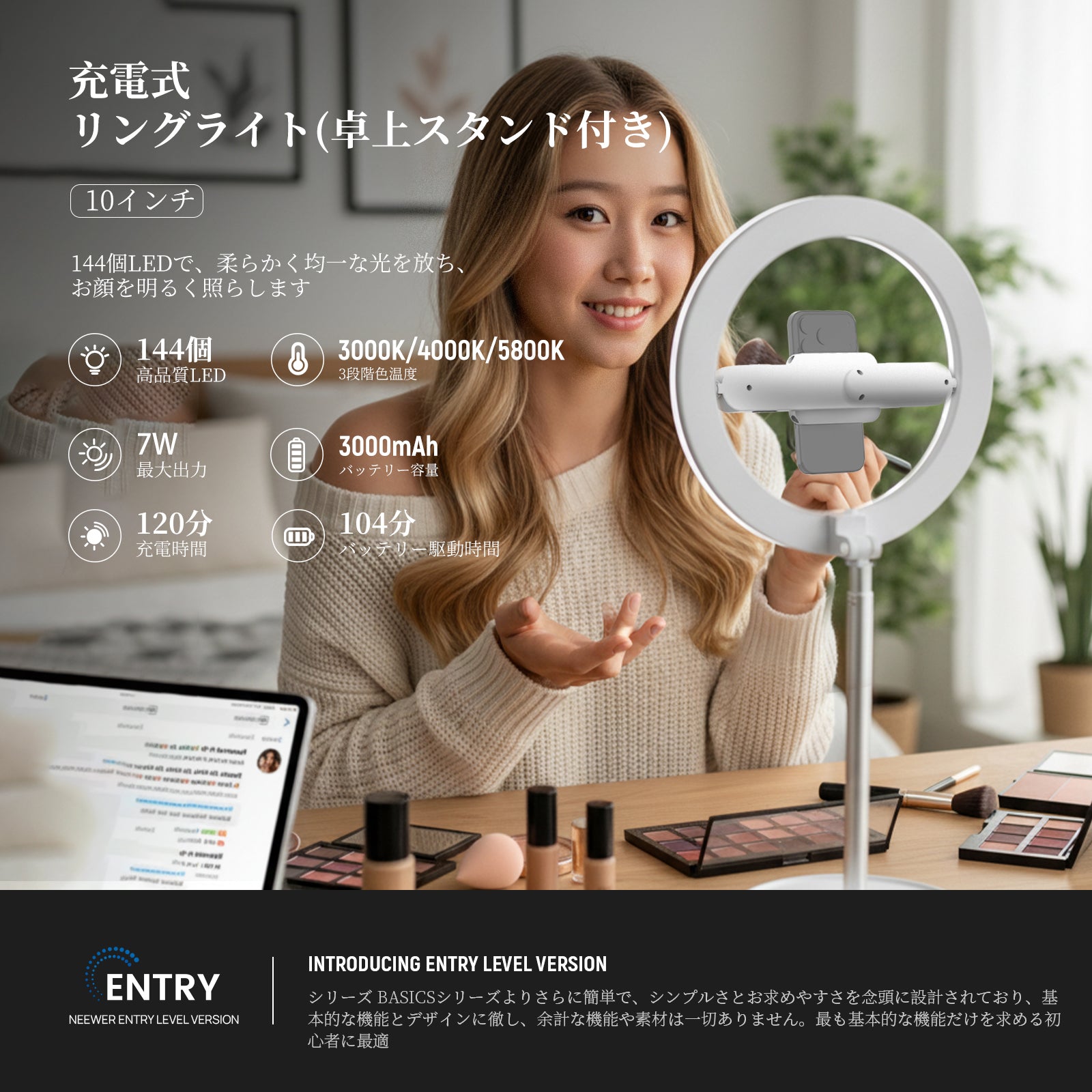 - 【大容量3000mAhバッテリー&USB給電対応】ポータブル卓上リングライトは、3000mAhの充電式バッテリーを内蔵。最大輝度で約104分間の連続使用が可能です。5V/2Aまたは5V/1AのUSB給電にも対応し、SNSインフルエンサーにとって必須の、途切れない連続照明を提供します。ご注意:バッテリー寿命を最大限に延ばすため、初回ご使用前に満充電されることを推奨します。