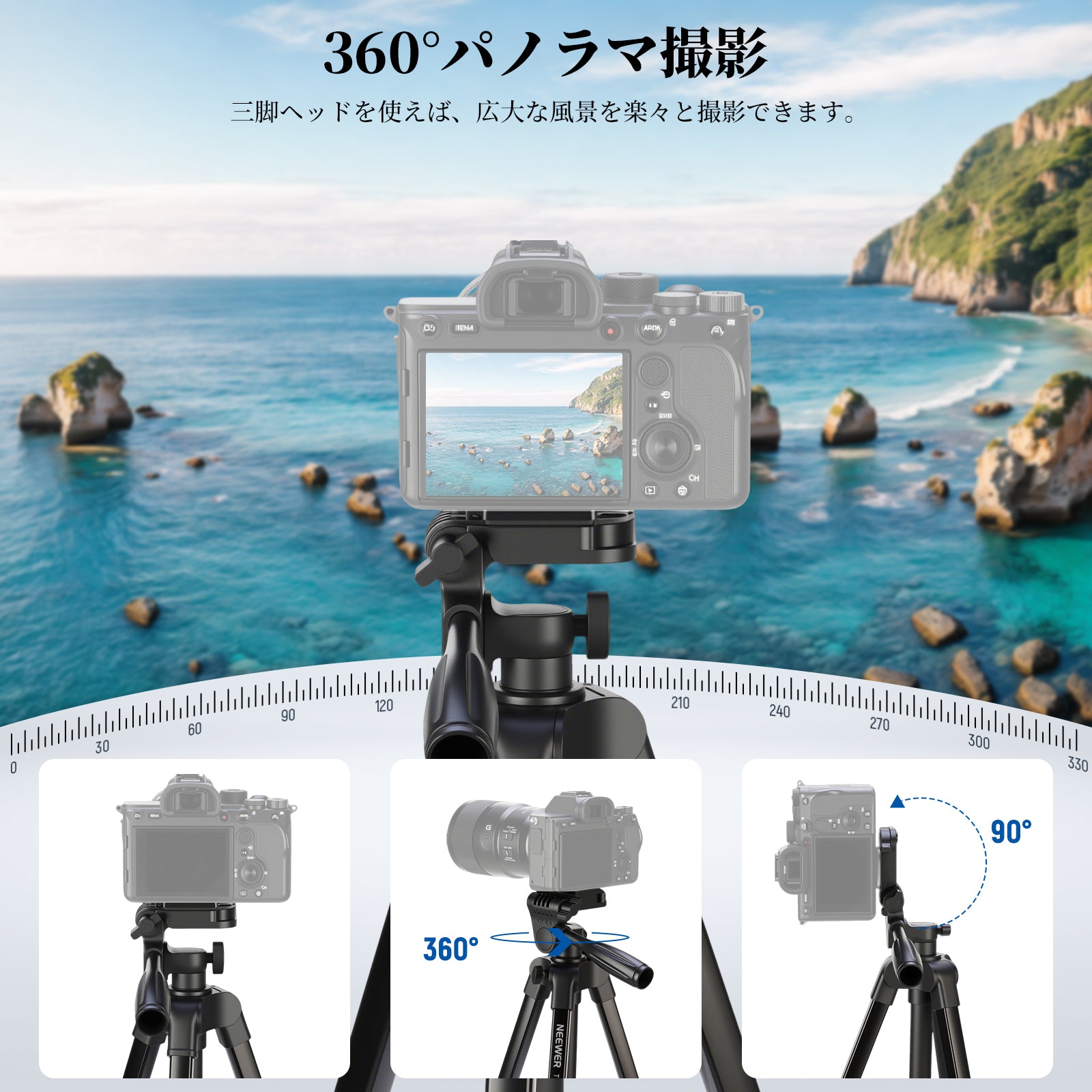 - 【多彩な撮影角度】クイックリリースプレートは革新的な技術で、水平から垂直へのシームレスな撮影をサポートし、手締めノブで簡単に操作できます。さらに、三脚ヘッドは360°パノラマ撮影を可能にし、広大な風景を捉えます。+90°から-70°のチルトが可能で、着脱式ハンドルで利き手に合わせて左右に切り替えられます。カメラとスマホ用のプロ仕様三脚です。
