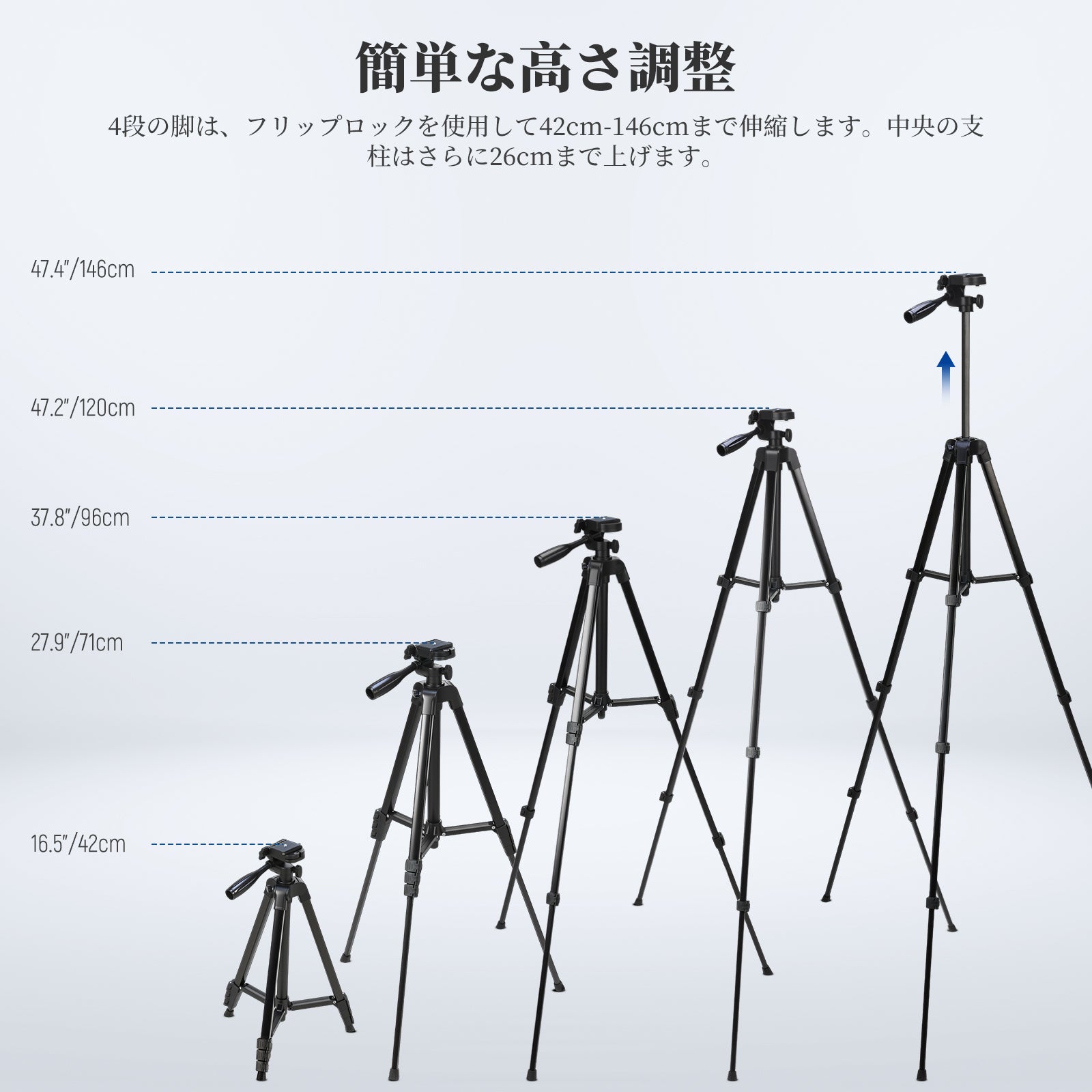 【簡単な高さ調整】4段の脚は、フリップロックを使用して42cm-146cm簡単に調整できます。同時に、センターポールは最大26cmまで上げることができ、あらゆるショットを柔軟に撮影できます。センターポール下部には、ウェイトを掛けられるフックが付いているので、安全性を高めています。