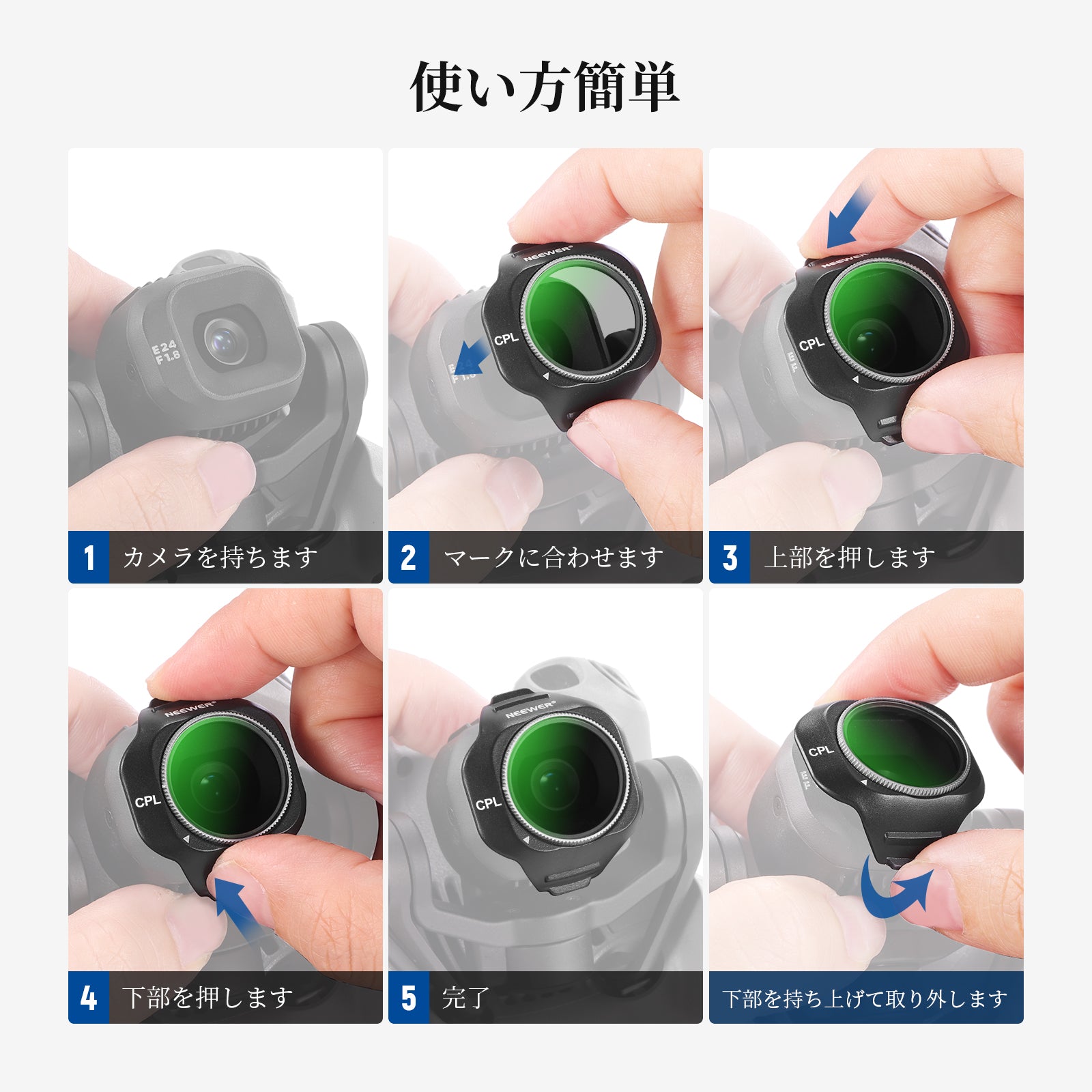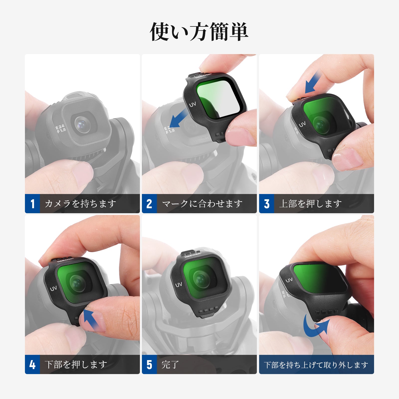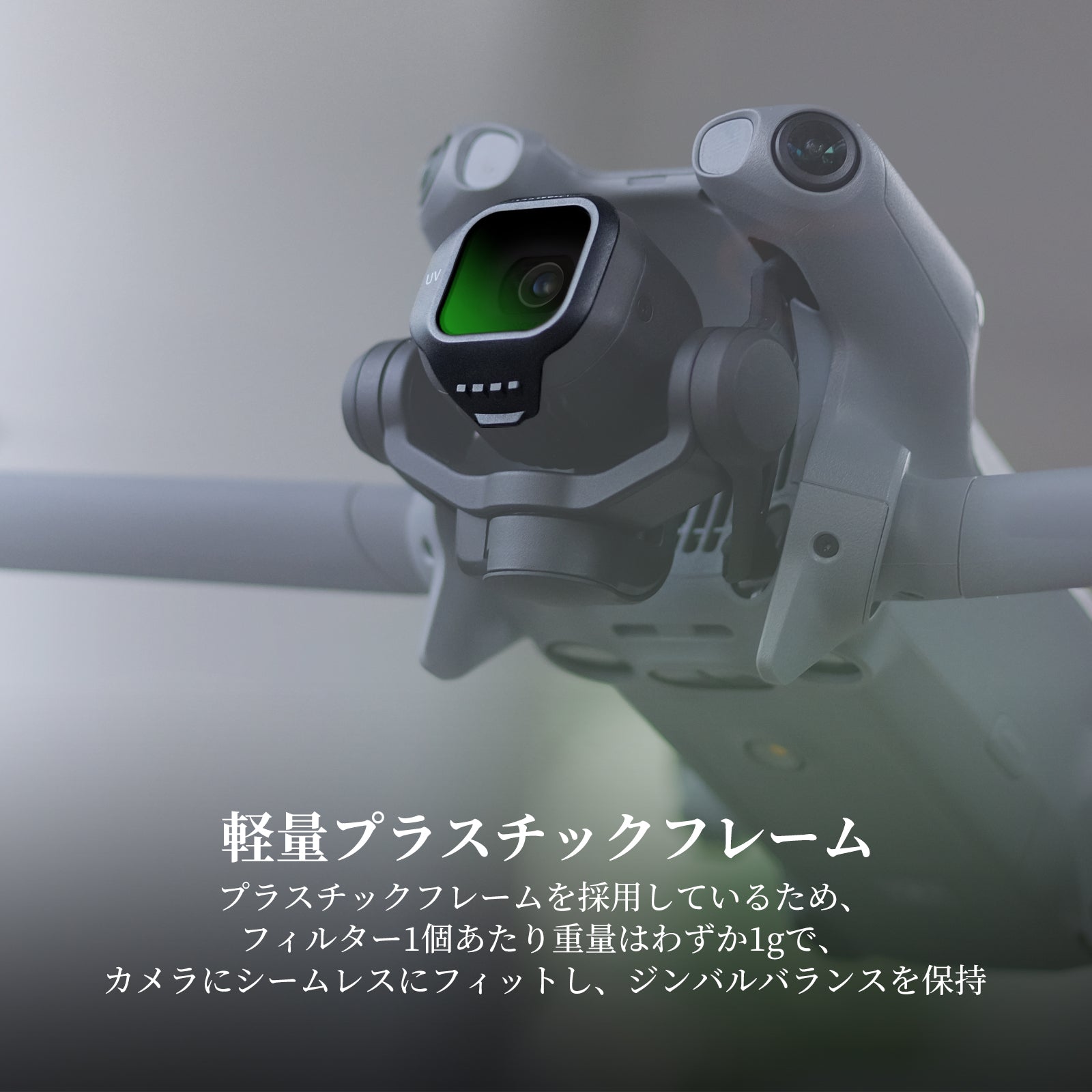 【クイックスナップオンアタッチメント】カメラを持ち、フィルターの位置を合わせて上から下までカチッとはめ込み、しっかりと固定します。わずか1g軽量フレームがジンバルのバランスと正確さを維持します。