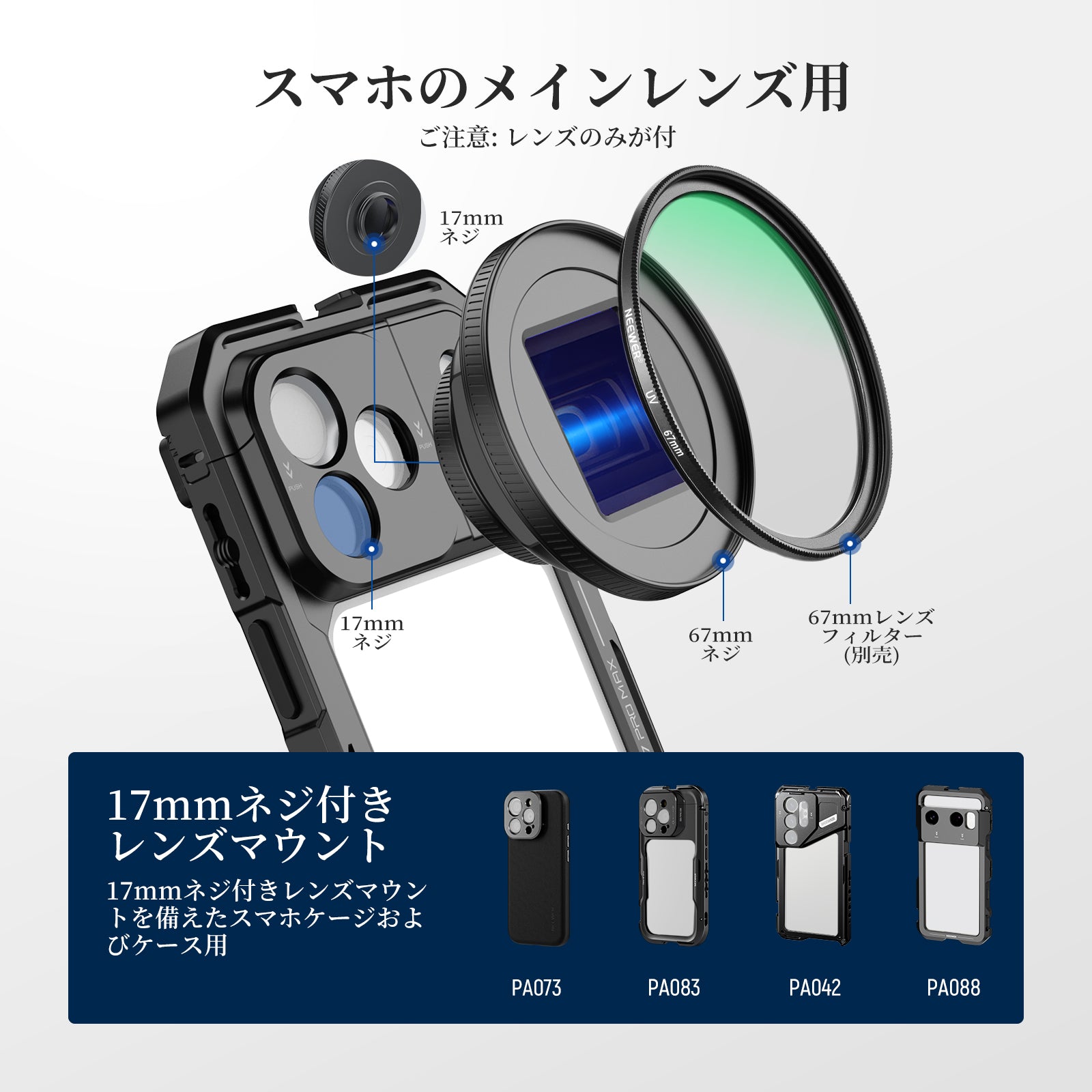 - 【17mmネジ付きレンズクリップ】レンズクリップをメインカメラに取り付けられ、17mmネジでレンズを固定します。28mm調整可能な開口部を備え、様々な厚さiPhone、Androidスマホに対応し、17mmレンズマウントネジ付きNEEWERスマホケージ、ケース、バックプレートにも対応しています。コンテンツクリエイターにとって必要な撮影アクセサリーキットとして、インフルエンサーにとって必要な撮影機材として最適です。