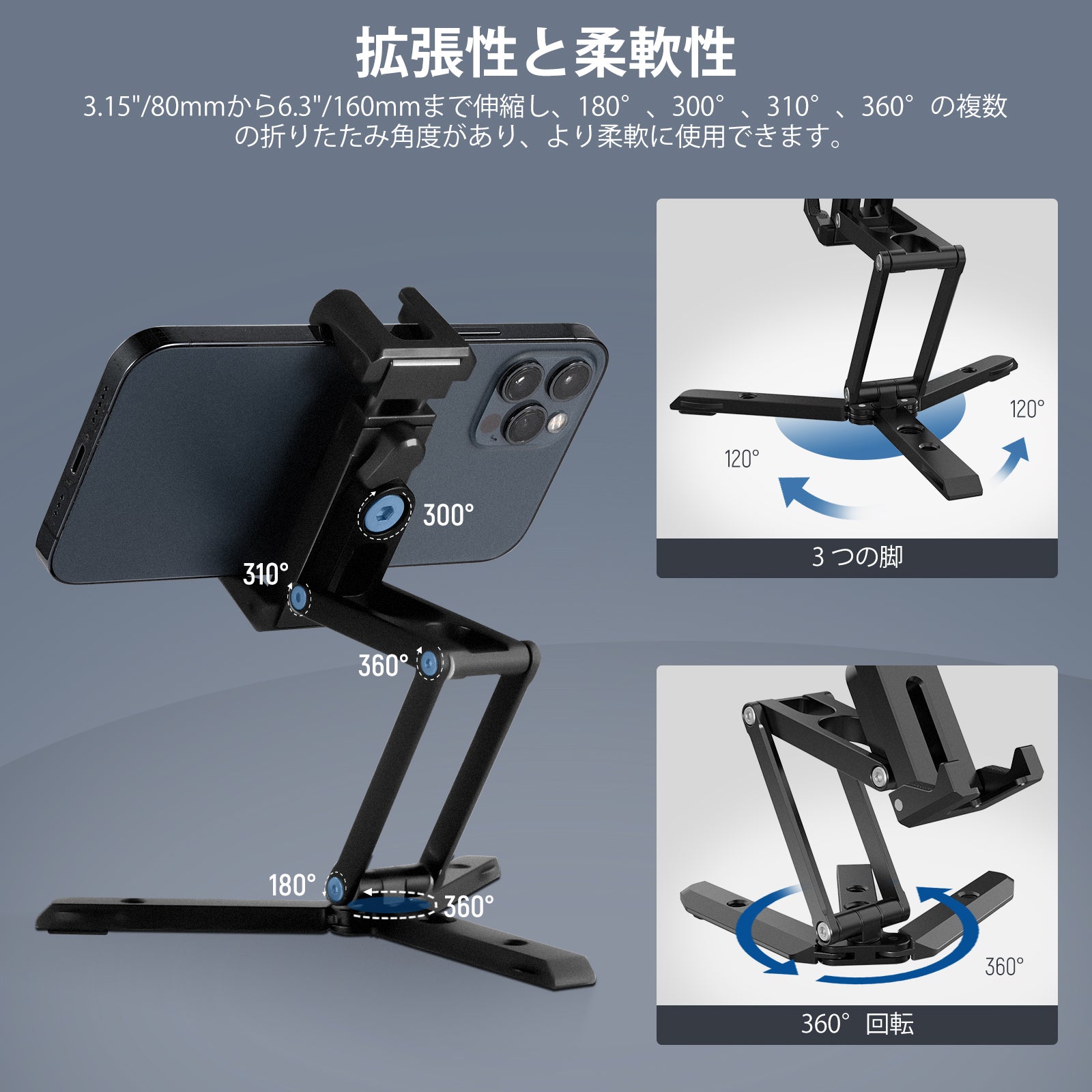 【三つ折り拡張可能&柔軟な角度】アップグレードされた三つ折りデザインには、スプレッド高さが追加され、便利な大きなグリップが含まれています。長さは3.15"/80mm~10.24"/260mmまで伸ばすことができ、最大拡張高さは7.1"/180mmで、各折りたたみ角度は310°、60°、180°の調整をサポートしています。底部に360°回転するピボットを備えて、スマートフォンのカメラを頭上、上向き、垂直、その他の撮影位置に簡単に配置できます。