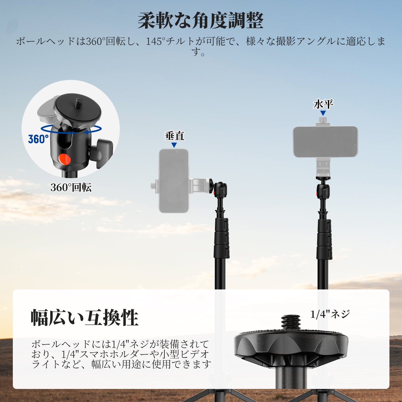 - 【56-200cm伸縮式高さ&360°回転】ST200B三脚スタンドは3つ伸縮セクションと高信頼性のフリップロックを備え、高さは56cm-200cmまで柔軟に調整可能で、目線の高さや頭上からの撮影に合わせます。安全なロックシステムは、滑りを防ぎ、使用中や持ち運び中の落下から機材を保護します。360°ボールヘッドが付属し、柔軟な角度調整が可能です。
