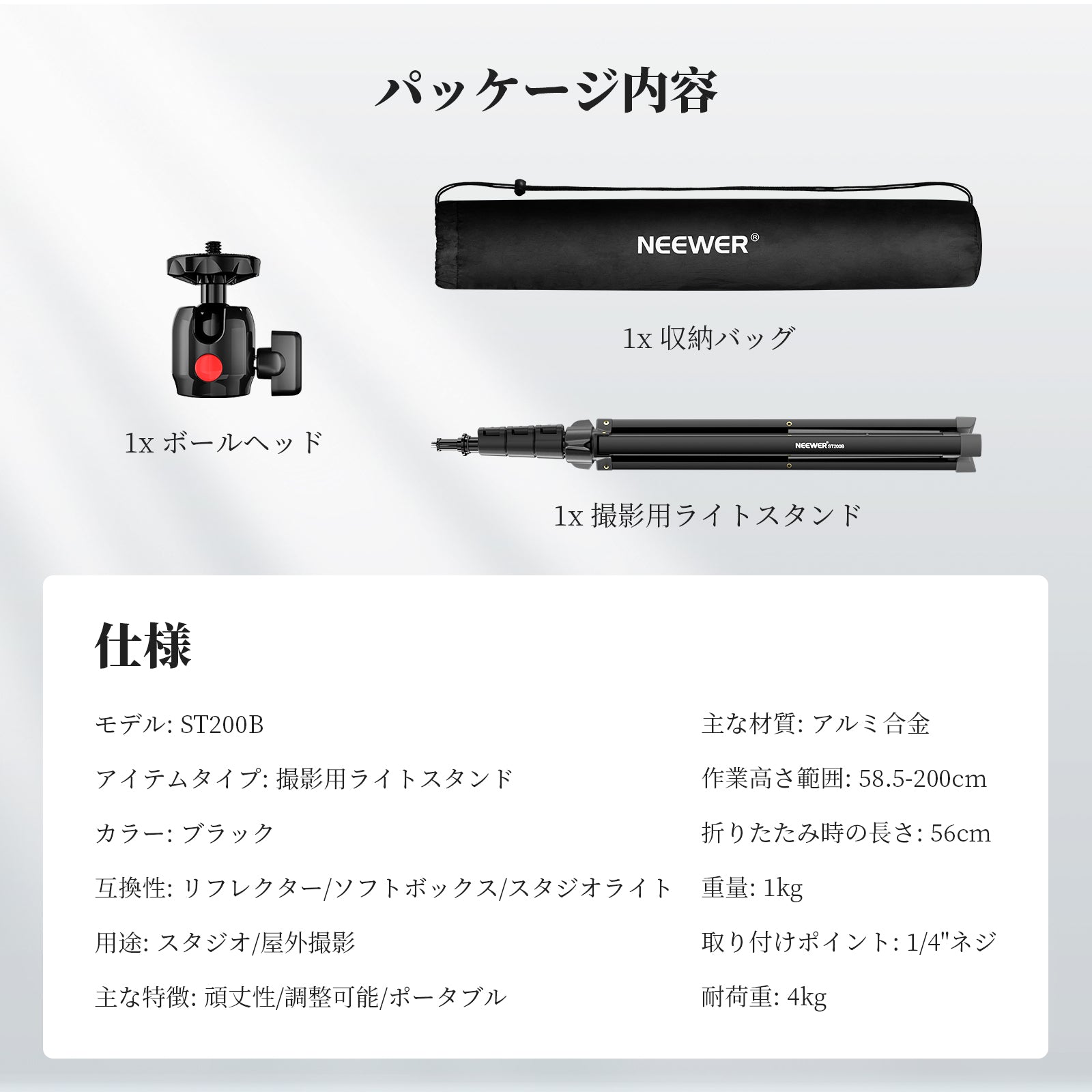 - 【多様な互換性】NEEWER ST200B写真用三脚スタンドは、1/4"ネジを備えており、ストロボライト、COB連続出力照明、リングライト、LEDビデオライト、モノライト、ソフトボックス、アンブレラ、アクションカメラ、DSLRカメラなど、幅広い撮影アクセサリやデバイスを取り付けられ、商品撮影、ポートレート撮影、屋外撮影など最適です。