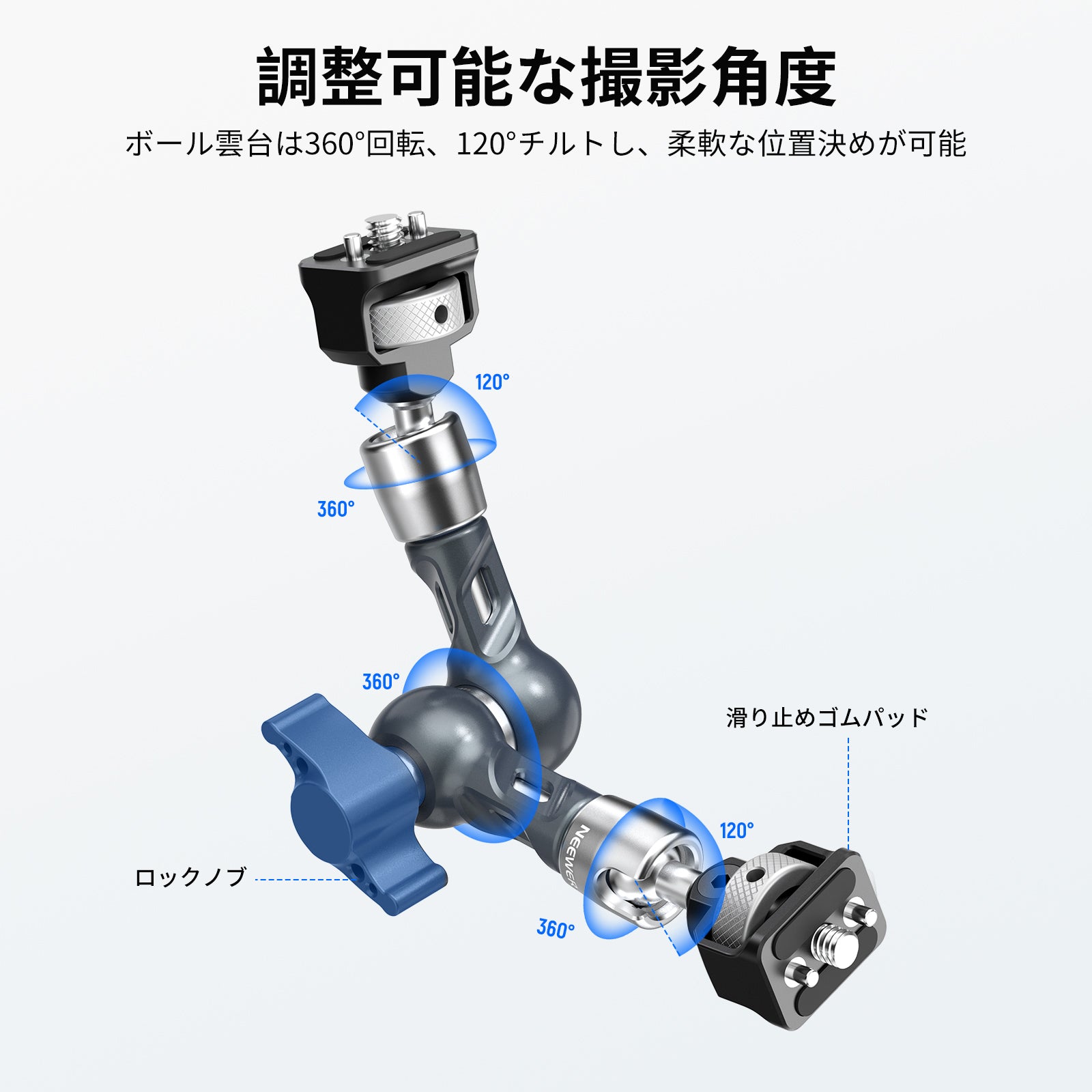 - 【360°回転&90°傾斜】マジックアームカメラマウントは、各関節アームにUノッチ付きのボールヘッドを備えており、360°回転と90°チルトが可能です。拡大されたレバーで任意の角度に固定でき、安定性と正確な位置決めを実現します。