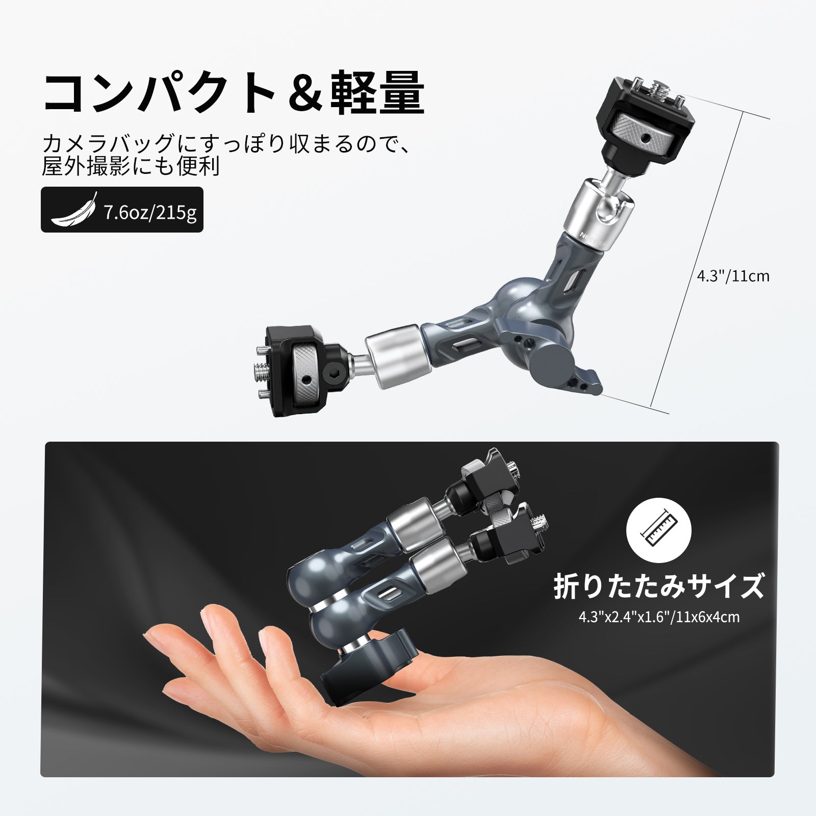 - 【1/4"マウントオプション】1/4"マウントネジは、DSLRミラーレスカメラ、LEDビデオライトパネル、マイク、フィールドモニター(コンパチブル Atomos Ninja V)、スマホホルダー、アクションカメラアダプターアクセサリーなどを取り付けるためのものです。また、スーパークランプ(すべて別売)を使用して、マジックアームをカメラケージ、三脚、その他のリグに直接接続できます。コンテンツクリエイターやインフルエンサーにとって必要な撮影機材として最適です。最大荷重6.6lb/3kgです。