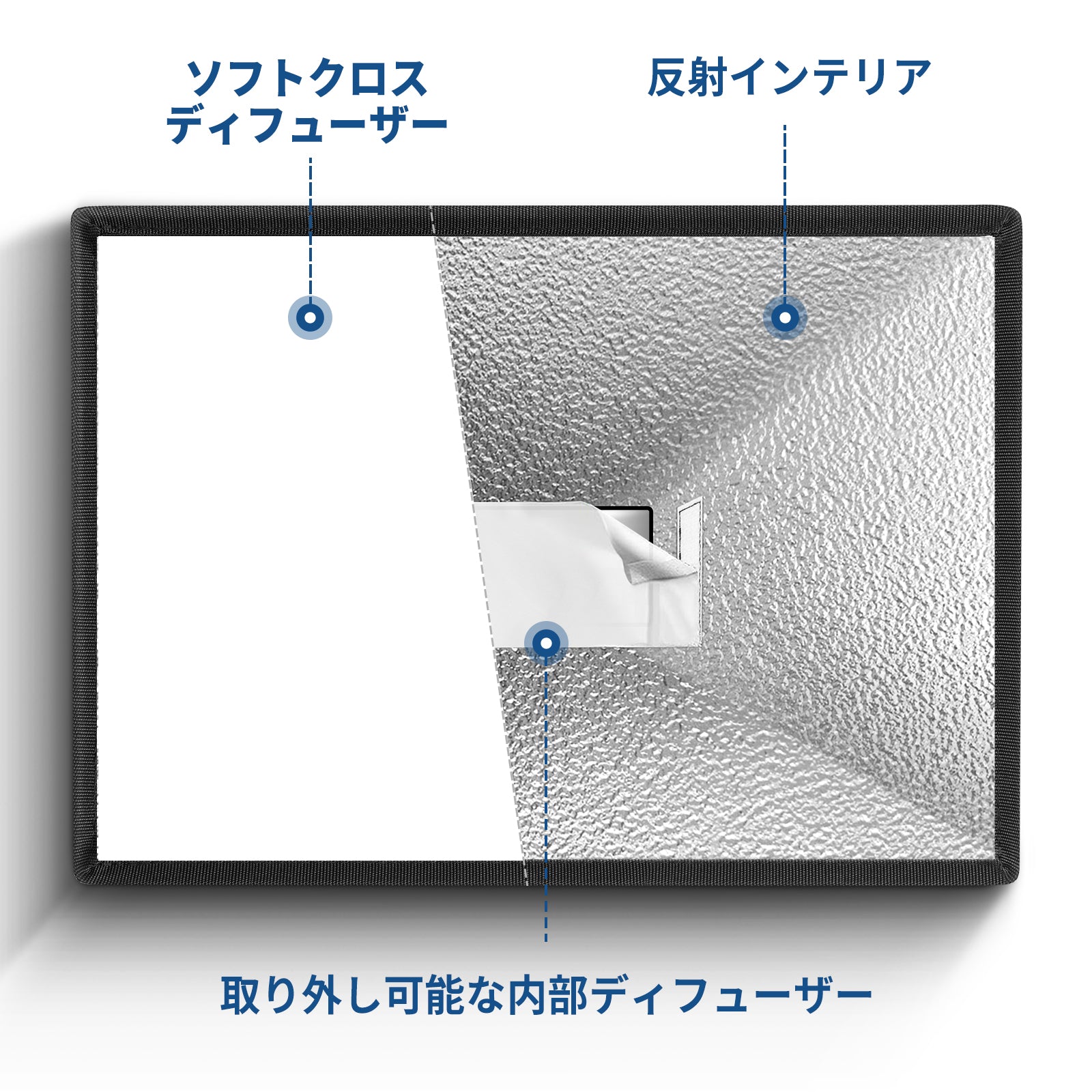 【高品質】外側は黒のナイロン、内側はシルバーのPVCで、取り外し可能な内部ディフューザーが光をさらに柔らかくします。