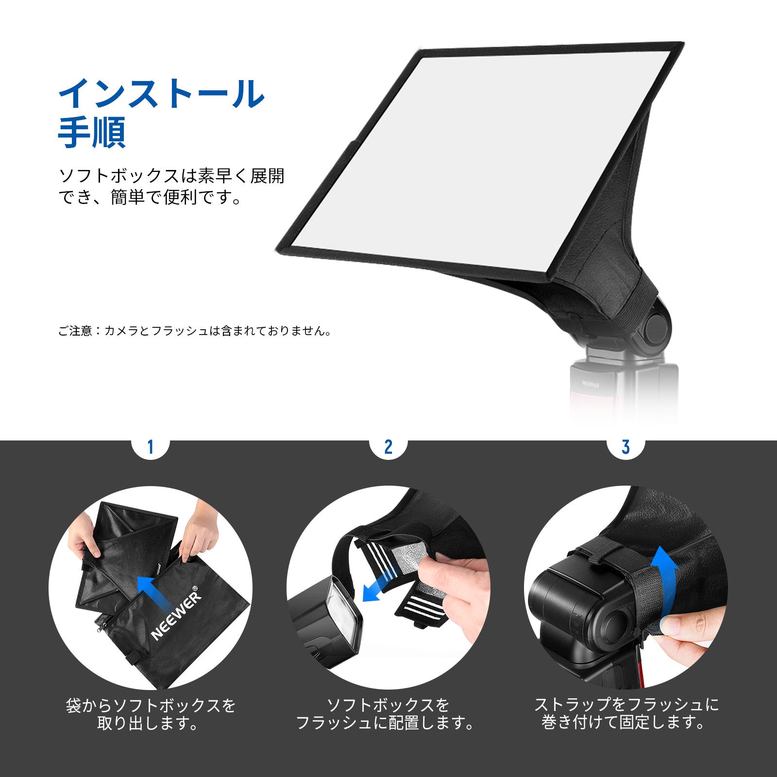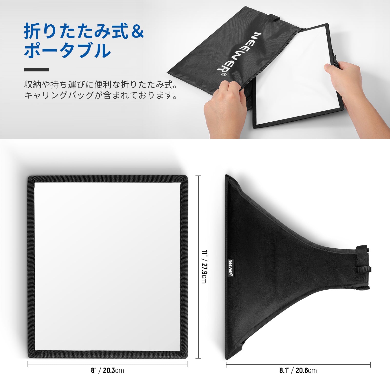 【折りたたみ式デザイン】ディフューザーを広げて、固定テープの前面を取り付けるだけで、使用しないときは平らに折りたたむことができます。各フラッシュディフューザーには、簡単に保管できるキャリングバッグが付属しています。
