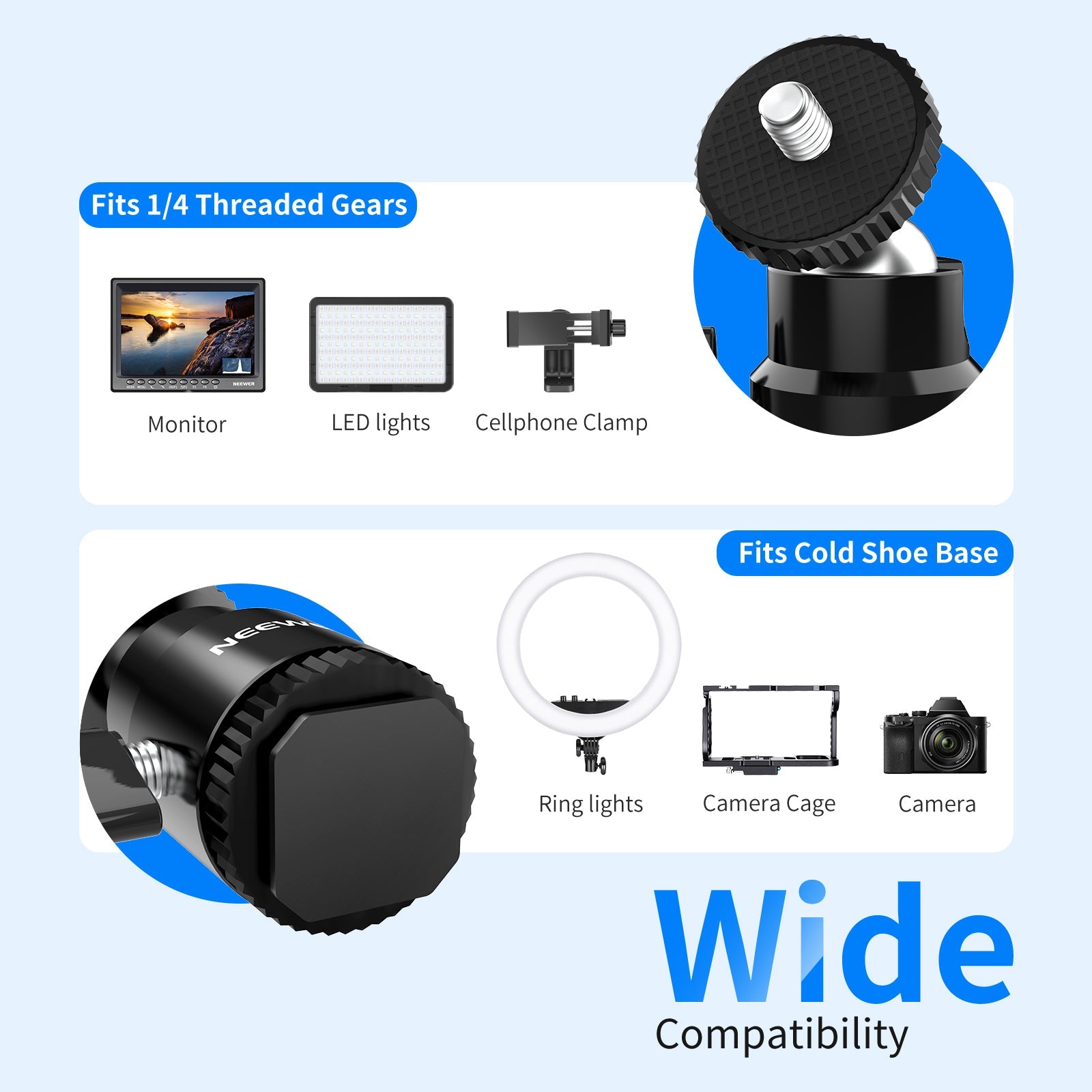 【ミニ雲台】コールドシューアダプターでカメラにしっかりと取り付けます。1/4"ネジを使用すると、LEDフィルライト、LEDフラッシュ、フィールドモニターや他の1/4"ネジ穴が備えているアクセサリを取り付けることができます。調整つまみはボールジョイントをしっかりとロックします。