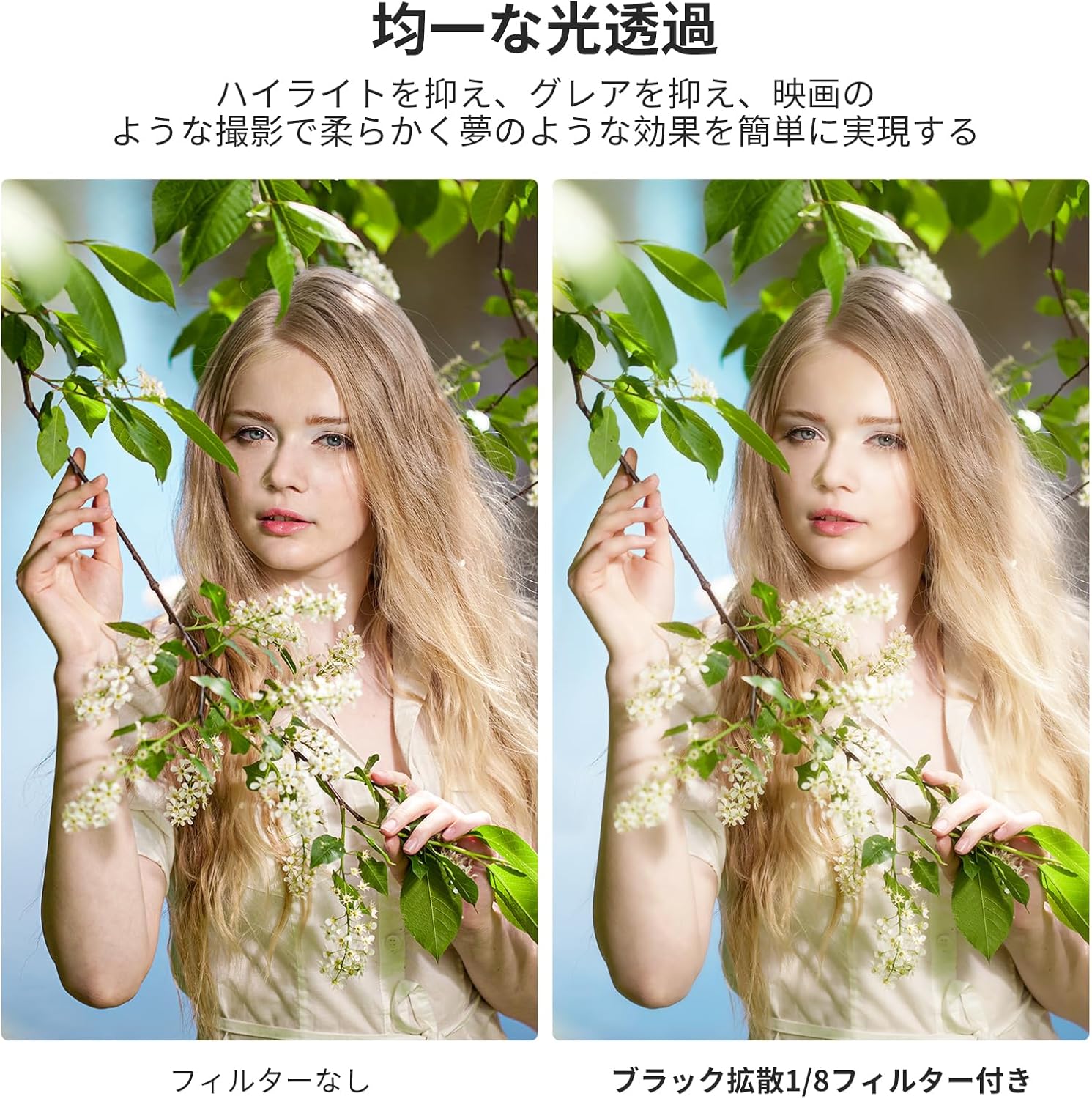 - 【均一な光透過】映画のような撮影で、ソフトで柔らかく夢のような効果を簡単に実現できます。