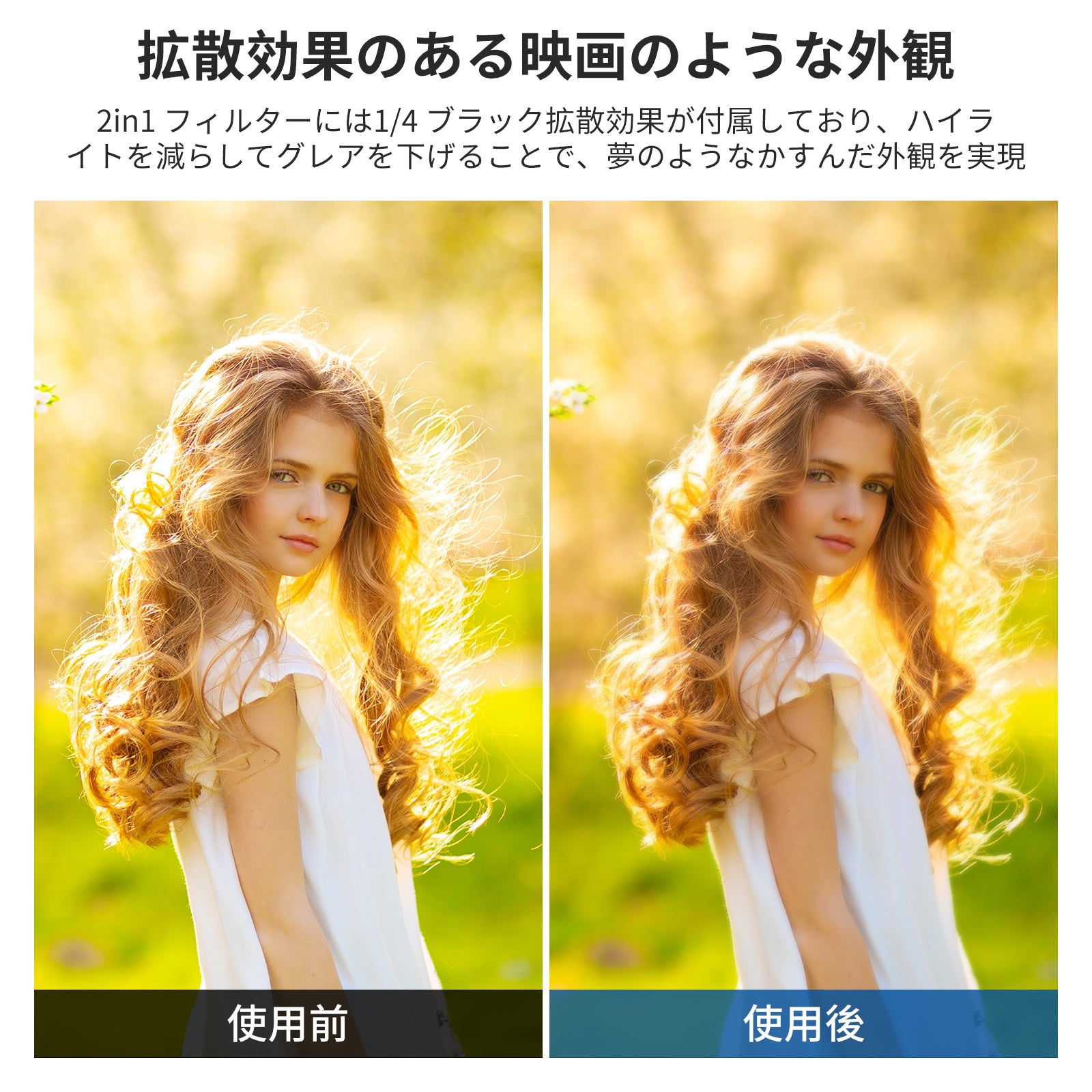 【1/4ブラック拡散による映画効果】このフィルターには黒拡散1/4効果も付いており、ハイライトを減らしてグレアを下げることで、夢のようなかすんだ外観を実現します。ポートレート写真で肌を滑らかに見せます。