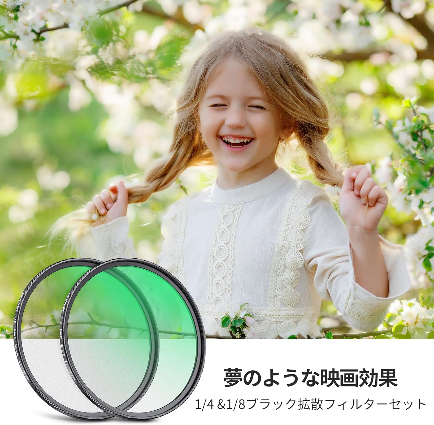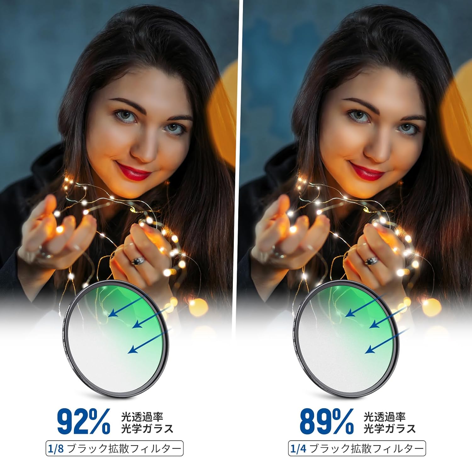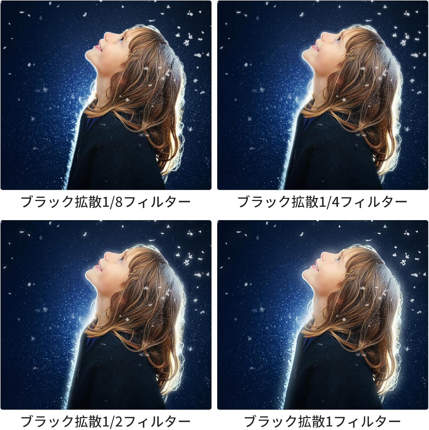 - 【1/4&1/8ブラック拡散フィルターセット】1/4と1/8ブラック拡散フィルターは、滑らかな肌色を実現し、ハイライトを和らげ、まぶしさを軽減し、ポートレート写真、ビデオ撮影、ブログに夢のような、かすんだ、映画効果を作成します。