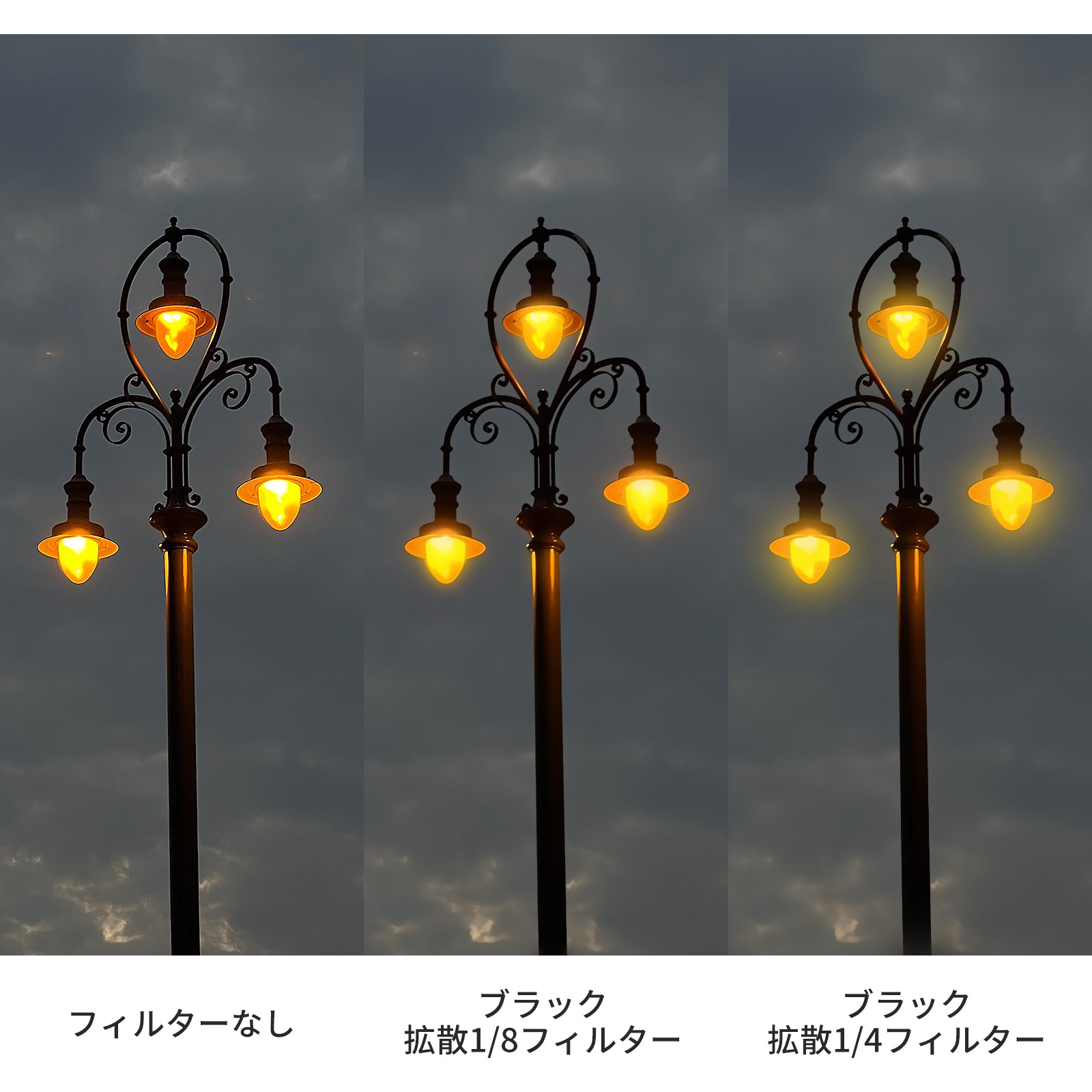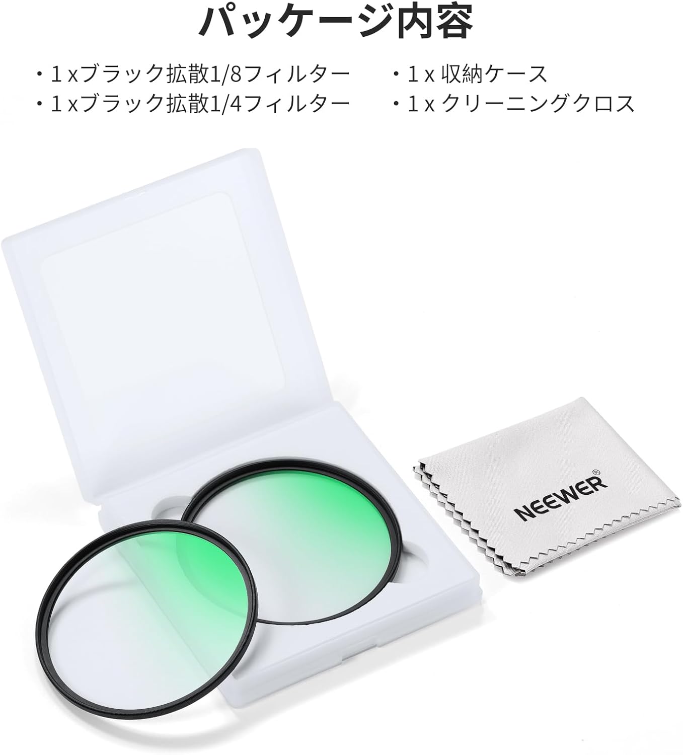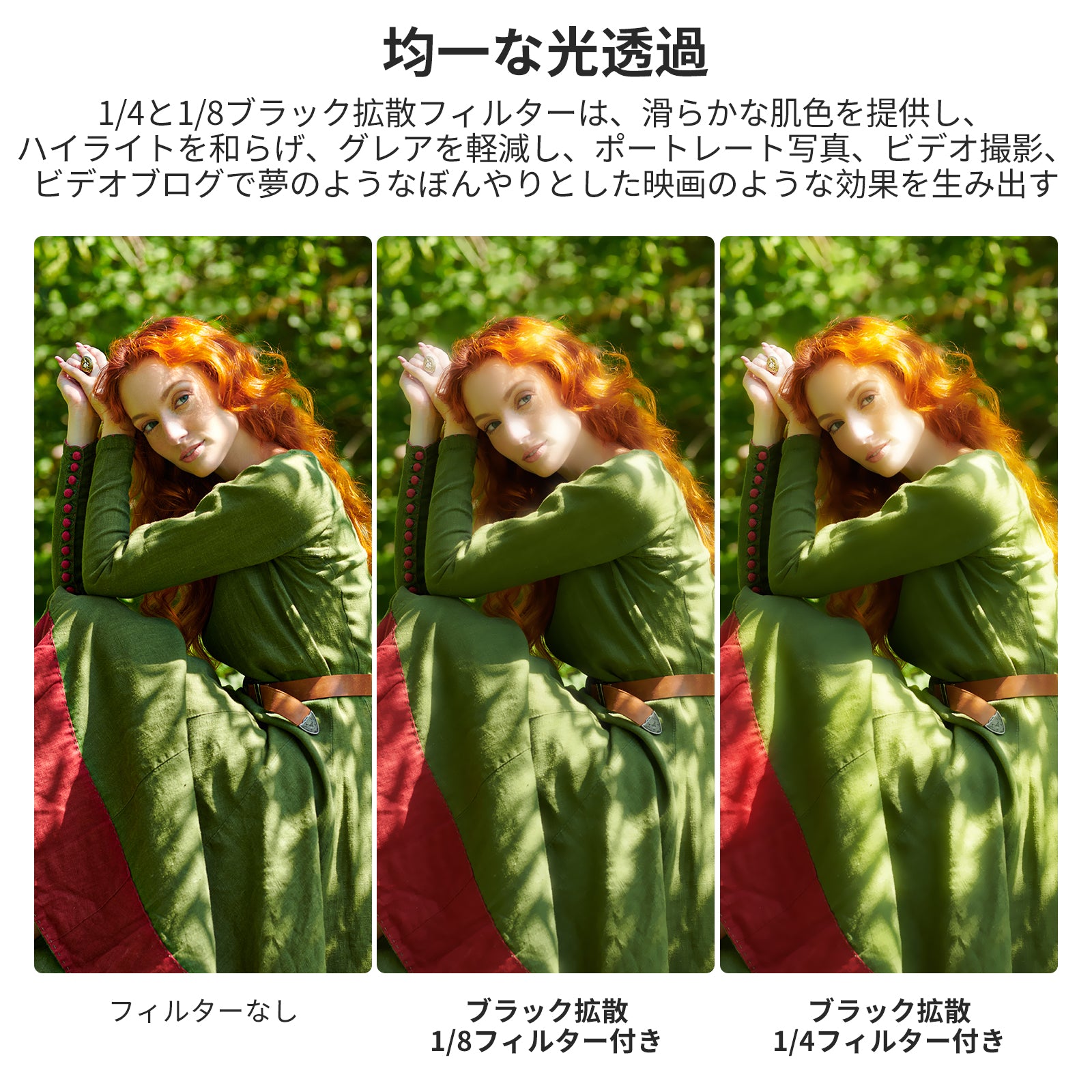 - 【1/4&1/8ブラック拡散フィルターセット】1/4と1/8ブラック拡散フィルターは、滑らかな肌色を実現し、ハイライトを和らげ、まぶしさを軽減し、ポートレート写真、ビデオ撮影、ブログに夢のような、かすんだ、映画効果を作成します。