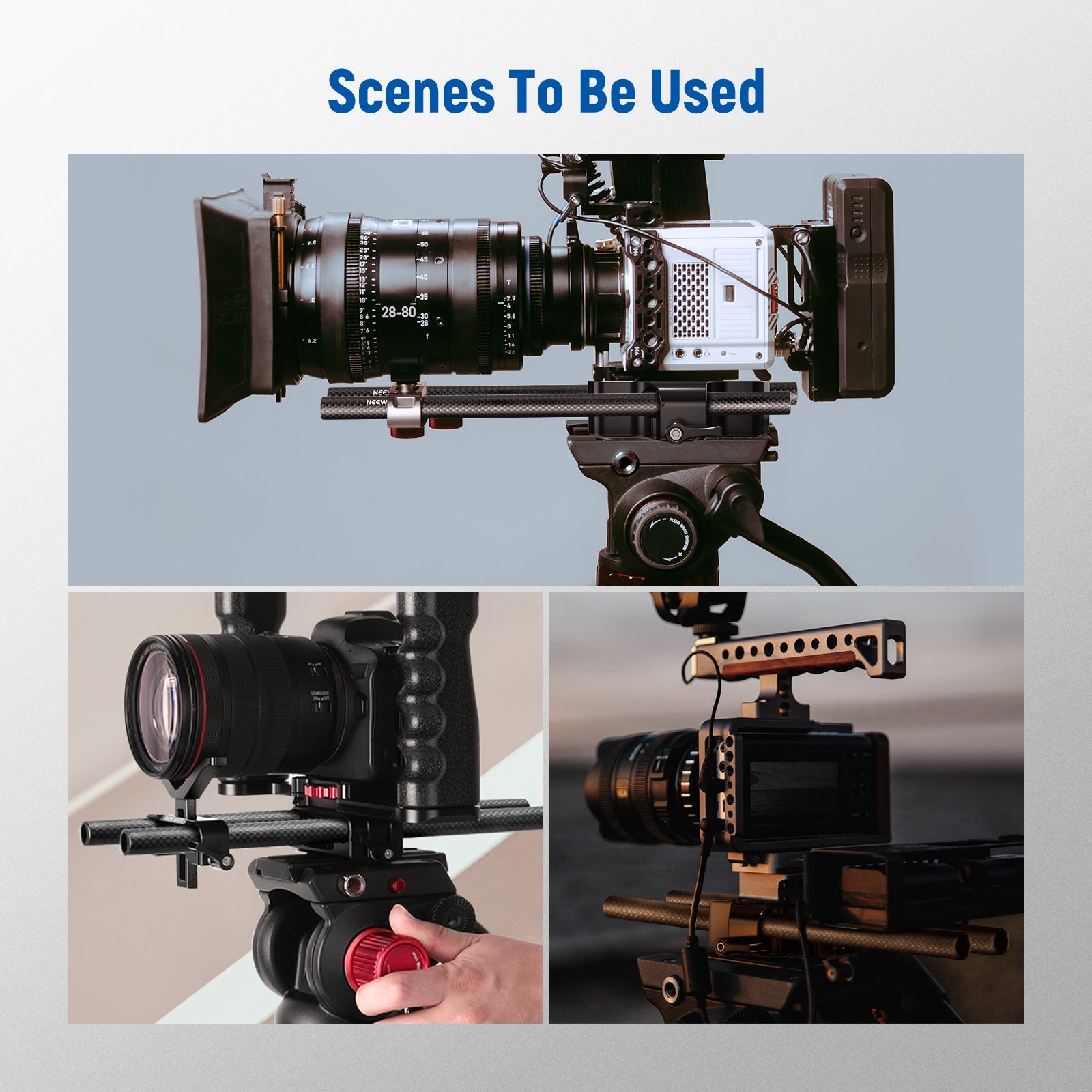 ロッドセットは、標準のレールサポートシステムを備えたショルダーリグ、カメラケージ、ベースプレート、およびロッドクランプに対応します。柔軟でスムーズな配置も可能です。