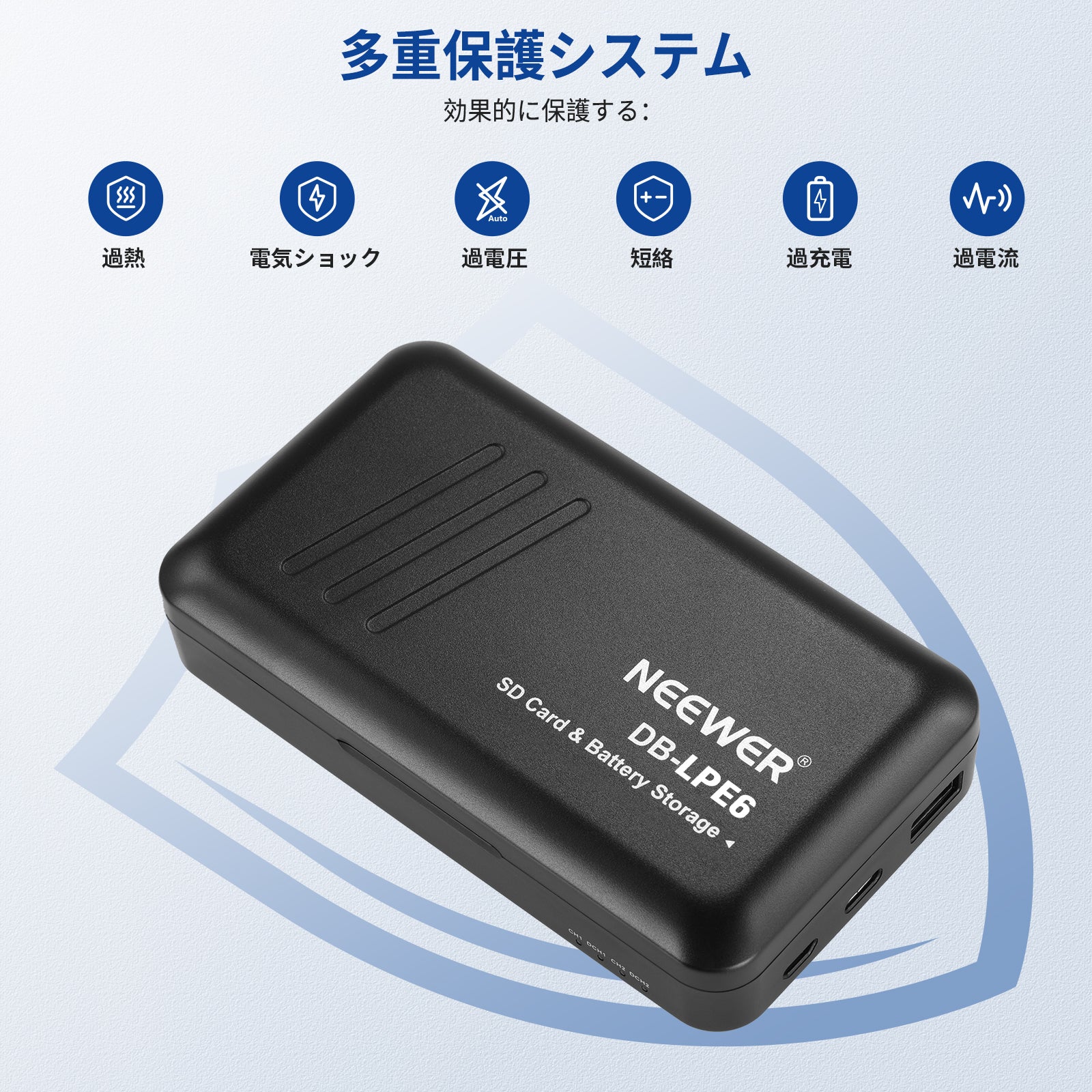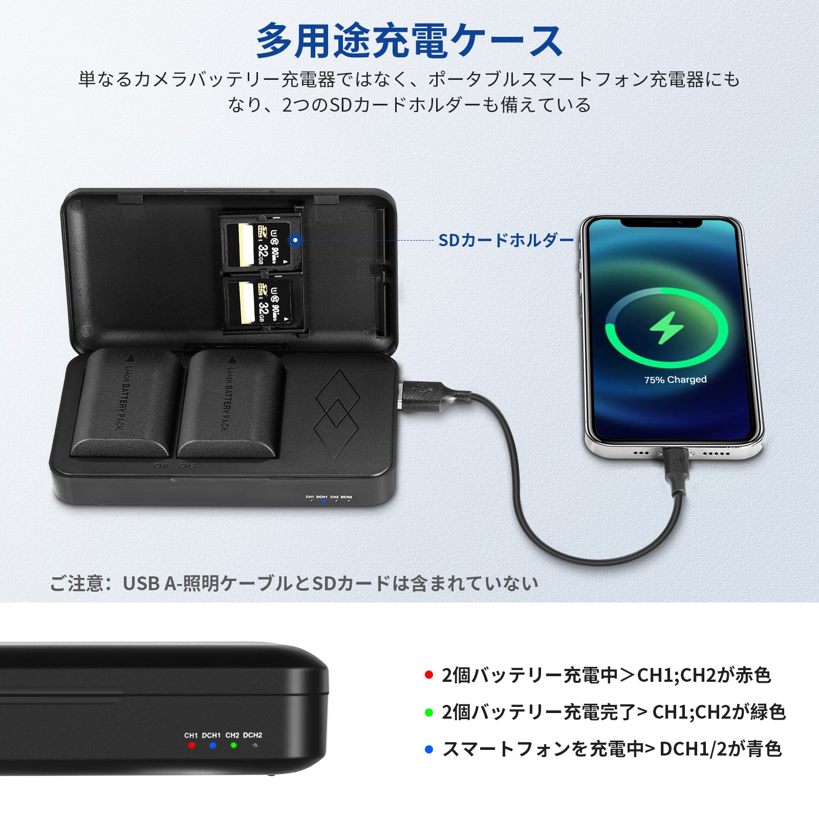 【多用途充電ケース】ただの充電器ではなく、USB充電ケースは2つのバッテリーを同時に充電することができ、衝撃、ほこり、破片からバッテリーを保護するポータブルトラベルケースとしても機能します。また、2つのSDカードホルダーを備えており、バッテリーを内部に取り付けるとスマホポータブル充電器として使えます。