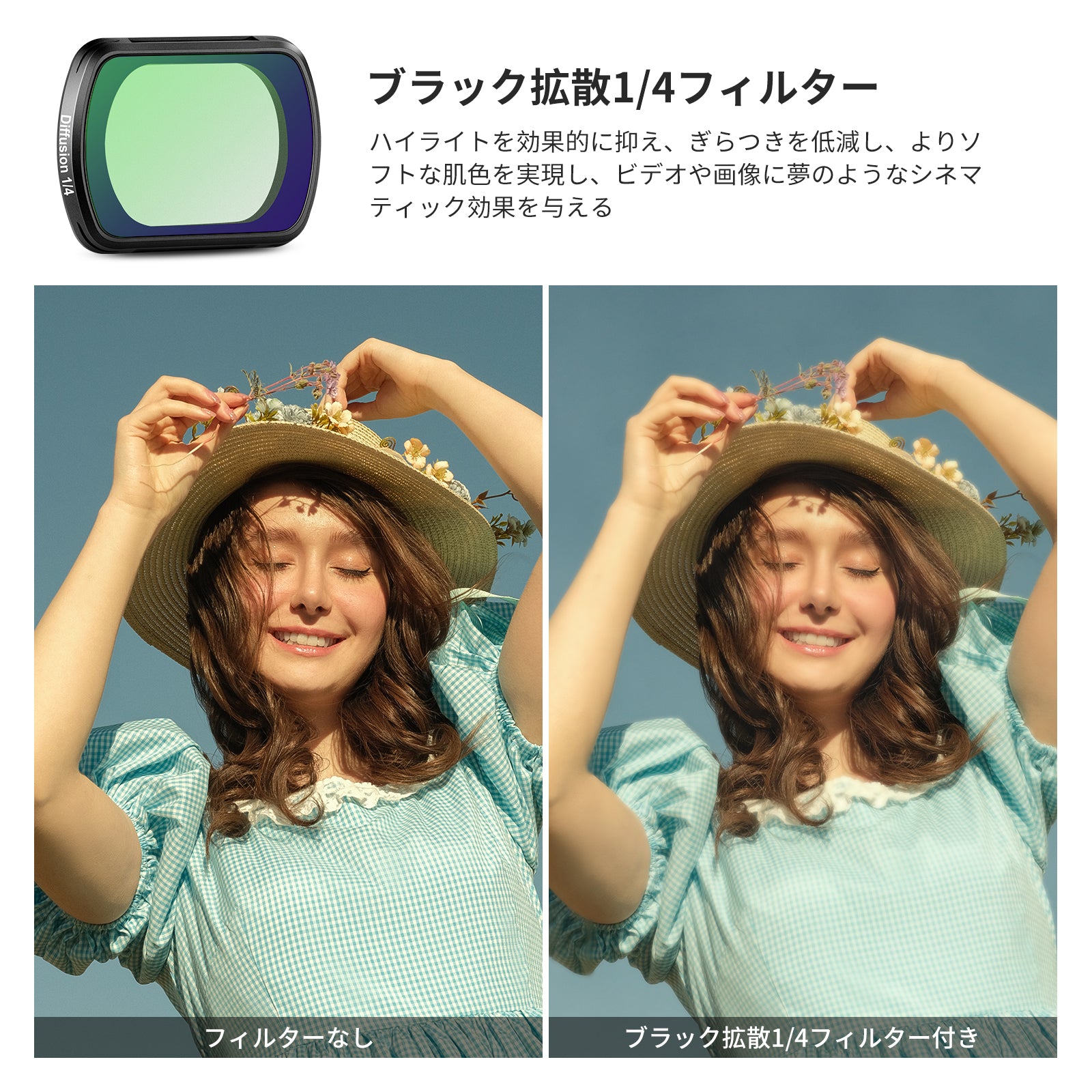 - 【幻想的な映画のような雰囲気と見事な夜景映像】ブラックディフュージョン1/4フィルターは、夢のような映画のような効果で、ハイライトを抑え、眩しさを最小限に抑え、よりかすんで柔らかい外観を実現し、肖像写真、ビデオ、vlogに最適です。光害軽減フィルターは街の明かりによる黄色や緑色を軽減し、被写体のディテールを捉え、適切なコントラストを維持し、露出オーバーを防ぎます。