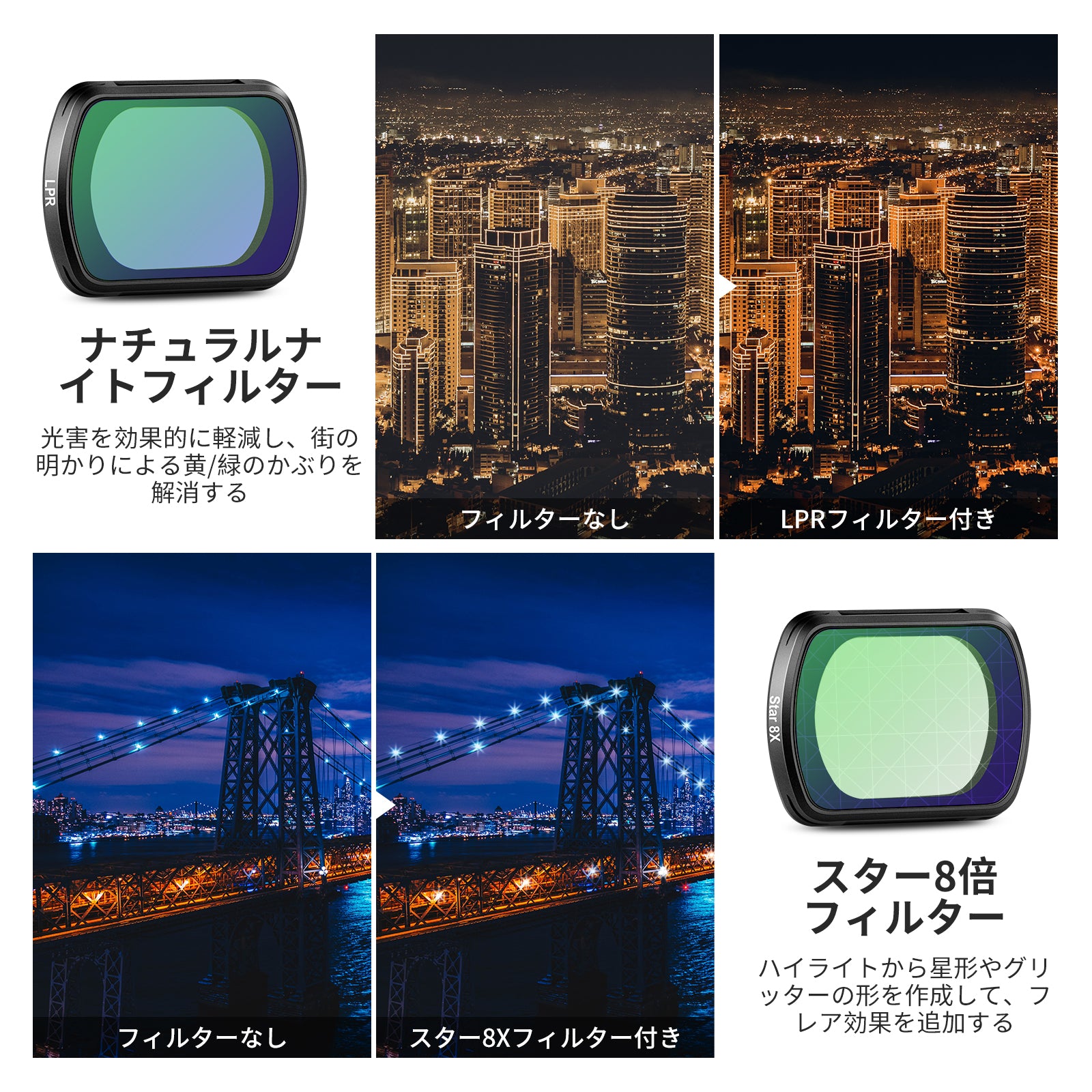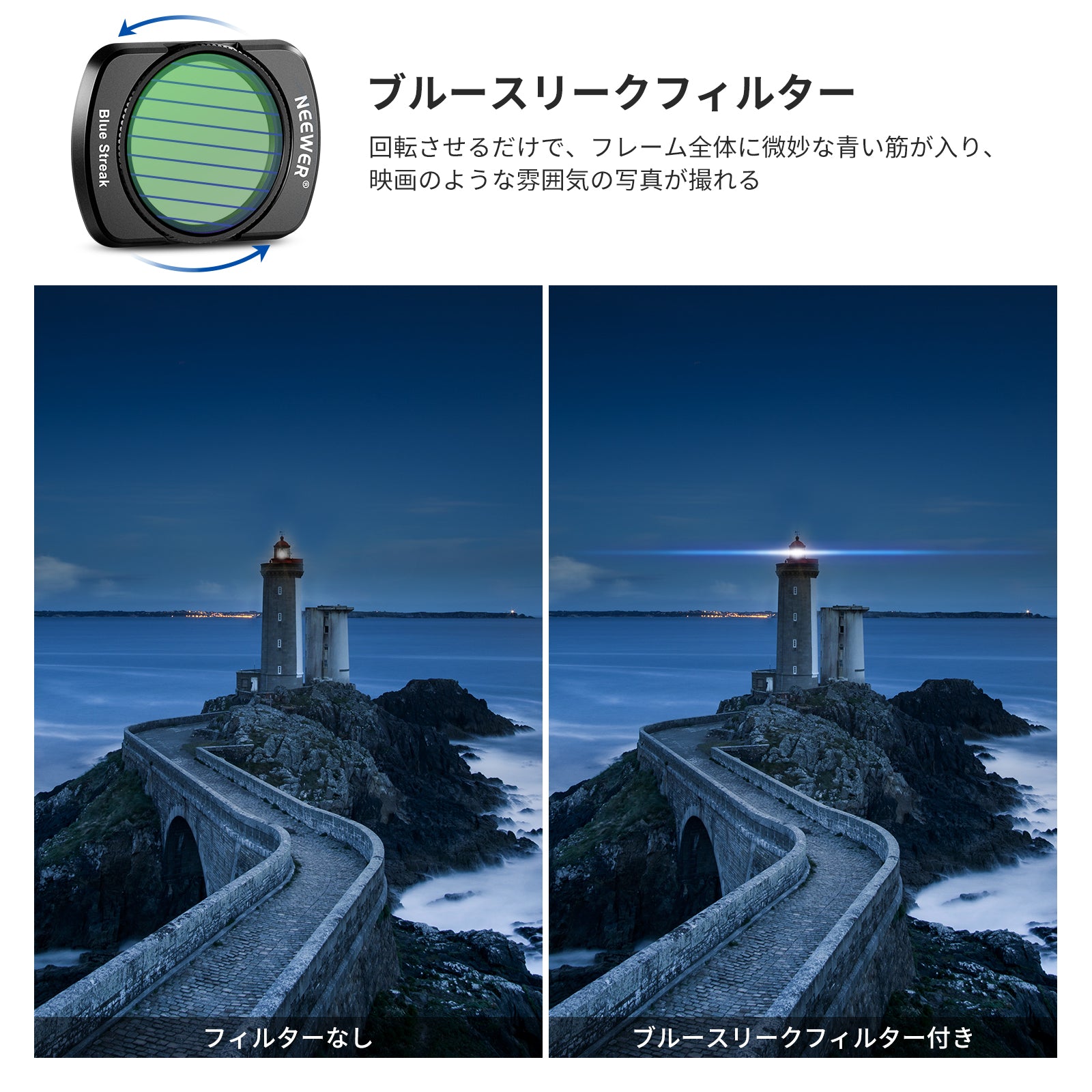- 【アナモルフィックフレア&眩しい星明かり効果】ブルー ストリーク エフェクトフィルターは画像に微妙な青い筋を加え、より映画的な外観にします。8倍スターライトフィルターは、光を回折させて明るいスポットから8ポイントのフラッシュ形状を作り出し、画像のドリーミーな雰囲気を高める特別なフレア効果を加えます。街灯、夜景、宝石、車、ガラス製品などに最適です。