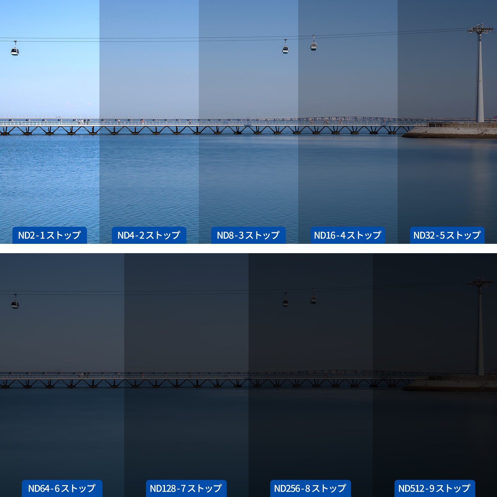 - 【柔軟でバランスのとれた露出制御】 調整可能なND2-32フィルターは、1~5ストップの減光を備え、遅いシャッタースピードと大きな絞りを可能にします。調整可能なND64-512フィルターは、6~9ストップの減光を備え、明るい照明条件に適しています。明るい光でも、滑らかな滝やぼやけた動きのようなクリエイティブな効果を得るために、より長いシャッタースピードを実現します。
