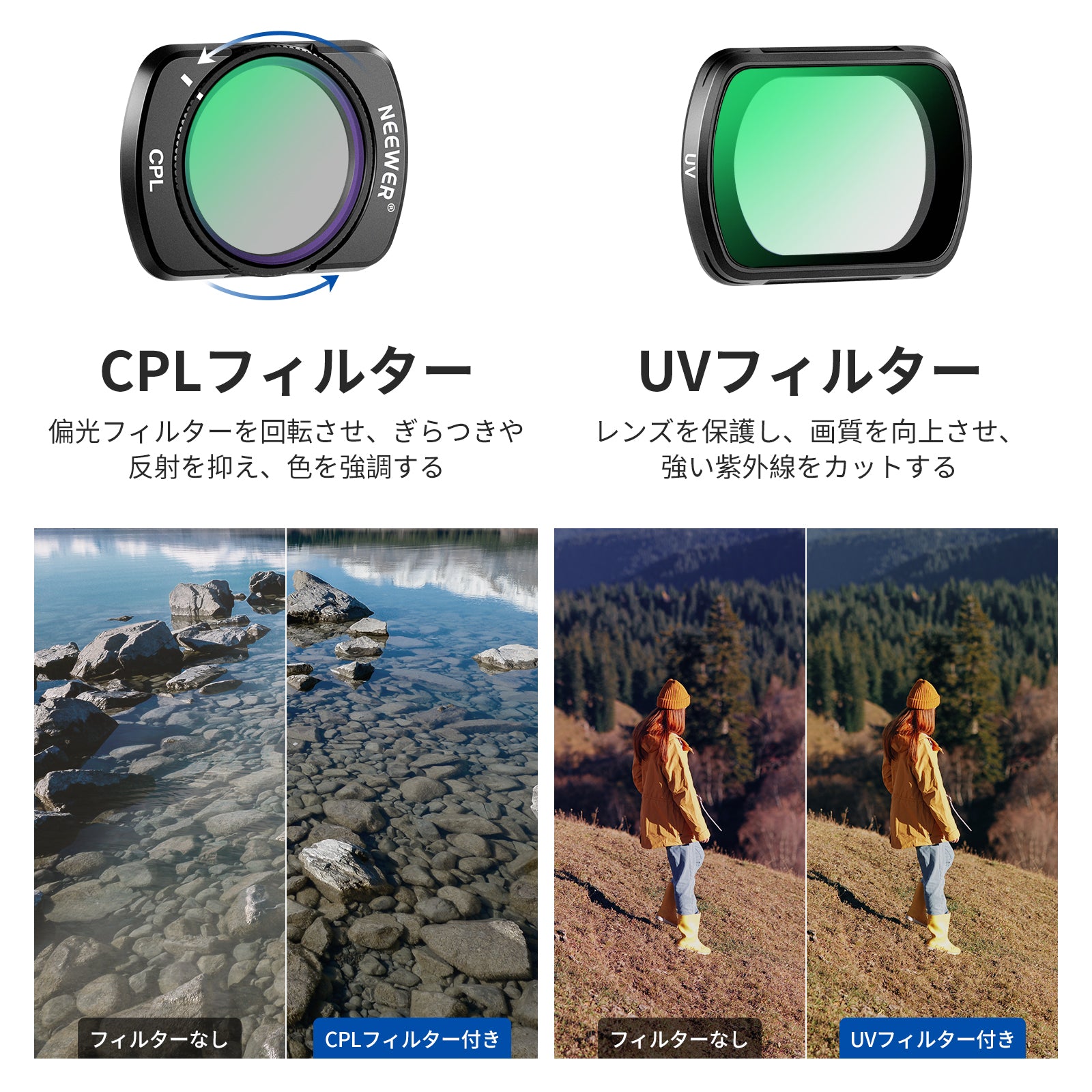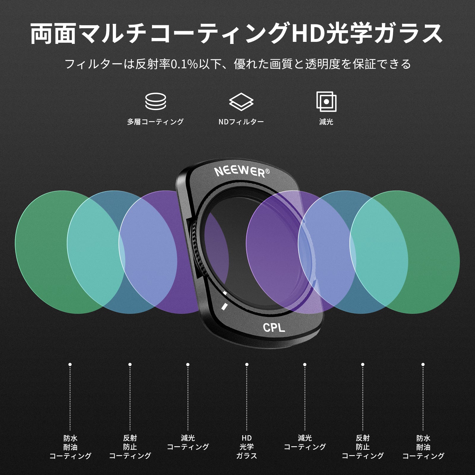 - 【鮮やかな色再現】付属のCPLフィルターで写真に鮮やかさを加えます。水、ガラス、非金属製物体などの表面からのぎらつきや不要な反射を抑え、空撮写真の色と鮮明度を高め、よりシャープで目を引く画像を実現できます。