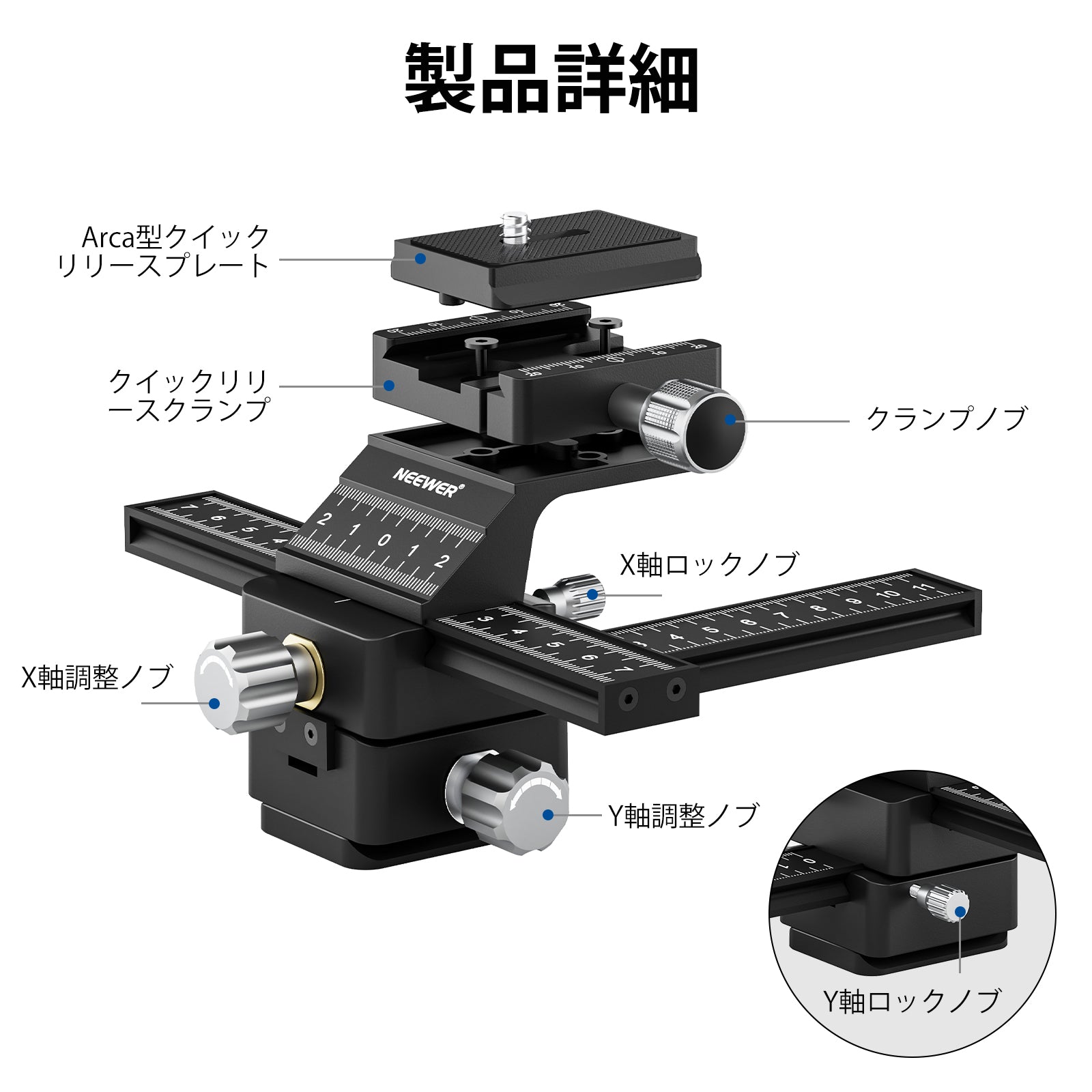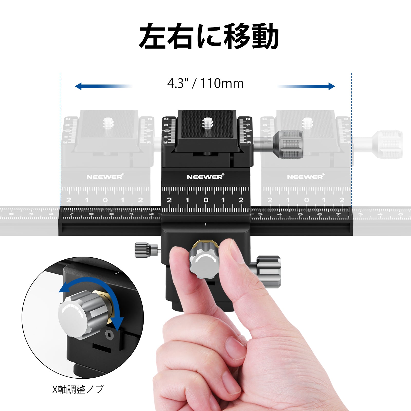 【4方向の精確な移動】4方向動作—左、右、前、後。大きなネジノブは便利な数値スケールを使用して精確な調整を行うことができます。★ご注意★:安定した撮影のために、垂直軸で調整するときは水平調整ノブを締めてください!その逆も同様です!