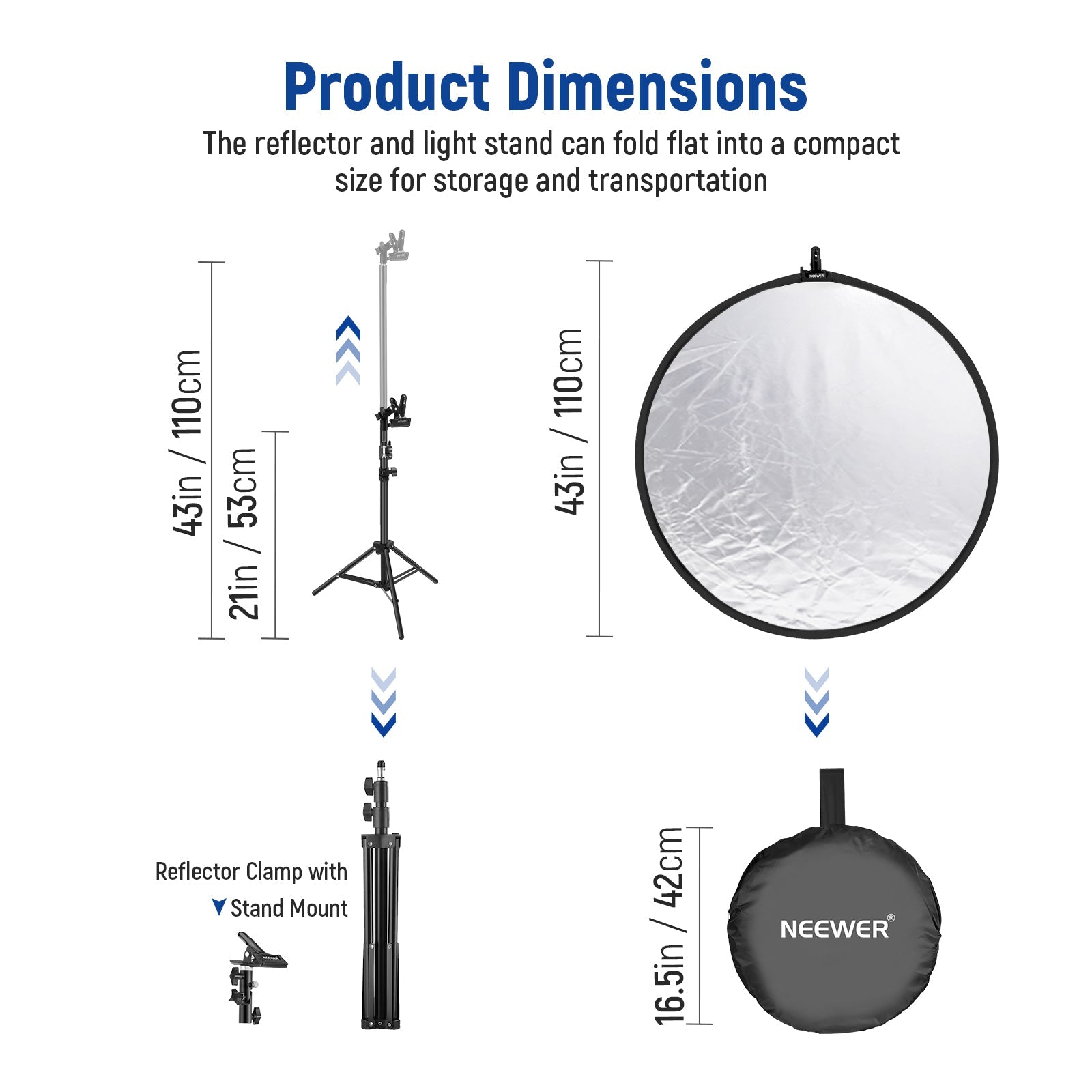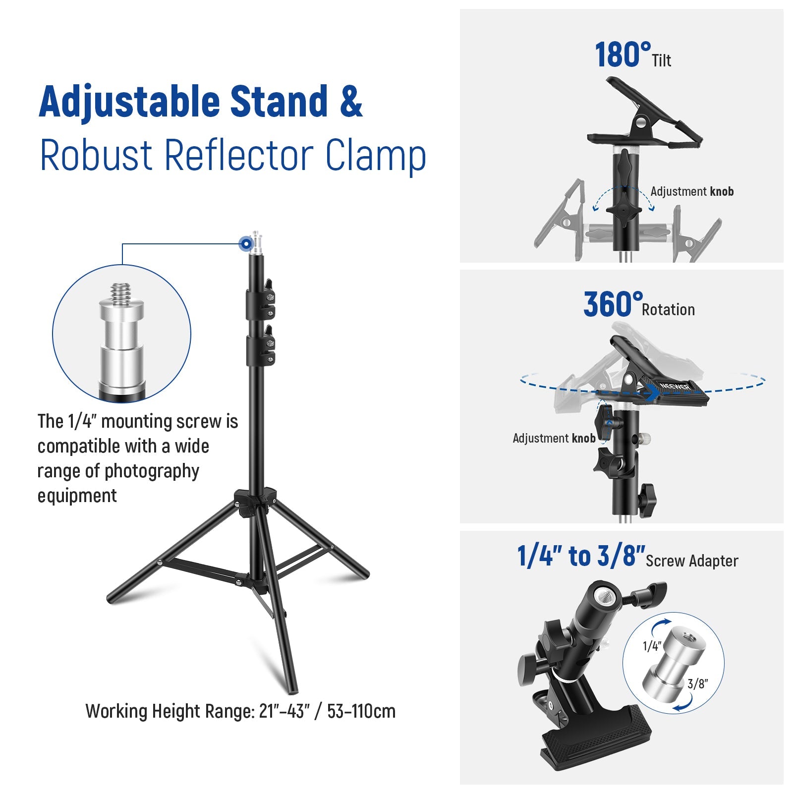【調節可能なスタンドによる信頼性の高いサポート】ミニライトスタンドは、最大43"/110cm、最小21"/53cm、ローアングル撮影や子供の写真撮影に適しています。リフレクターの信頼性の高いサポートを提供し、多くのエネルギーを節約します。 1/4"取り付けネジは、さまざまな写真デバイスに対応できます。