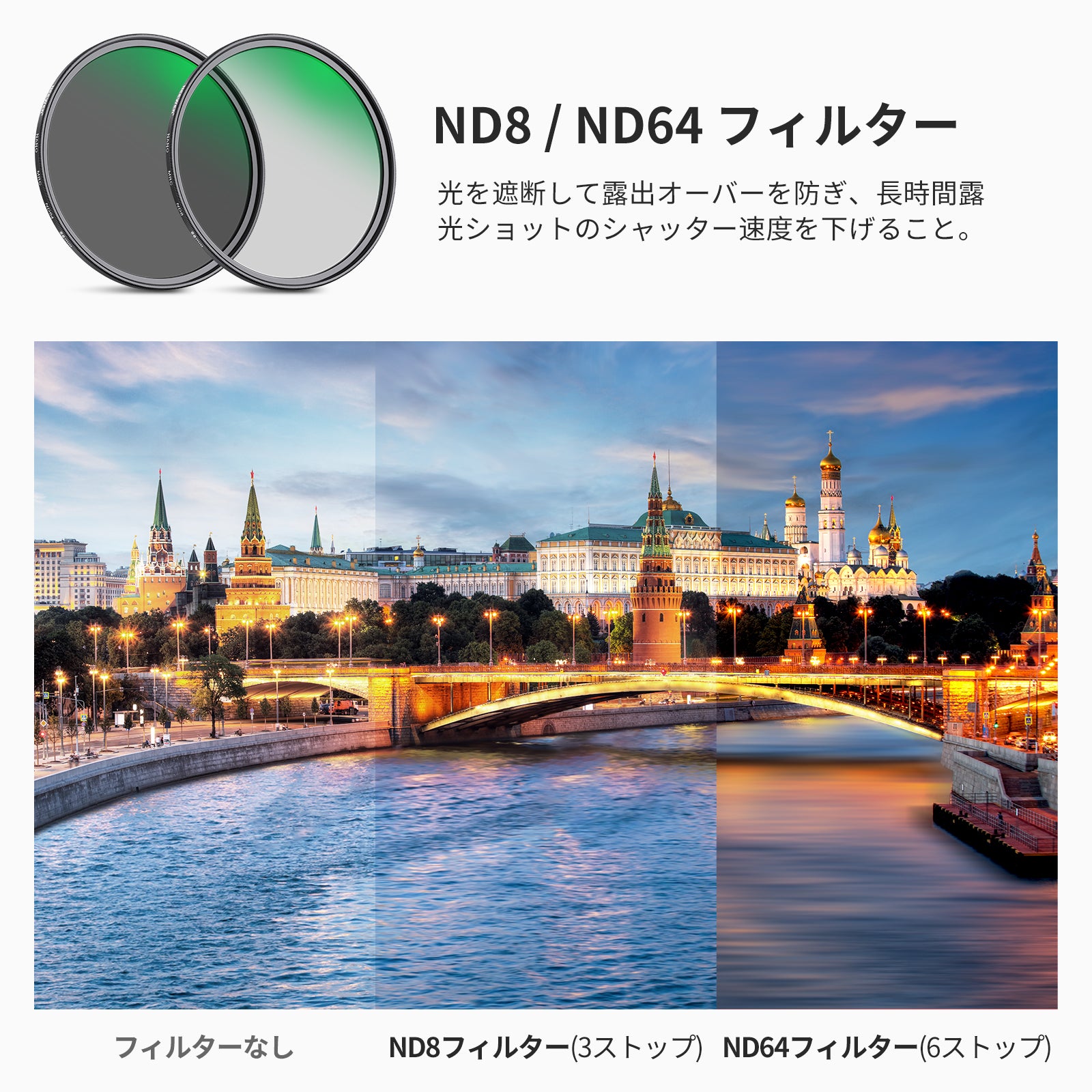 【光と反射を減らす】ND8/ND64 フィルターは、カメラセンサーに入る光の量をそれぞれ3ストップと6ストップ減少させ、長時間露光ショットとモーション ブラーのシャッター速度を低下させます。流水などの風景撮影に適しています。CPLフィルターは鮮やかな色とコントラストをキャプチャし、水やガラス窓からの不要な反射を避け、青い空と白い雲の撮影に最適です。