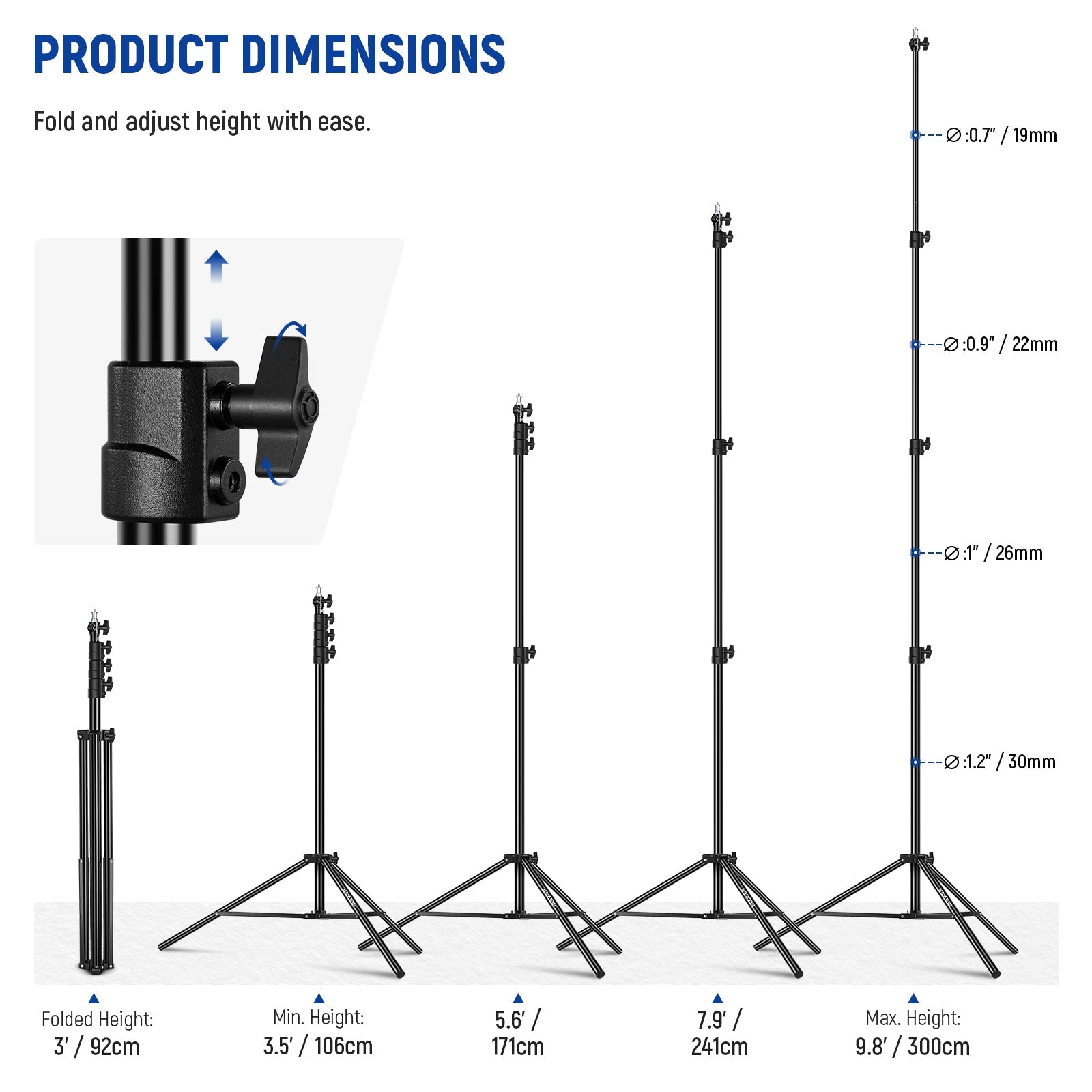 【簡単な高さ調整】4セクションの伸縮式センターコラムを3.5ftから9.8ft(106cmから300cm)まで上げ、金属製のノブで固定することで優れたロック強度を得られます。幅広い高さ範囲により、柔軟なデバイスの配置が可能で、折りたたみ可能なデザインにより、持ち運びや保管が簡単に折りたたむことができます。