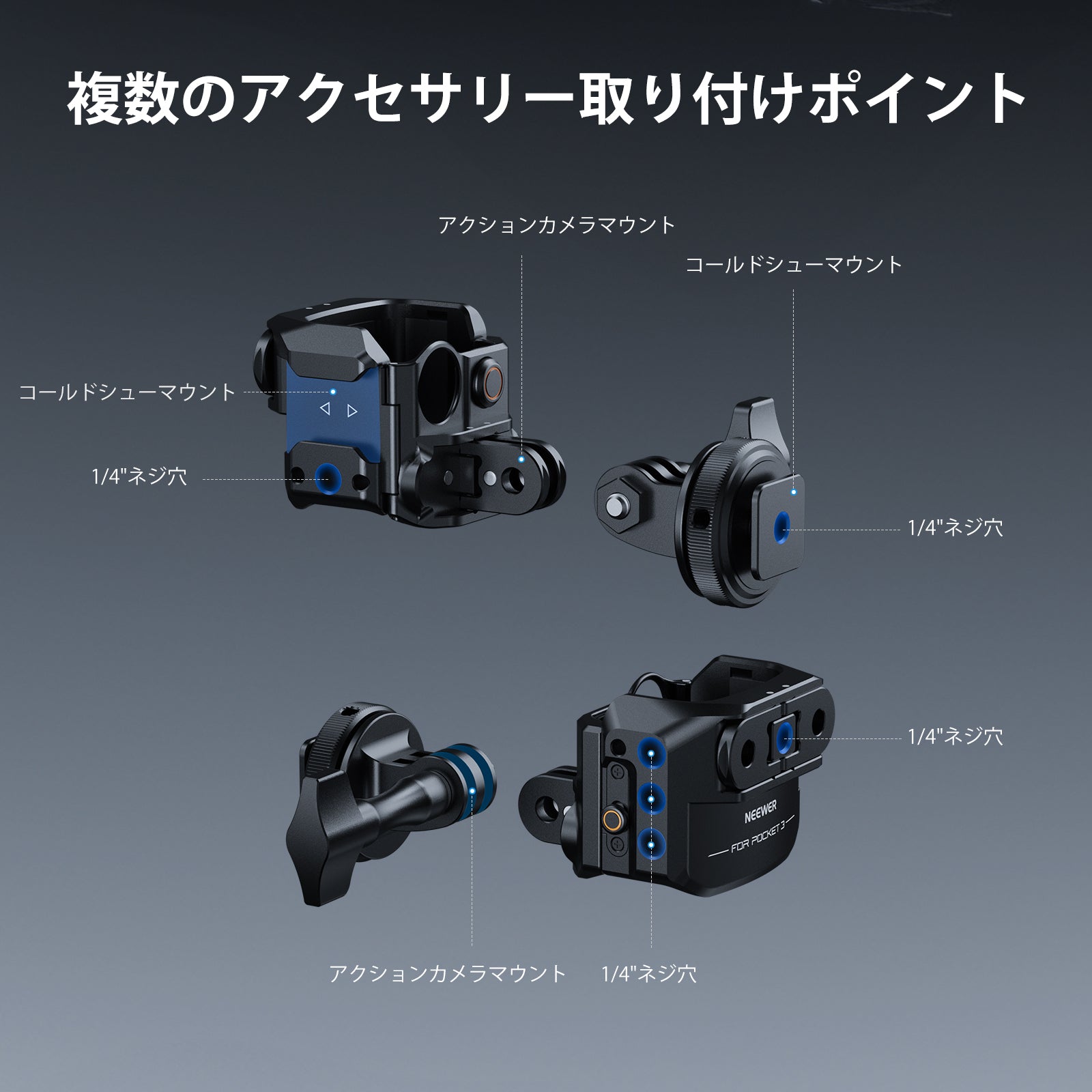 - 【多様なアクセサリ取り付けポイント】1つのコールドシュー、1つのARRI用1/4"ネジ、3つの1/4"ネジにより、マイク(CM14 PRO)、ミニLEDライト(RGB62)、マジックアーム(ST15)、その他のアクセサリーをケージに取り付けることができ、創造性が広がります。