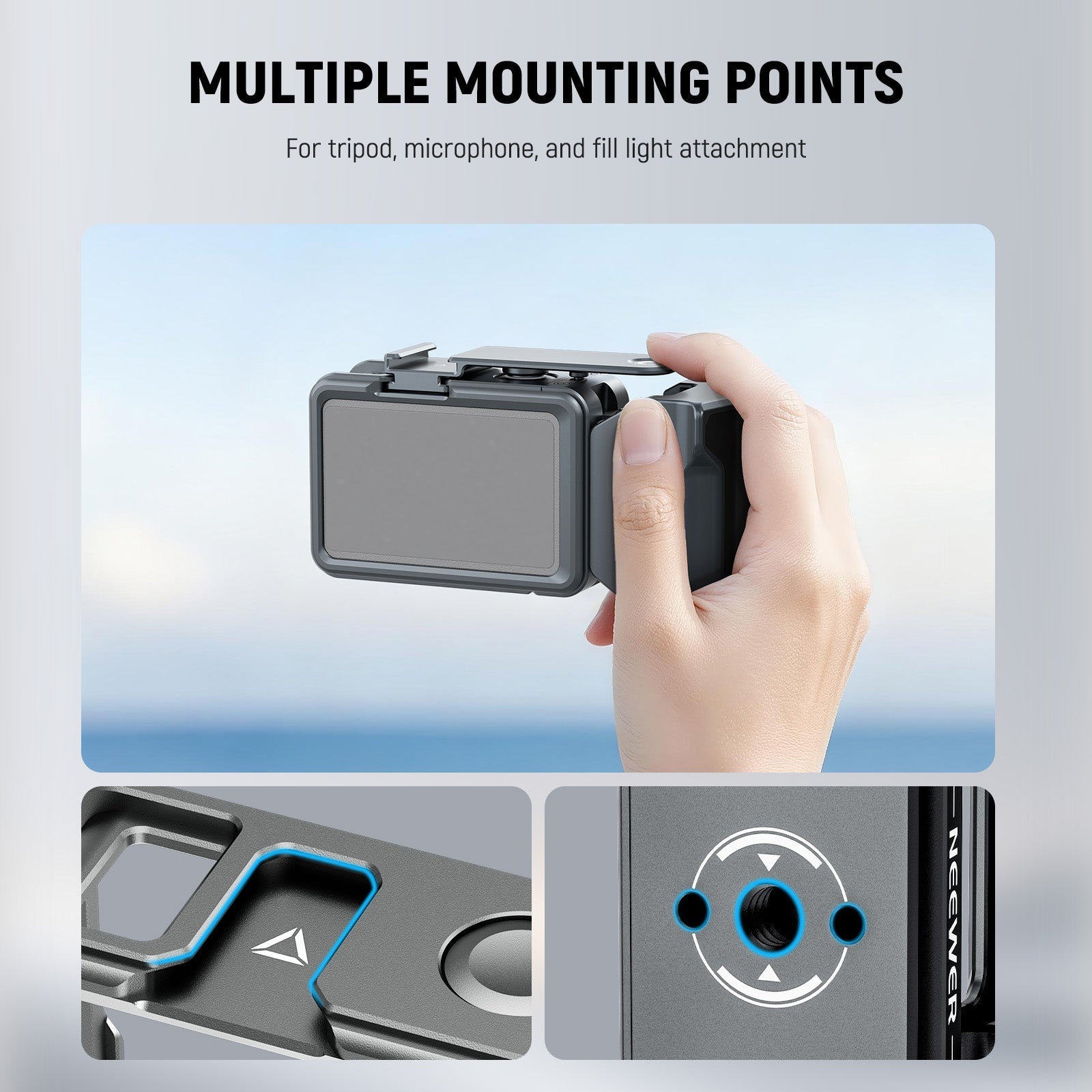 【複数マウントポイント】コールドシューには、小型LEDライト(NL-36AI/RGB61)やマイク(VM10)を取り付けて撮影品質を向上させます。位置決め穴付きの1/4"ネジには、旅行用三脚(TP29)を接続でき、安定した撮影を可能にします。コンテンツクリエイターにとって必要な撮影機材や、インフルエンサーにとって必要なアクションカメラアクセサリーに最適です。