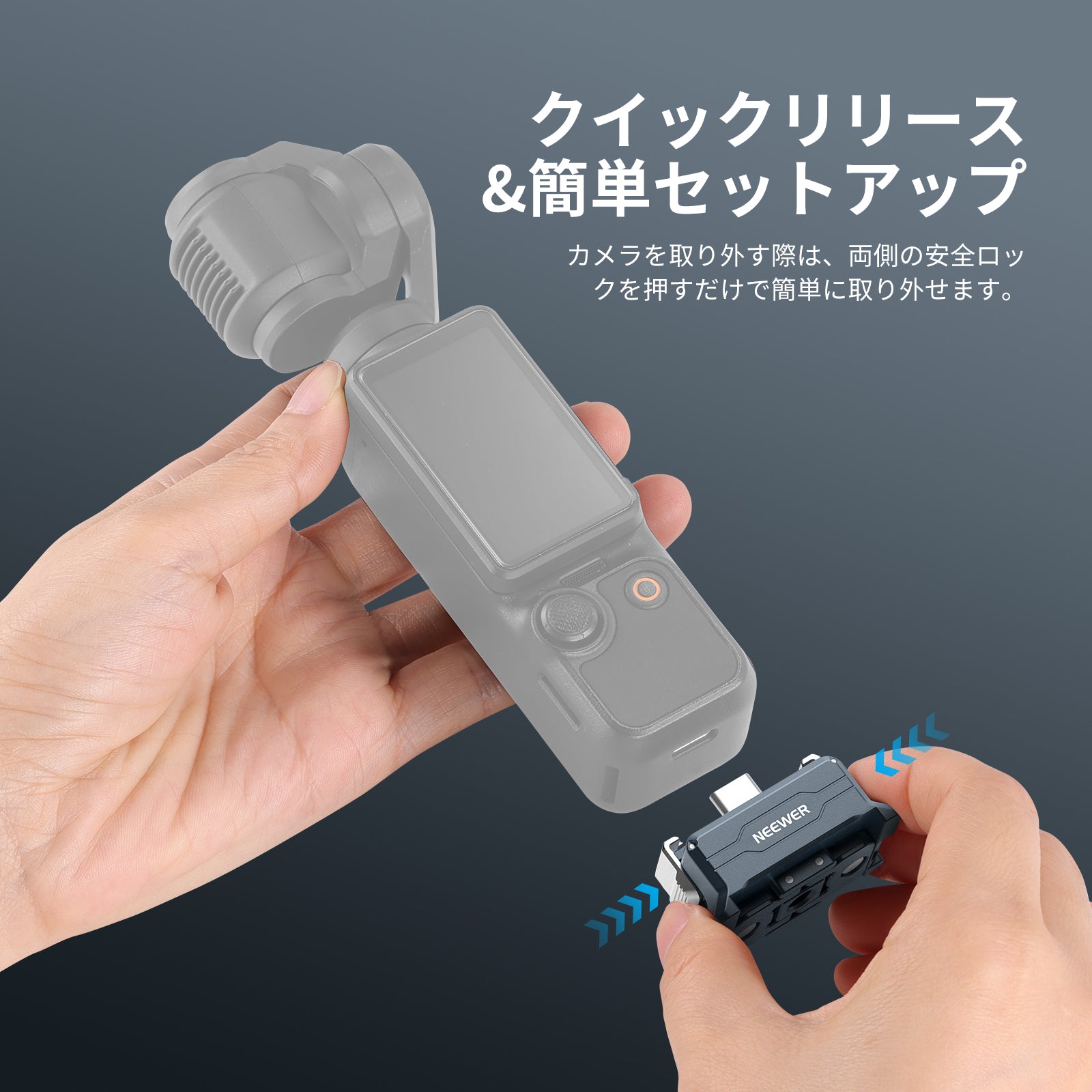 - 【クイックリリース&簡単取り付け】ジンバルカメラをPocket 3ベースマウントにしっかりと取り付けられ、上から押し下げるだけです。カメラを取り外す時は、両側の安全ロックを押すことで簡単に取り外します。