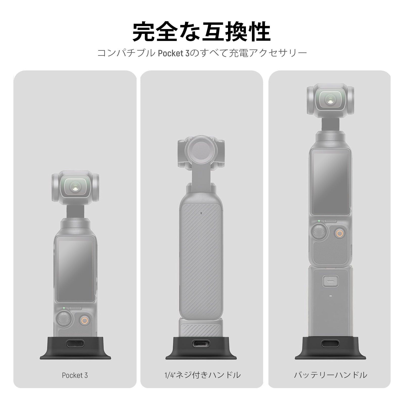 - 【完全アクセス充電】USB Type C充電ポートに完全アクセスでき、充電が中断されることはありません。ご注意: ベースを使用すると、Pocket 3 Creator Comboの特定のアクセサリとの互換性に影響する場合があります。