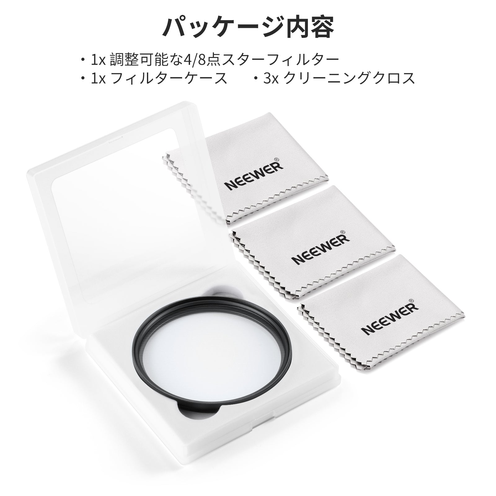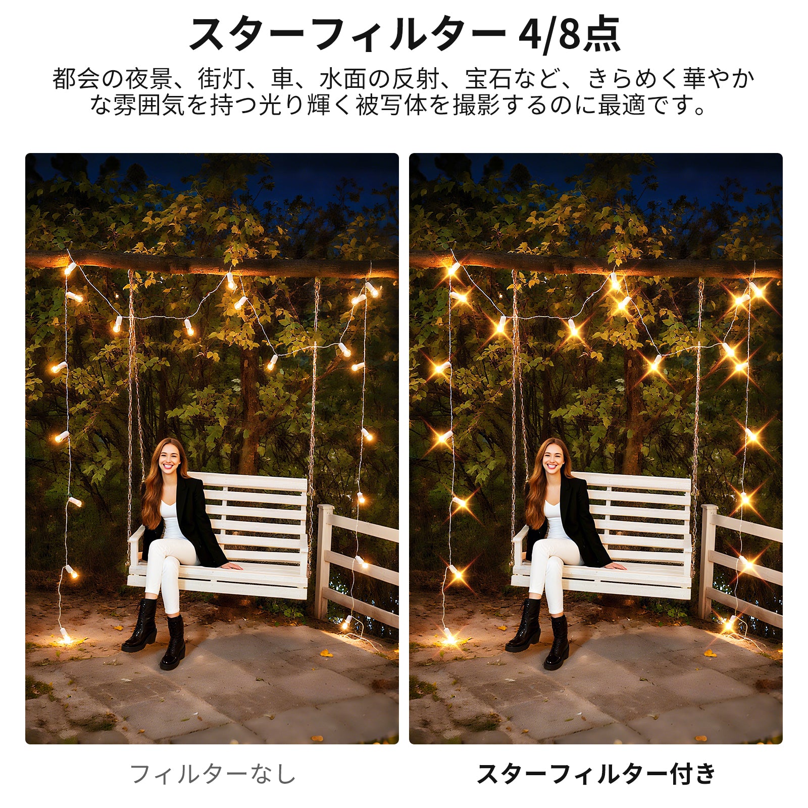 - 【調整可能な4/8点スターフィルター】調整可能なスターフィルターは、回転式外枠を備え、ひねるだけで4点と8点スターライト効果を切り替えられます。ご注意:スター(星形)フィルターは、表面の刻印によって光を回折させ、スターバースト効果を生み出すアートフィルターです。ハイライト部分にフレアやかすみを生じさせることがあり、画像のシャープネスや鮮明さが低下する場合があります。