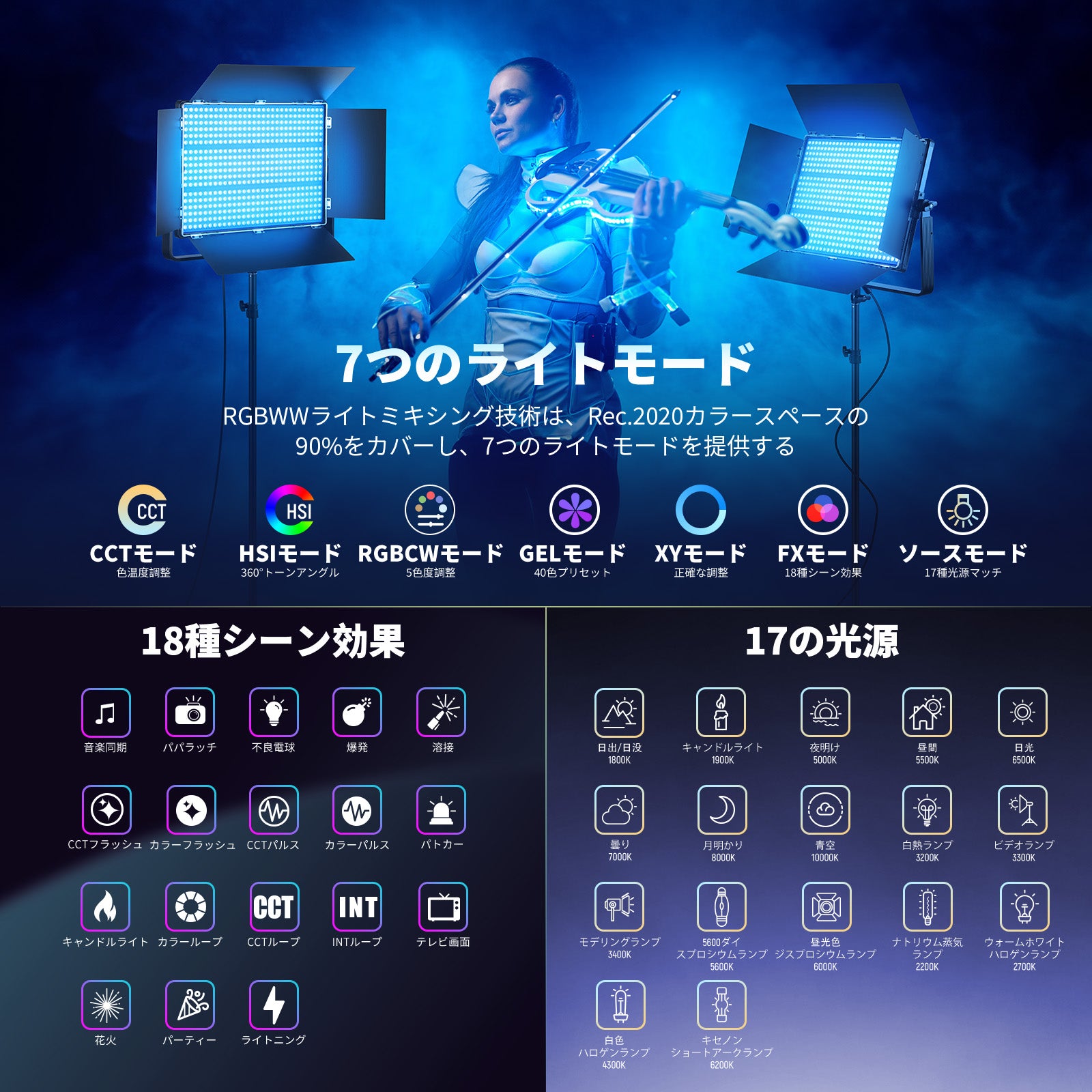 - 【7つの照明モードと正確な調光】RGBと寒色&暖色LEDをブレンドしたパネルライトは、RGBWWミキシング技術により、Rec.2020色空間を90%カバーします。7つの照明モード(CCT/HSI/RGBCW/GEL/FX/XY/SOURCE)があり、FXには18のシーン効果があり、SOURCEには17の光源マッチがあります。PWM技術により、0~100%の範囲で0.1%刻みの正確な調光が可能で、4つの調光カーブが提供され、さまざまな照明設定に適用します。