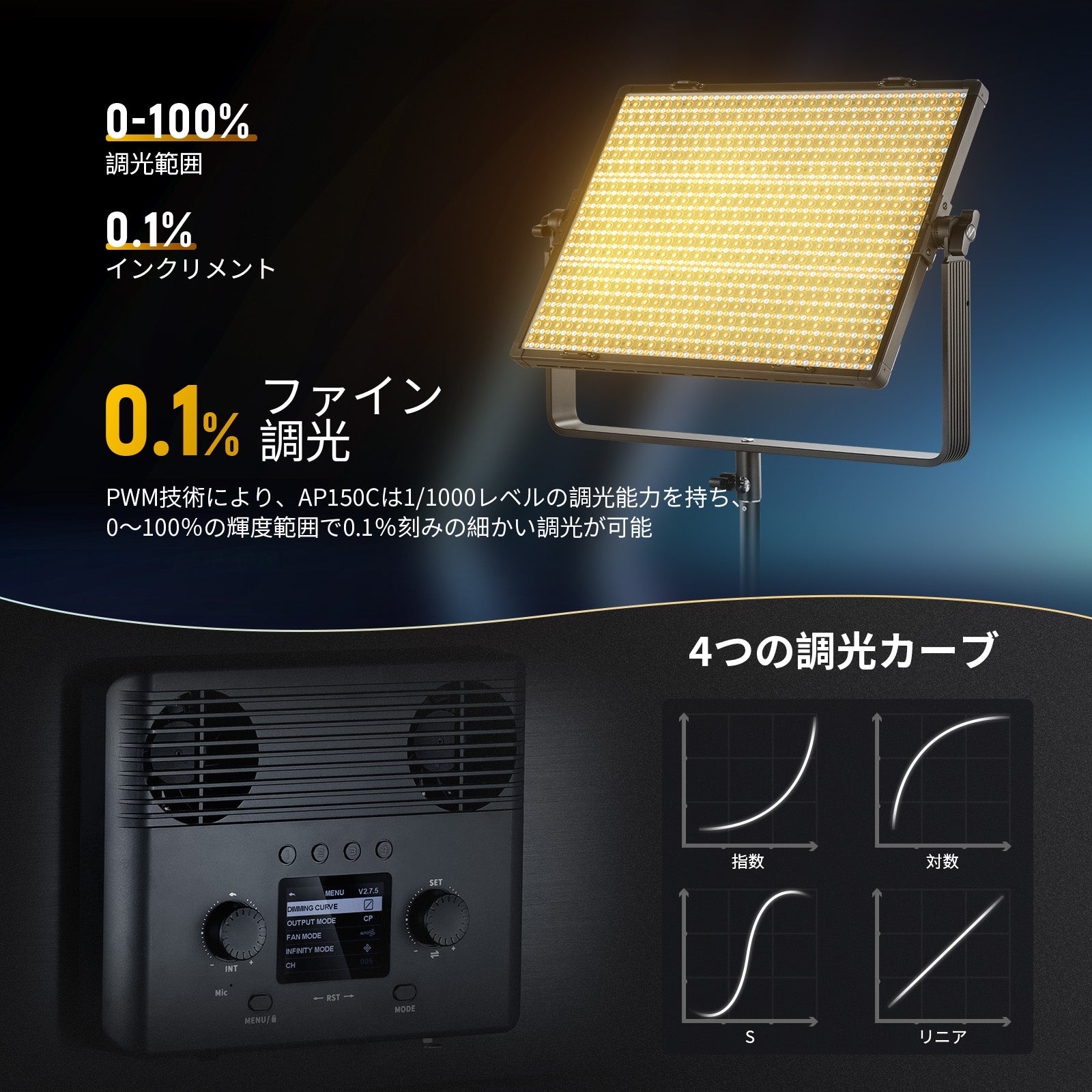- 【プロ用150W RGBパネルライト】AP150Cは先進的なLED光学設計と卓越した光透過率のTIRレンズモジュールを採用し、プレミアムで透過性の高い光を提供します。強力な150W出力と1800個の優れたLEDを組み合わせることで、最大42500Lux/0.5mの比類ない照度を生み出し、96+の高いCRIと97以上のTLCIで真の色を再現します。さらに、2500K-10000Kの範囲で調整することで、暖色と寒色のモードを自由に切り替えることができ、ビデオ、インタビュー、製品、ポートレートなどに最適です。