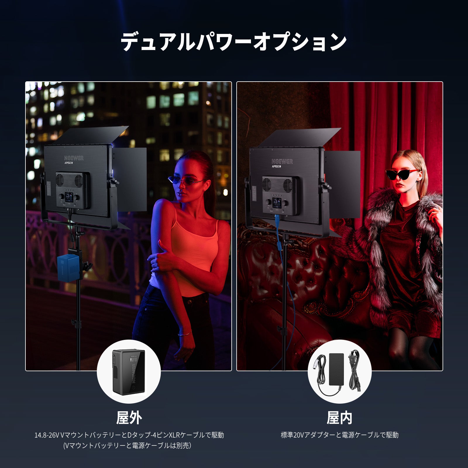 - 【デュアル電源オプション】RGBパネルライトは付属の20VアダプターとAC電源コードでAC電源で動作します。また、コンセントが使用できない場合は、Vマウントバッテリー(14.8-26V)とDタップ-4ピンケーブル(バッテリーとDタップケーブルは別売)を使用して電源を供給でき、屋外での撮影でも安心して使用できます。DCポートはロック式で、使用中の不慮の電源切断を防ぎます。