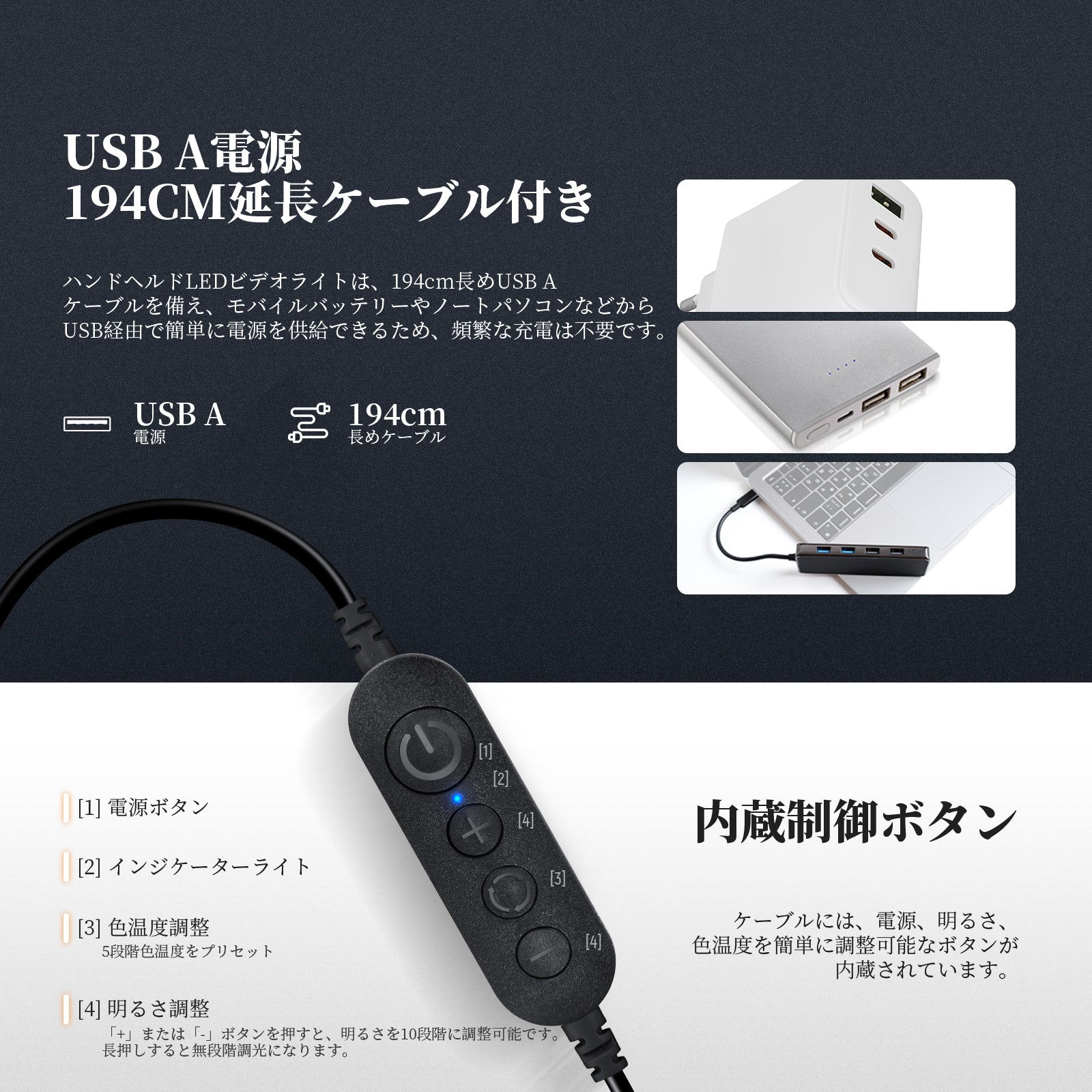 【USB A電源&付属194cm延長ケーブル】ハンドヘルドLED撮影用ライトは、長さ194cmUSB Aケーブルを備え、ポータブル充電器やノートパソコンなどからUSB経由で簡単に電源を供給でき、頻繁に充電する必要はありません。延長ケーブルにより、照明の設置場所や移動の自由さが高まり、ケーブルはボタンが内蔵されており、電源、明るさ、色温度を簡単に調整可能です。ポータブルキャリーバッグが付属し、すべてのアクセサリを収納し、持ち運びに便利です。