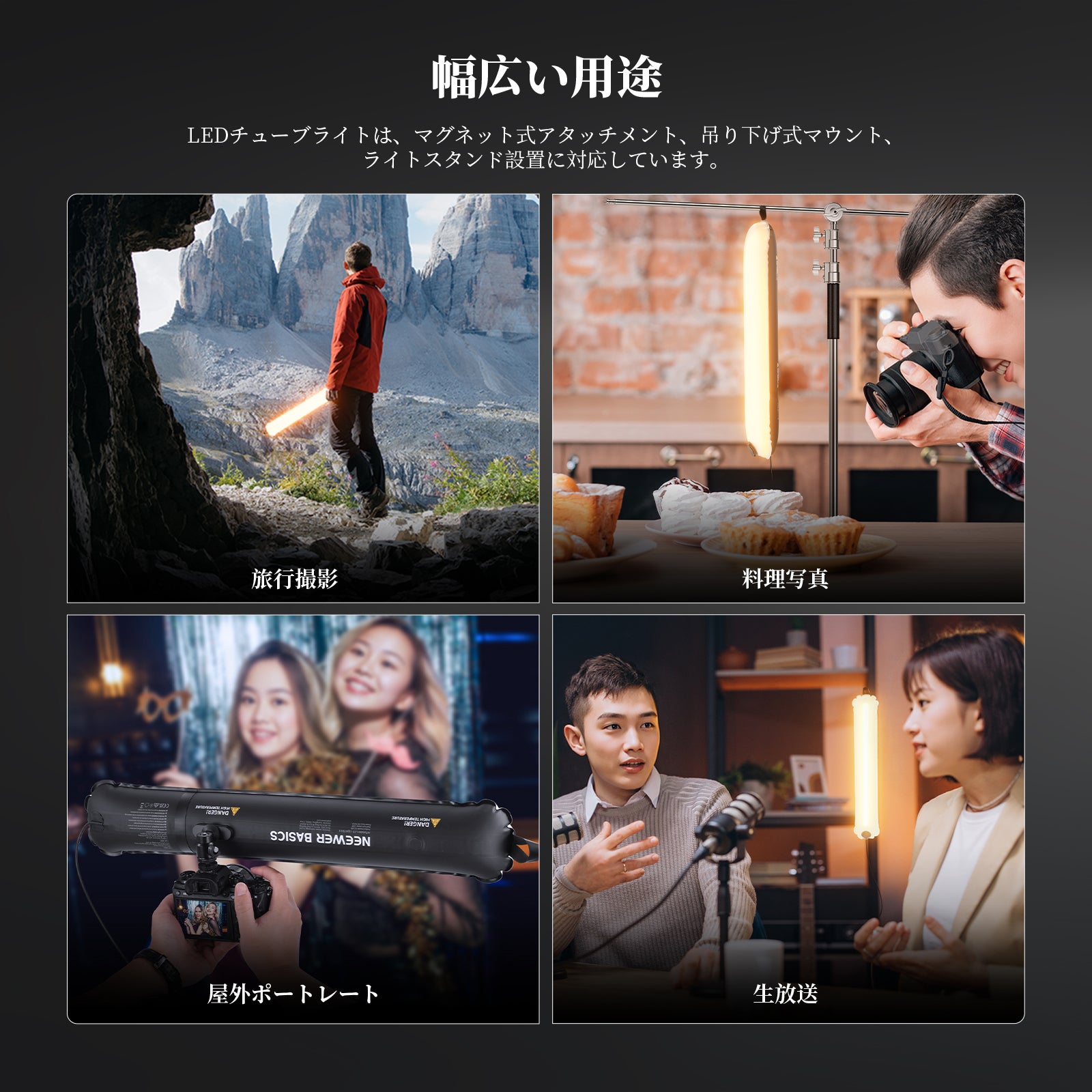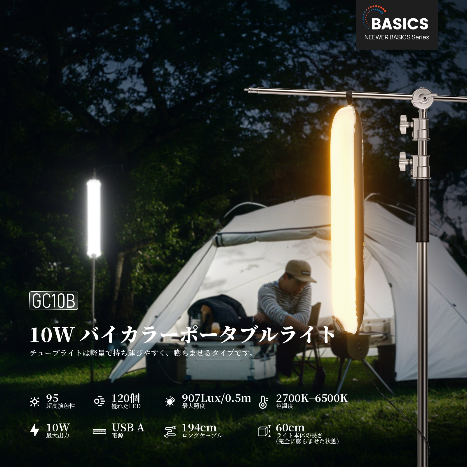- 【NEEWER BASICS シリーズ】NEEWER BASICS シリーズは、シンプルで実用性に優れたシリーズで、基本的な機能と設計に基づいて、不要な追加機能や素材がありません。GC10Bチューブライトは軽量で持ち運びに便利で、シェルはTPUとシリコンで作られ、信頼性が高く、柔らかく耐摩耗性があり、内部LEDと電子部品を傷や損傷から保護します。ハンドヘルドLEDライトは、インフレータを使って膨らませるだけで、素早く着脱式できます。