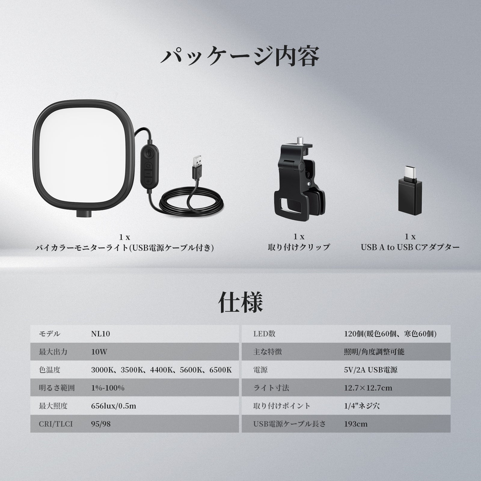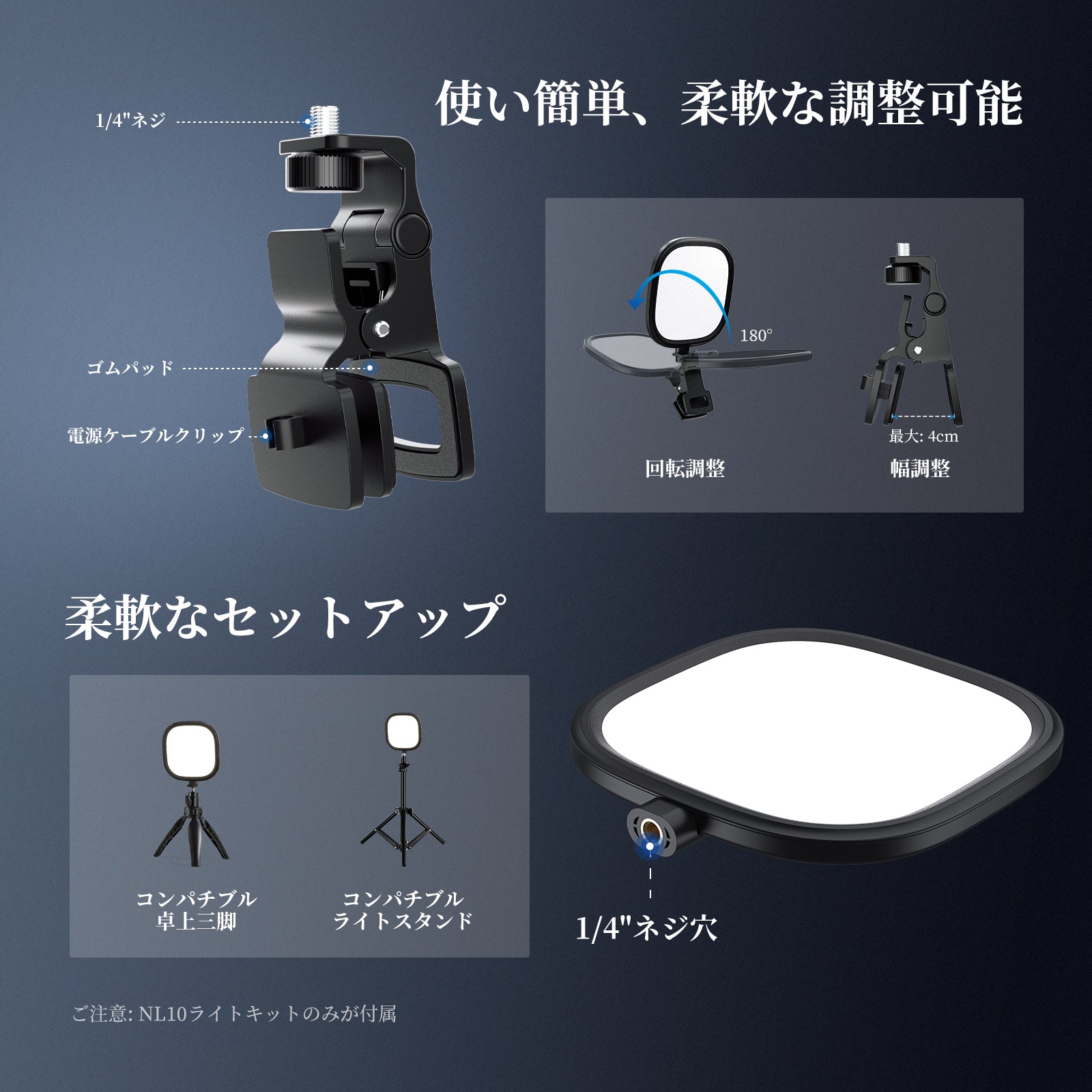 【使いやすい】NL10 LEDパネルライトは、全長193cmの電源ケーブルを備え、ディスプレイやノートPC、モバイルバッテリーなどから簡単に給電可能。モニターへの取り付けはクリップで簡単に固定でき、オーバーヘッド照明としても活用できます。写真・動画撮影はもちろん、日常の連続照明にも最適。ソーシャルメディアコンテンツ制作に欠かせない照明アイテムとして、ストリーマーやインフルエンサーにもおすすめです。ライトヘッドは前後180°・水平360°回転し、柔軟に照明を実現します。ご使用中何かご質問がございましたら、お気軽に弊社のカスタマーサポートまでお問い合わせください。